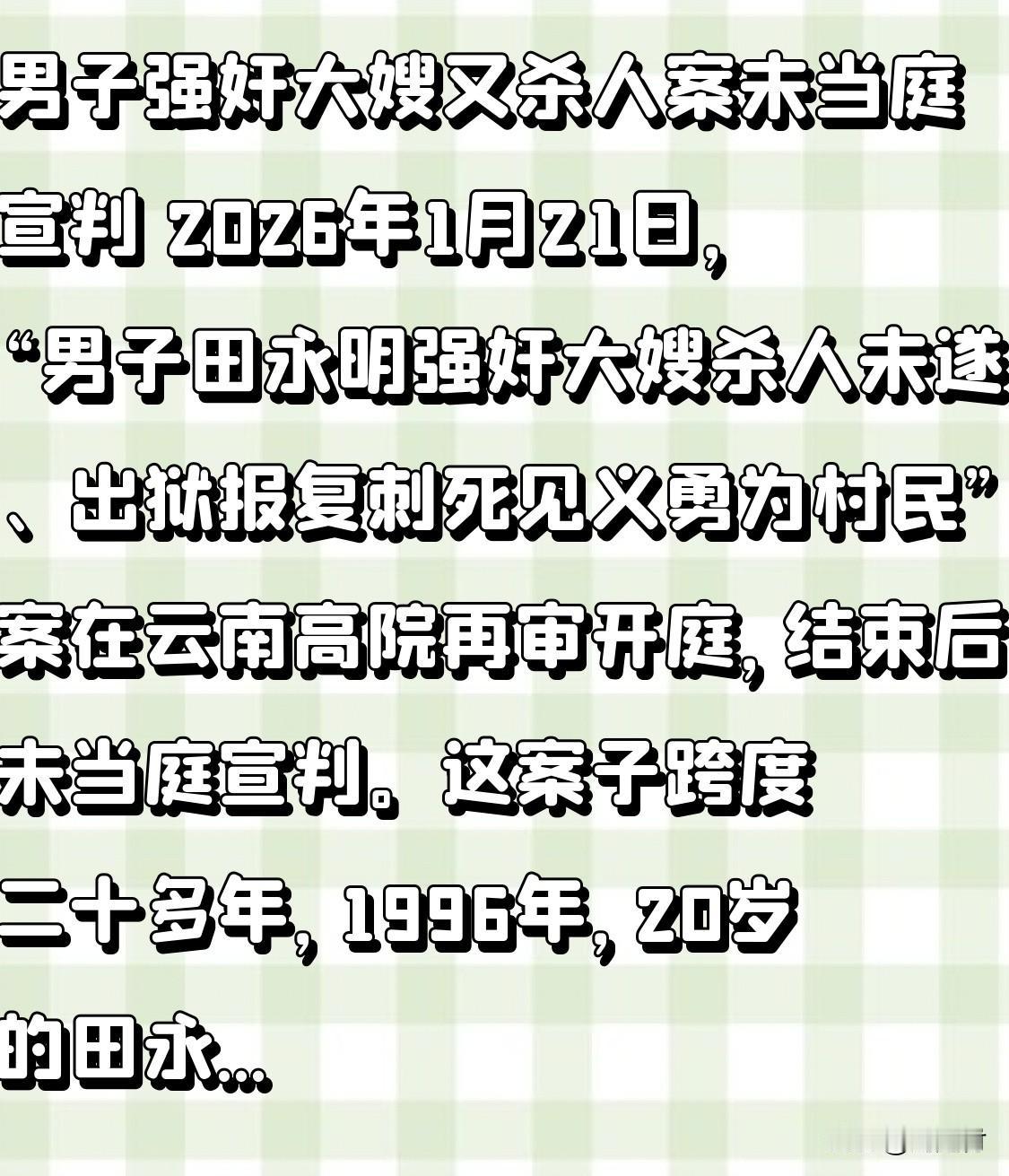 男子强奸大嫂又杀人案未当庭宣判 2026年1月21日,“男子田永明强奸大嫂杀人未遂、出狱报复刺死见义勇为村民”案在云南高院再审开庭,结束后未当庭宣判。这案子跨度二十多年,1996年,20岁的田永明强奸大嫂还试图杀人,获刑9年。2002年减刑出狱不久,他又报复大嫂,刺死劝阻的村民,致大嫂轻伤。2022年他被抓。一审他被判死缓,他不服上诉,二审维持原判后法院决定再审。受害者家属律师称,高院认为原审量刑不当、法律适用有误。而田永明及其律师对罪名认定有不同看法。希望法律能给出公正判决,告慰受害者。刺死 劝阻的村民,还无死罪,什么情况?