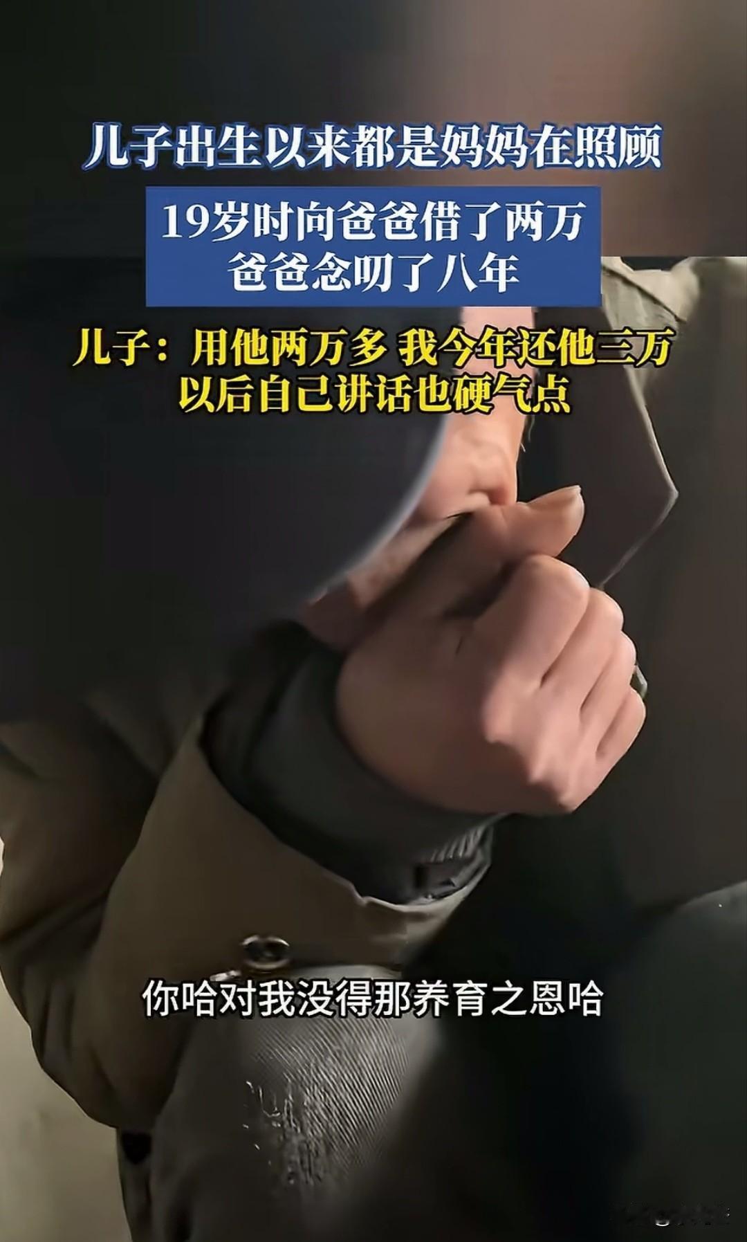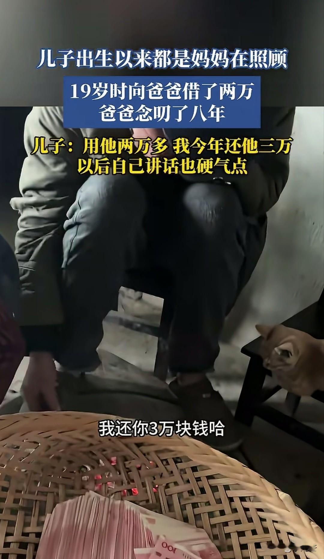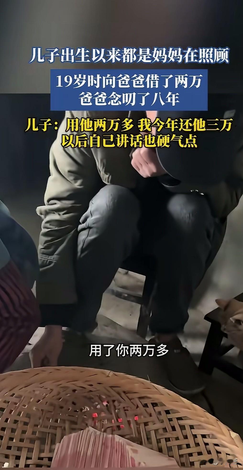 贵州一男子说19岁时借了亲爸两万块钱,爸爸一直叨叨了8年怕不还。如今他取了3万现金专程回去还给爸爸,男子:以前你对我没有养育之恩,自出生后都是妈妈在管,之前用了你2万,如今我还你3万,你都好好收好,以后的情分也就到这了。 男子一把把现金递给父亲,父亲带着帽子低着头抽烟也不接话,然后男子又把钱放在框里,让父亲收起来。 父亲一直没有接话,只有儿子质问说,从小你也没管我我,没有尽过父亲的责任,如今我多给你拿一万,也是还了这情分。 听到这话的老父亲,把烟掐灭了,把头埋的很低,帽子下看不清父亲的表情。 男子说多还了这钱,也不用再听父亲叨叨,以后讲话也硬气点。 有人说看老父亲的手,抽的烟也是劣质烟,低着头仿佛卑微到土地里,听着儿子的话,心里肯定也是不好受。 因为贫穷父亲才会如此在意这2万块钱,其实想想八年前,他能把2万借给你,可能就是他全部的积蓄,换成别人,都不一定有人会借钱给你,所以父亲要钱也很正常,不应该因为这事记恨父亲,他也不容易。 也有人说,有的男人就是这样,把孩子的事一股脑扔给老婆,不愿意为家庭和孩子付出,到头来老了又觉得孩子不孝顺,不亲近。 他权衡完利弊之后,放弃了孩子,如今低头难过,不是因为觉得错了,而是觉得自己老了。