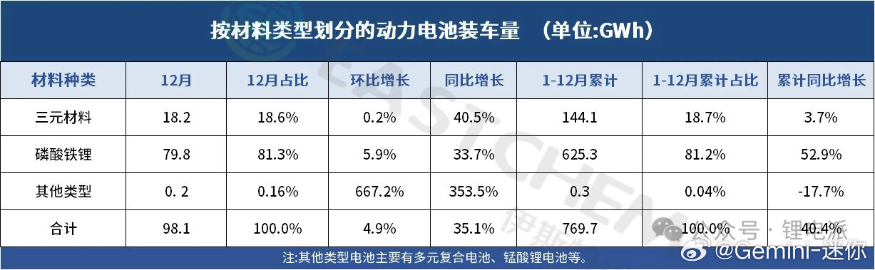 磷酸铁锂装车量的增速远高于三元锂2025年三元电池累计装车量144.1GWh,占总装车量的18.7%,累计同比增长3.7%2025年磷酸铁锂累计装车量625.3GWh,占总装车量的81.2%,累计同比增长52.9%动力电池汽车资讯新能源汽车