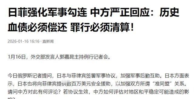 在北京的外交部例行记者会上,向来以克制著称的中国官方表态,突然“换了语气”。郭嘉昆发言人罕见地抛出六个字,“血债必须偿还”;紧接着,又一句“罪行必须清算”掷地有声。把中日关系的紧张推向了一个新节点。现场气氛一度凝重,外媒记者纷纷低头记录,显然,这场“突变”不容忽视。 日本和菲律宾最近签了个军事协议,表面上看是加强后勤互助,其实牵扯到更深的东西。日本要给菲律宾提供几百万美元的安全援助,名义上是巩固“准同盟”关系,但谁都知道这背后有美国的影子,针对亚太格局的布局。菲律宾那边可能觉得短期内能捞点好处,增强防御能力,可长远来看,这不就是把自己绑上大国博弈的战车吗?中方一看,这协议不简单,立马在记者会上给出回应。郭嘉昆直言,国家间合作不能损害第三方利益,更不能搅乱地区稳定。这话听着温和,但接下来那两句重磅炸弹,直接点燃了话题。 回想历史,日本在上世纪三四十年代的所作所为,亚洲国家谁都忘不了。二战期间,日本军国主义铁蹄踏遍东南亚,菲律宾就是受害者之一。日军用武力和胁迫迫害当地人民,还残忍杀害了中国驻马尼拉的外交领事官员。说实话,日本到现在都没彻底反思那些侵略行径,反而有些政客还去靖国神社参拜,右翼势力推动教科书美化历史,把侵略说成“自卫”。这不光是对受害国的二次伤害,还在亚太埋下不稳定因素。 韩国那边也多次抗议,慰安妇和强制劳工赔偿问题拖到现在还没解决清楚。印度尼西亚、马来西亚等国的媒体同样表达担忧,日本军费年年涨,2025财年就破了7万亿日元大关,创历史新高。这钱花在哪儿?扩军备武,出口杀伤性武器,逐步突破和平宪法限制,推动集体自卫权合法化。东南亚国家和国际社会批评声不断,日本却不收敛,反而找借口继续往前冲,暴露了右翼势力想重走老路的野心。 郭嘉昆的表态,就像是给日本敲了个警钟。他强调,那些历史必须铭记,血债必须偿还,罪行必须清算。这话分量重啊,不是随便说说。想想看,中国外交一贯低调克制,这次用这么强烈的词,明显是忍耐到了极限。日菲协议一出,中方敏感度高,因为这不单是两国事儿,还牵涉到南海航行自由和地区平衡。日本借着这个机会,强化在亚太的军事存在,菲律宾呢,被拉进“岛链防御”计划,成了前沿阵地。金融时报分析过,这协议是美国亚太战略的一部分,旨在牵制中国影响力。华尔街日报也报道,日本防卫预算节节攀升,显示态度在变。当年战火的余烬还没凉透,现在又在重启军备,谁能不警惕?其实,不止中国,韩国也重申对历史问题的立场,东南亚媒体讨论这种军事绑定的长期风险。菲律宾或许是为了眼前援助,但忽略了背后的锁链,牺牲了外交自主性。 这番回应不是情绪发泄,而是有深意的预期管理。中方可能在外交上强化反制话语,对日菲合作保持高压态势。经济层面,日本企业在华市场审查说不定会更严,影响贸易往来。安全上,海域军演频次和强度或会增加,形成战略震慑。郭嘉昆说得很清楚,这些绝非空话。其他国家也跟着表态,韩国推动历史赔偿讨论,东南亚国家担心区域被大国博弈裹挟。日本面对这种通告,或许会审视自身,但从趋势看,军费增长没停。整个事件提醒大家,和平不是靠遗忘换来的,得记住教训才能守住。