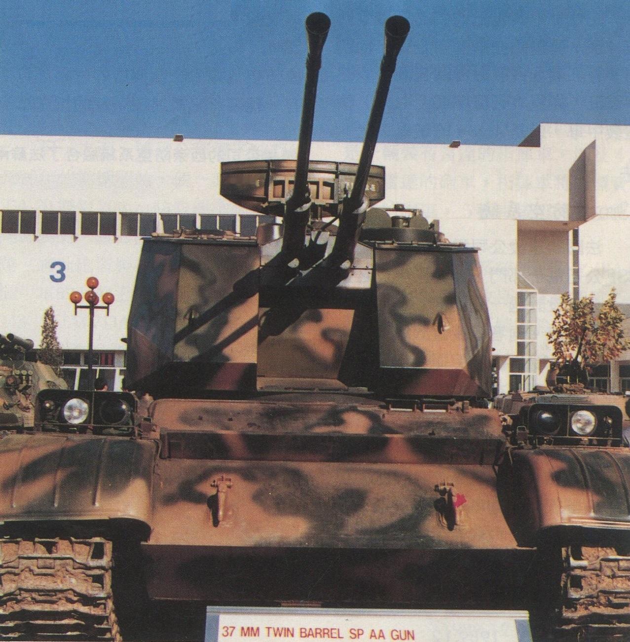 1986年11月在北京所举行的首届国际防务技术展览会(ASIANDEX '86)所展出的88式37毫米双管自行高炮样车,可见炮塔顶部安装的搜索测距雷达