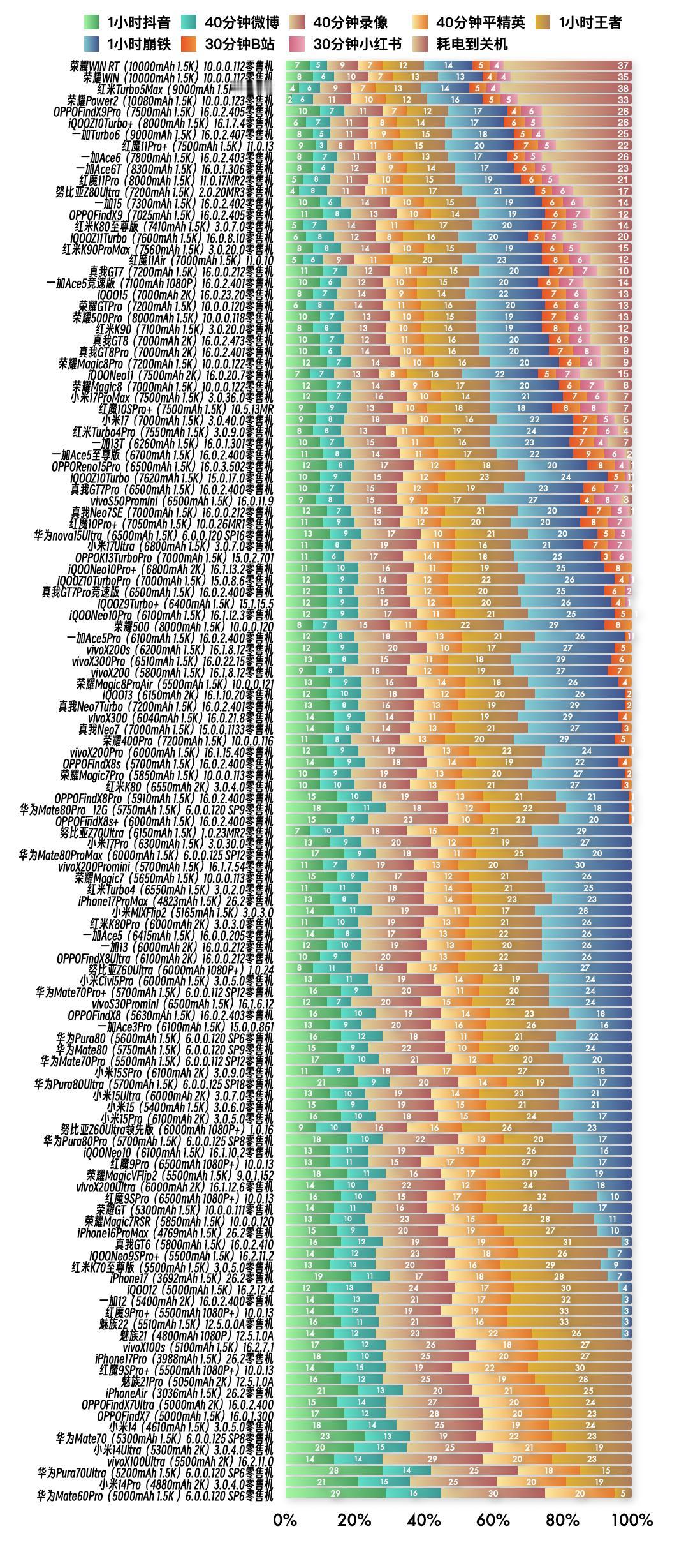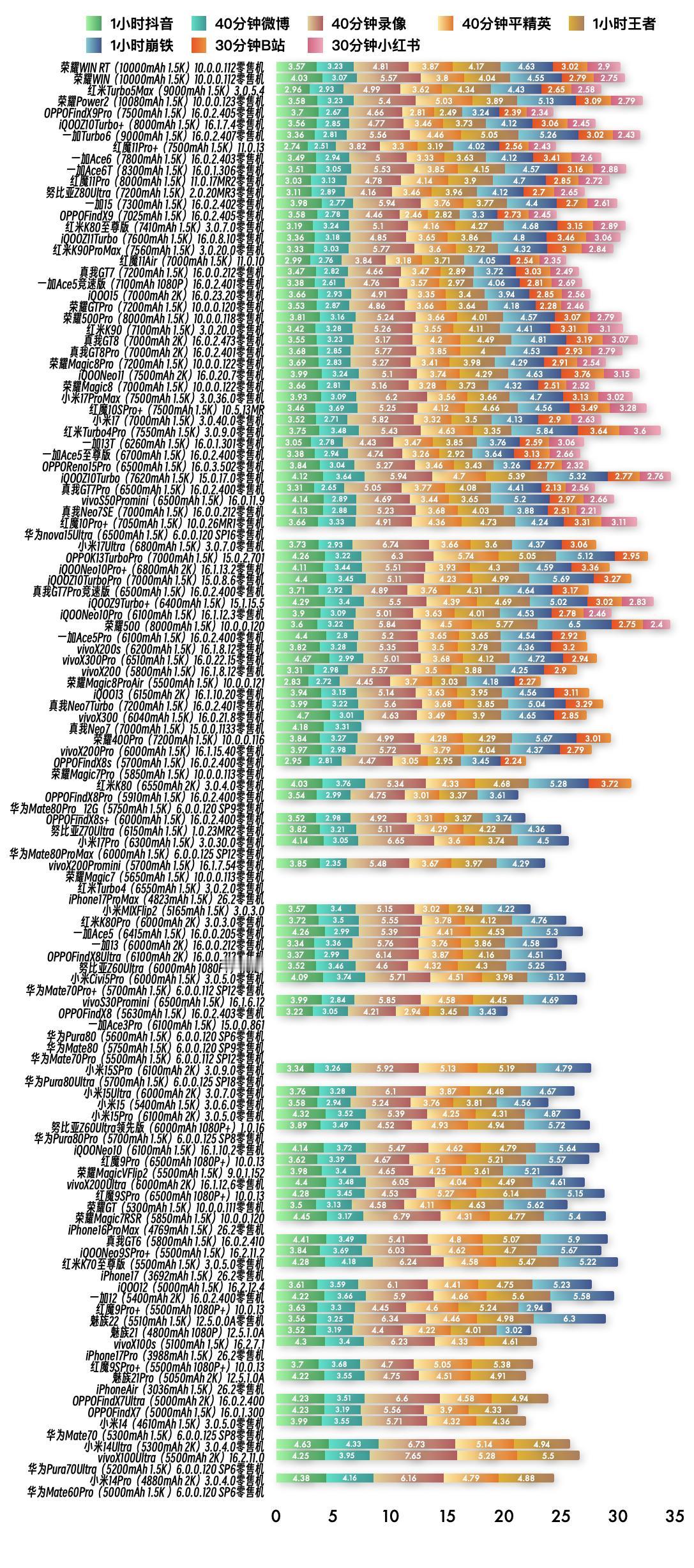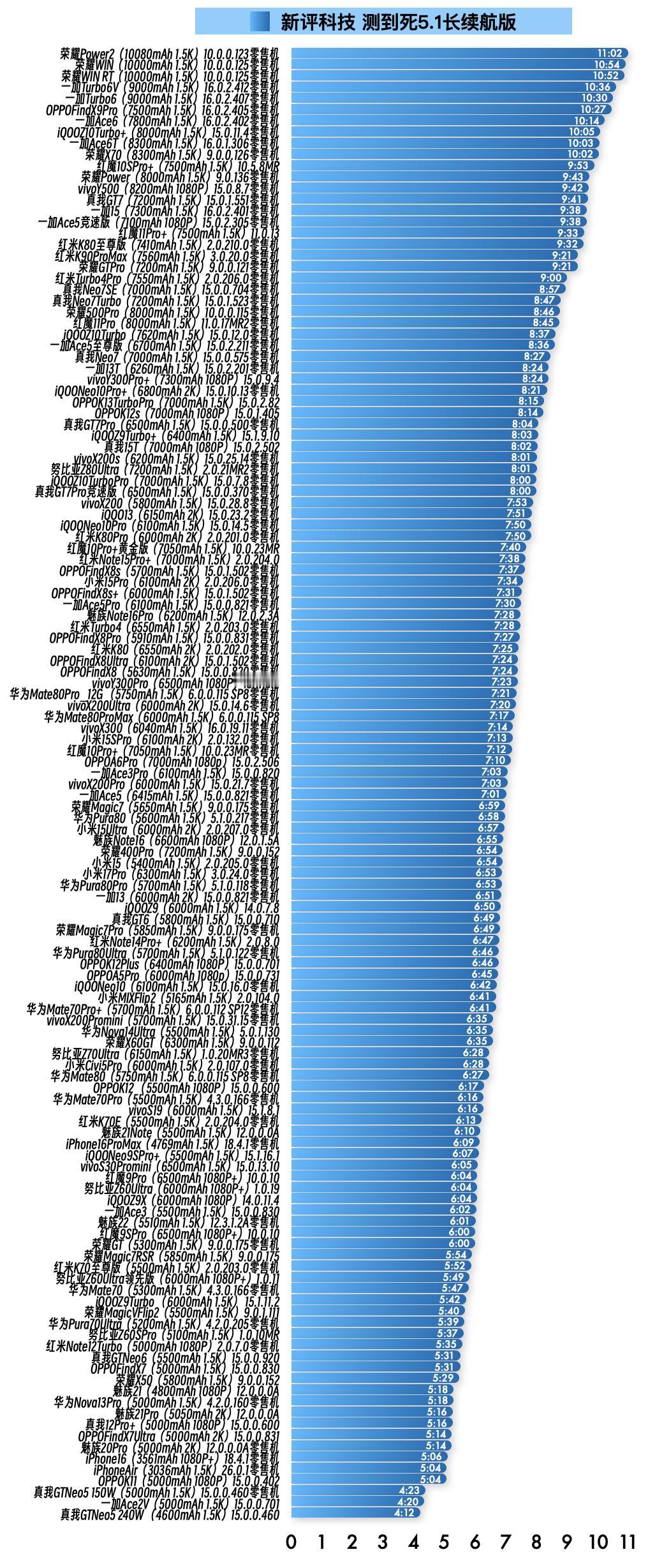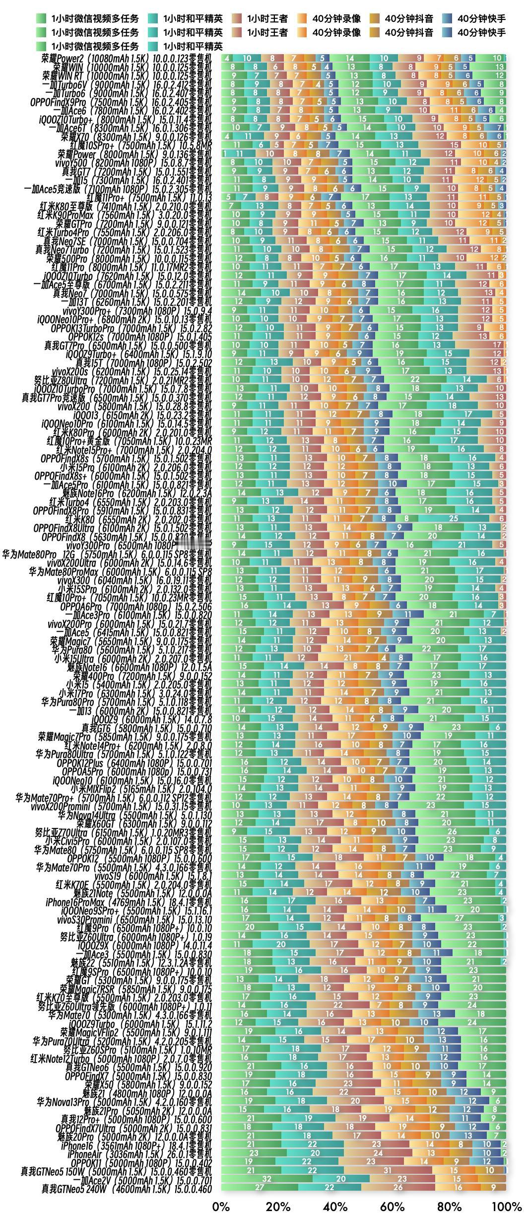 『1月22日最新手机续航榜单』 新评科技续航排行榜 本次6.0标准续航排行榜新增4台手机续航成绩,复测15台手机续航成绩;5.1长续航排行榜新增8台手机续航成绩;⭐️完整详细榜单请访问新评科技数据库小程序⭐️ 『6.0标准续航榜单』新增 ① 红米Turbo5Max 3.0.5.4版本总续航时间8小时56分钟,最新排名第3名 ② iQOOZ11Turbo零售机 16.0.8.10版本总续航时间6小时56分钟,最新排名第16名 ③ 红魔11Air 11.0.10版本总续航时间6小时44分钟,最新排名第18名 ④ 荣耀Magic8ProAir 10.0.0.121版本总续航时间5小时26分钟,最新排名第55名 『6.0标准续航榜单』复测 ① 荣耀Magic8Pro零售机 第3次复测 10.0.0.122版本续航时间增加2分钟,总续航时间6小时27分钟,最新排名第27名【对比历史成绩续航不变】 ② 小米17零售机 第3次复测 3.0.40.0版本续航时间缩短2分钟,总续航时间6小时12分钟,最新排名第32名【对比历史成绩续航不变】 ③ 一加Ace5至尊版零售机 第3次复测 16.0.2.400版本续航时间缩短9分钟,总续航时间6小时10分钟,最新排名并列第34名【对比历史成绩续航不变】 ④ OPPOReno15Pro零售机 第3次复测 16.0.3.502版本续航时间缩短5分钟,总续航时间6小时09分钟,最新排名第36名【对比历史成绩续航不变】 ⑤ 真我GT7Pro零售机 第3次复测 16.0.2.400版本续航时间缩短7分钟,总续航时间6小时05分钟,最新排名第38名【对比历史成绩续航不变】 ⑥ 真我Neo7SE零售机 第3次复测 16.0.0.212坂本续航时间不变,总续航时间6小时03分钟,最新排名并列第39名【对比历史成绩续航不变】 ⑦ 真我Neo7Turbo零售机 第3次复测 16.0.2.401版本续航时间缩短31分钟,总续航时间5小时22分钟,最新排名第57名【对比历史成绩续航缩短】 ⑧ vivoS30Promini 第2次复测 16.1.6.12版本续航时间增加4分钟,总续航时间4小时50分钟,最新排名并列第81名【对比历史成绩续航不变】 ⑨ 小米15SPro零售机 第3次复测 3.0.9.0版本续航时间增加4分钟,总续航时间4小时47分钟,最新排名并列第88名【对比历史成绩续航不变】 ⑩ 华为Pura80Ultra零售机 第3次复测 6.0.0.125 SP18版本续航时间增加5分钟,总续航时间4小时43分钟,最新排名第90名【对比历史成绩续航不变】 11 小米15Pro零售机 第3次复测 3.0.5.0版本续航时间增加1分钟,总续航时间4小时40分钟,最新排名并列第91名【对比历史成绩续航不变】 12 华为Pura80Pro零售机 第3次复测 6.0.0.125 SP8版本续航时间缩短11分钟,总续航时间4小时33分钟,最新排名并列第95名【对比历史成绩续航缩短】 13 iQOONeo10零售机 第3次复测 16.1.10.2版本续航时间缩短13分钟,总续航时间4小时33分钟,最新排名并列第95名【对比历史成绩续航缩短】 14 荣耀MagicVFlip2 第3次复测 9.0.1.152版本续航时间缩短10分钟,总续航时间4小时31分钟,最新排名并列第98名【对比历史成绩续航不变】 15 真我GT6 第2次复测 16.0.2.410版本续航时间缩短15分钟,总续航时间4小时19分钟,最新排名并列第103名【对比历史成绩续航缩短】 『5.1长续航版榜单』新增 ① 荣耀Power2零售机 10.0.0.123版本总续航时间11小时02分钟,最新排名第1名 ② 荣耀WIN零售机 10.0.0.125版本总续航时间10小时54分钟,最新排名第2名 ③ 荣耀WIN RT零售机 10.0.0.125版本总续航时间10小时52分钟,最新排名第3名 ④ 一加Turbo6V零售机 16.0.2.412版本总续航时间10小时36分钟,最新排名第4名 ⑤ 一加Turbo6零售机 16.0.2.407版本总续航时间10小时30分钟,最新排名第5名 ⑥ 红米K90ProMax零售机 3.0.20.0版本总续航时间9小时21分钟,最新排名并列第19名 ⑦ 红魔11Pro零售机 11.0.17MR2版本总续航时间8小时45分钟,最新排名第25名 ⑧ 努比亚Z80Ultra零售机 2.0.21MR2版本总续航时间8小时01分钟,最新排名并列第37名