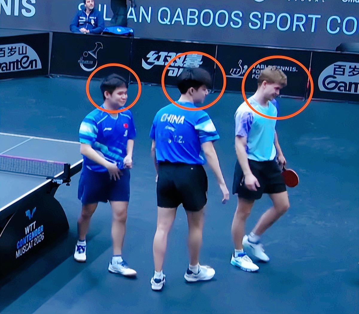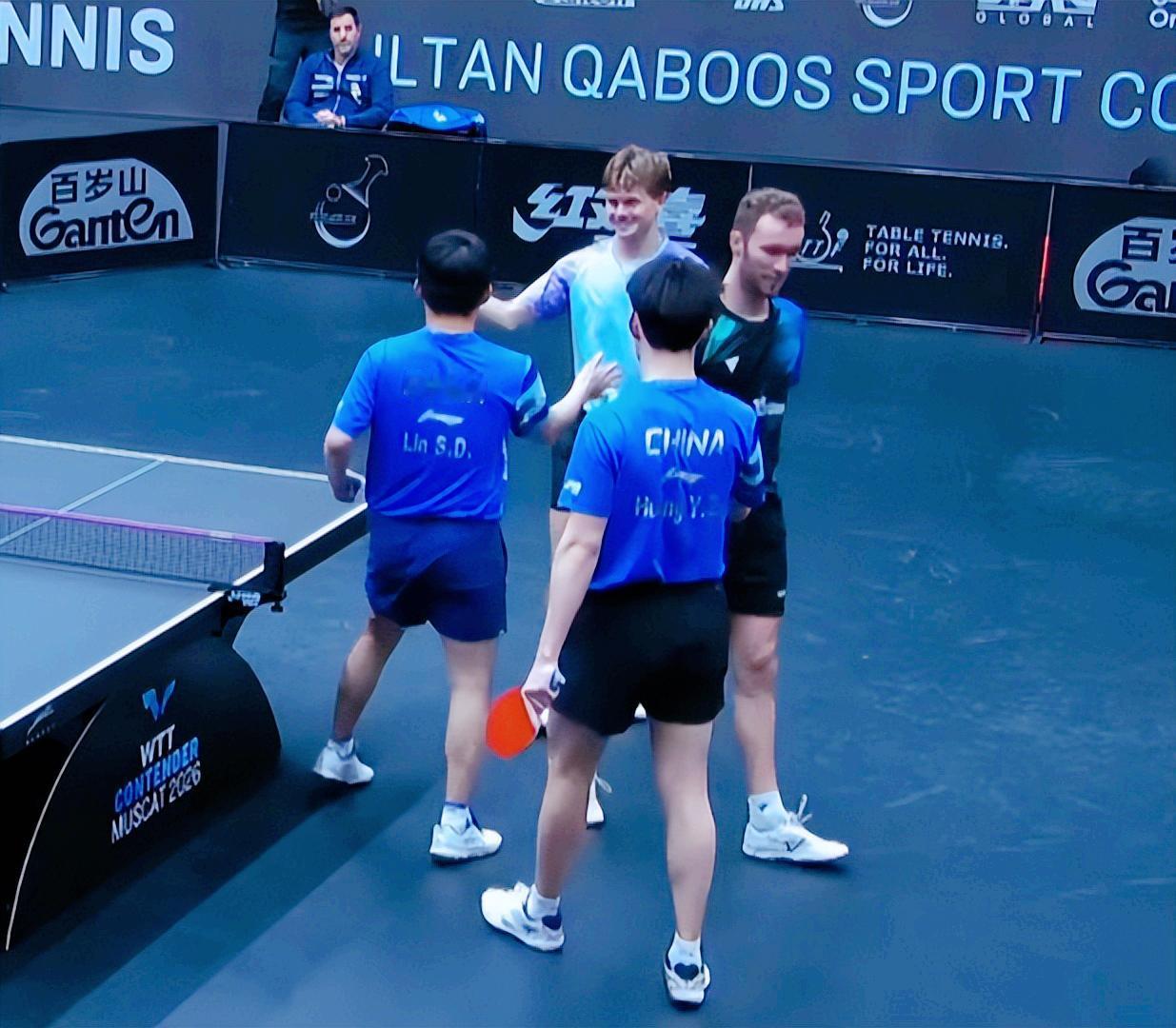 愁眉不展的林诗栋,终于露出了笑容! 今天林诗栋/黄友政! 3:0拿下了皮卡德/豪格这对跨国组合。 对手情绪好稳定, 最后一个局点球, 林诗栋和黄友政轮番放高球, 最后皮卡德呼出球桌了。 两人相视一笑, 也没有埋怨, 感觉真不错。 皮卡德可能觉得失误, 有些难为情, 先走一步。 剩下三人咯咯笑着一起走出了赛场!
