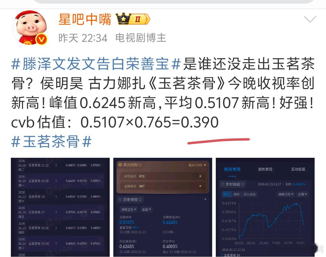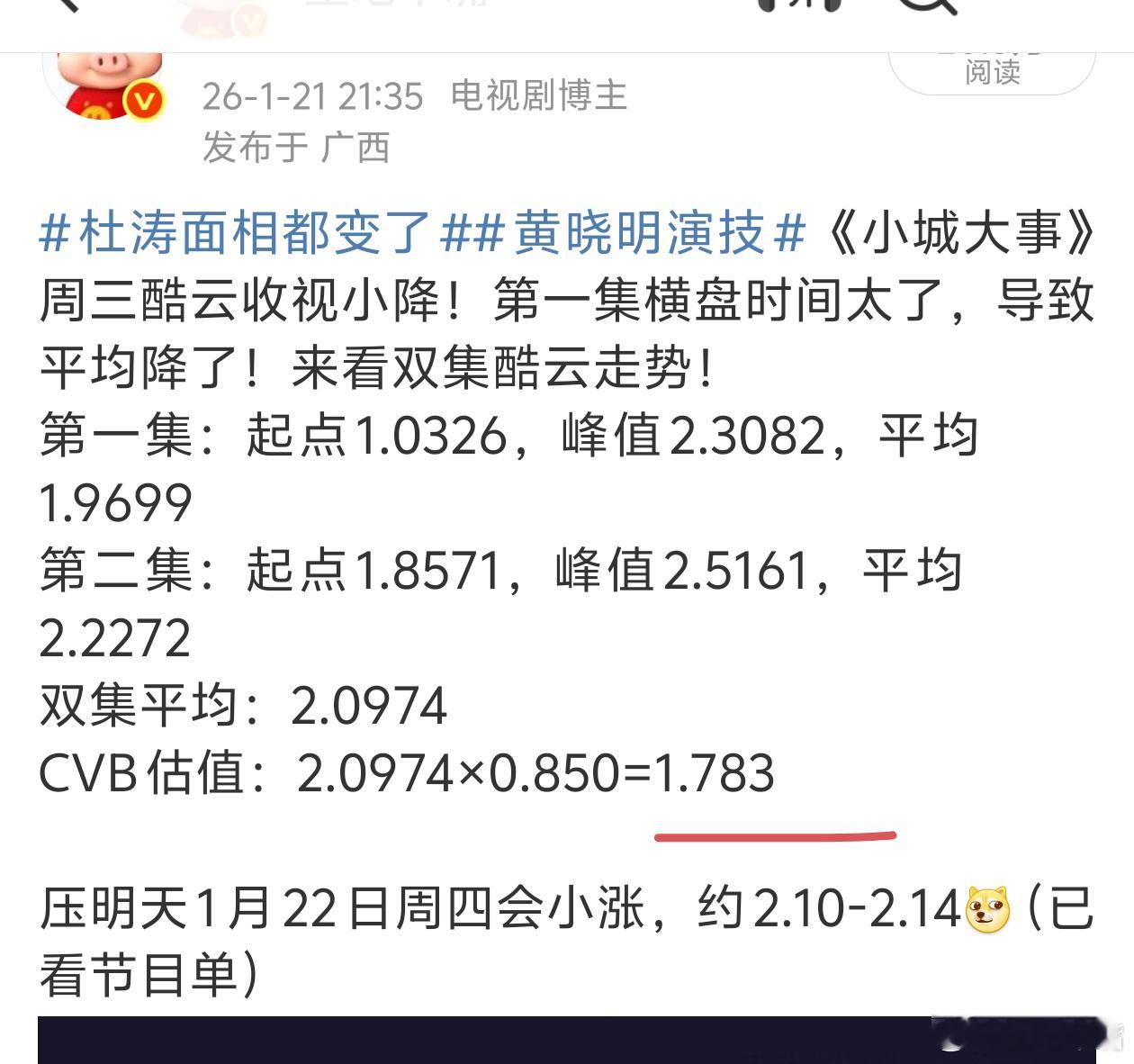 黄晓明剧宣有多努力1月21日cvb收视日报小城大事1.770,酷云2.0974,系数0.844玉茗茶骨0.395,酷云0.5107,系数0.773玉茗茶骨新高了
