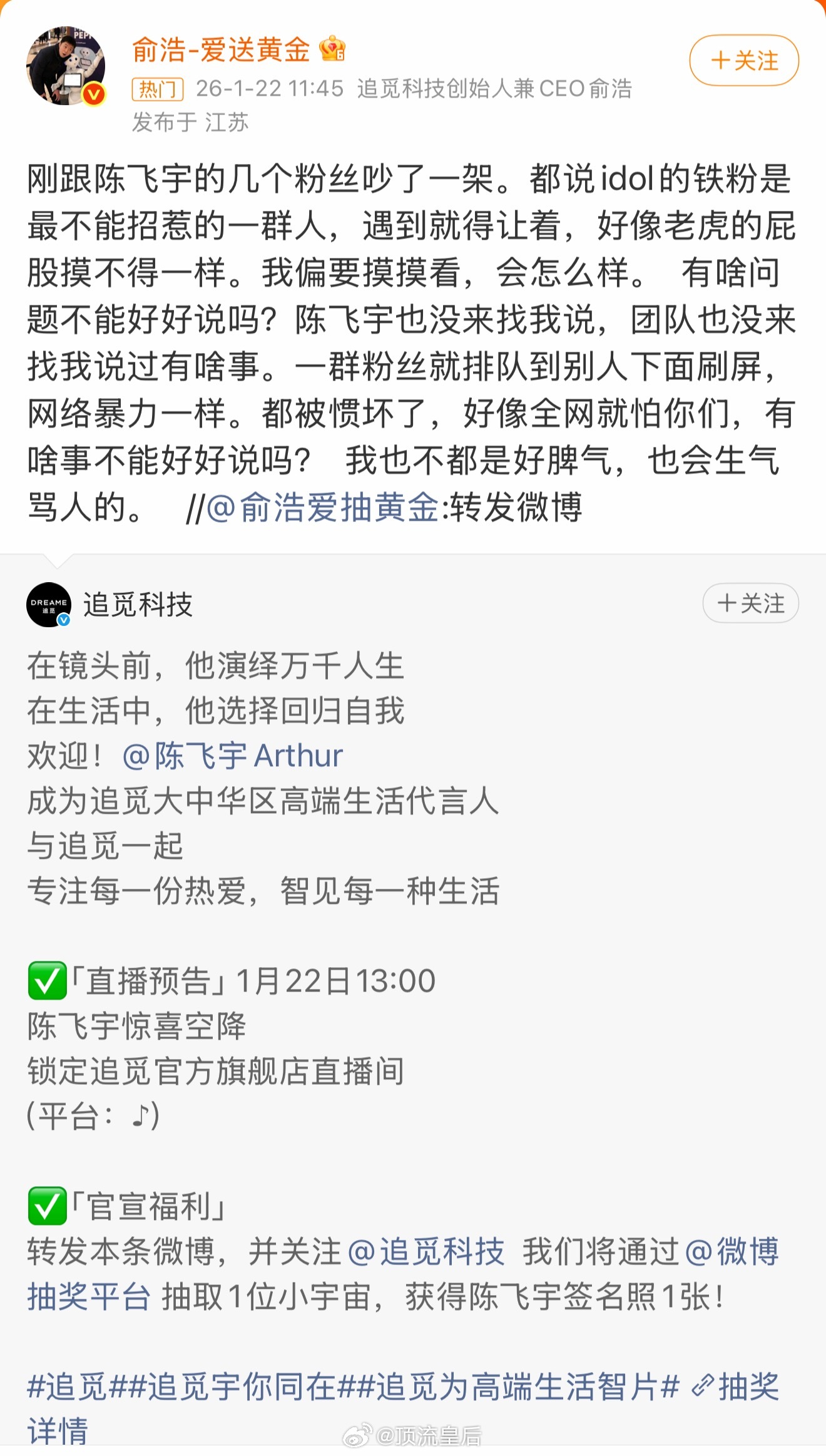 追觅CEO俞浩怒怼陈飞宇粉丝emm……大家怎么看?
