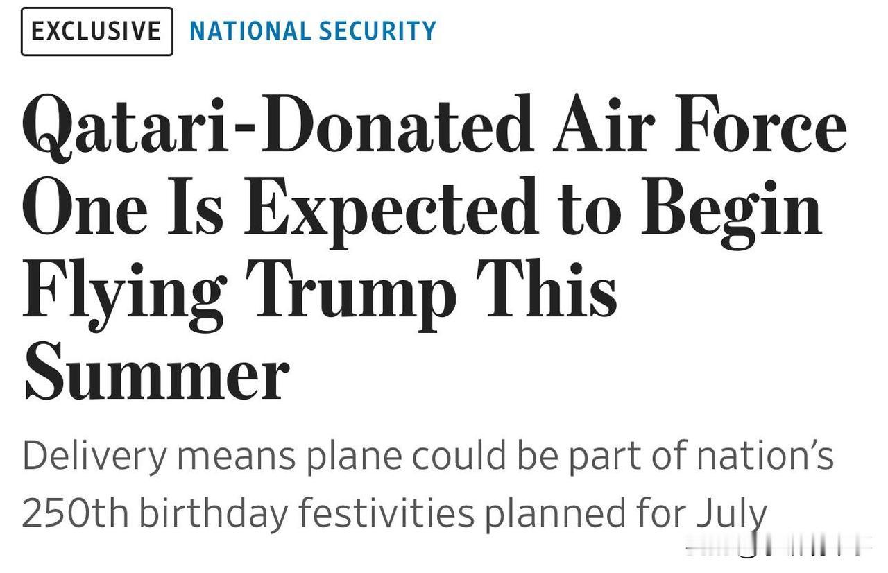 🇺🇸🇶🇦✈️据美国《华尔街日报》报道,卡塔尔捐赠的一架波音747飞机经过翻新后,将成为新的空军一号,预计于2026年夏季交付给美国总统特朗普使用,并可能在7月美国建国250周年庆典期间亮相。 ➡️在波音公司制造的新空军一号飞机尚需数年才能交付期间,现有飞机正接受安全通信系统和总统专用涂装的改装,作为临时解决方案。 ➡️该飞机可能采用特朗普偏爱的红、白、深蓝色配色方案。