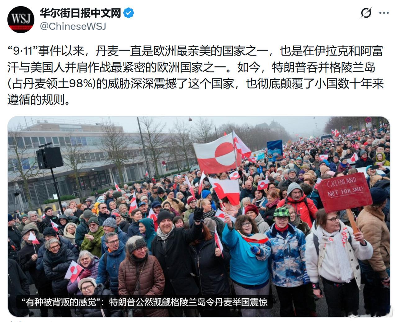 华尔街日报:“9·11”事件以来,丹麦一直是欧洲最亲美的国家之一,也是在伊拉克和阿富汗与美国人并肩作战最紧密的欧洲国家之一。如今,特朗普吞并格陵兰岛的威胁深深震撼了这个国家,也彻底颠覆了小国数十年来遵循的规则。丹麦一点也不无辜,所以我支持格陵兰岛独立!