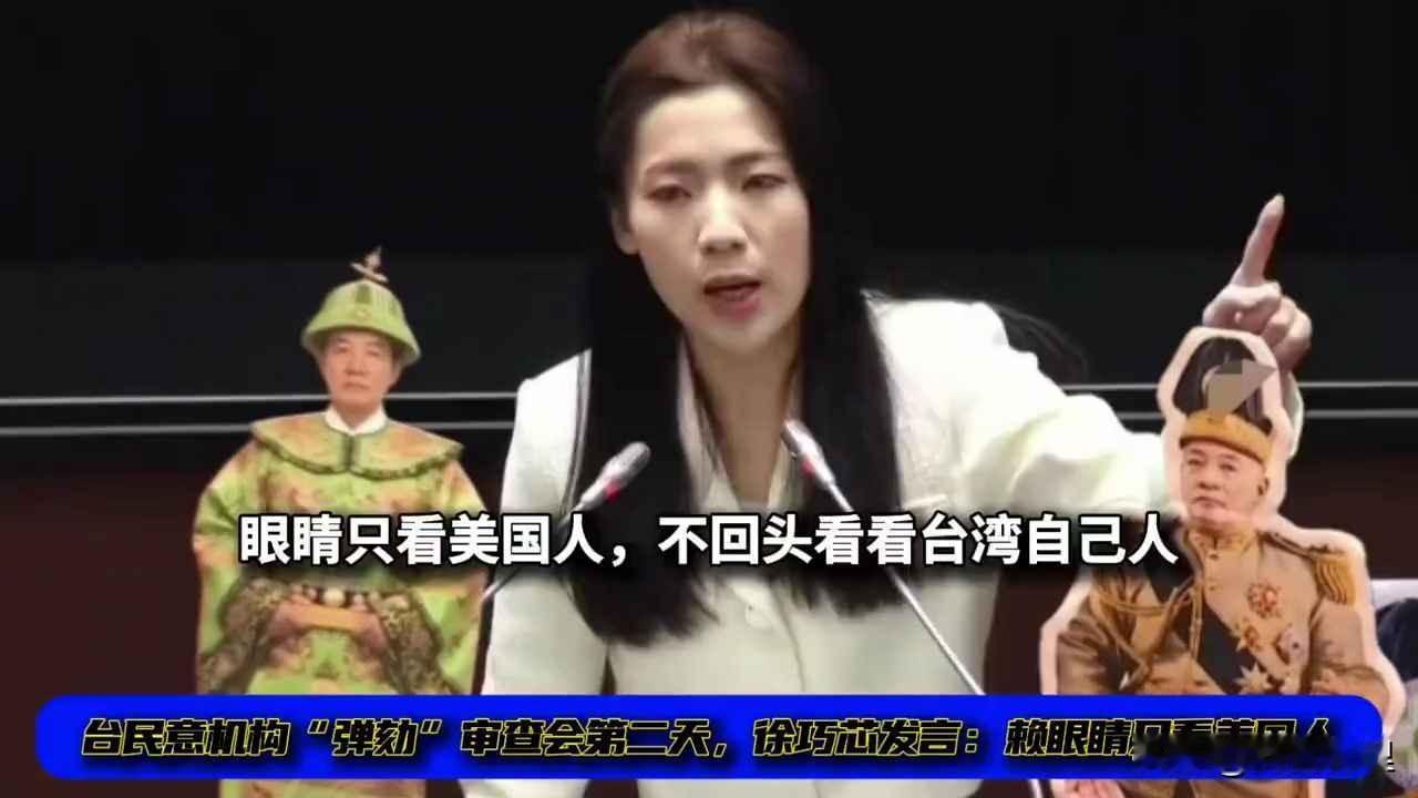 徐巧芯痛批赖清德,对外跪舔,对内放火,台湾人不是傻子! 在台湾政坛,敢说、能说、说到点子上的人不少,但像徐巧芯这样,既能引经据典又能直击痛点,让对手哑口无言的,实属罕见。 这位被国民党前主席洪秀柱盛赞为“朝天椒”的“立委”,最近又放大招了。在质询赖清德当局2026年度巨额防务预算时,她的一番话不仅撕开了赖清德“抗中保台”的遮羞布,更道出了无数台湾民众的心声。 9495亿的大窟窿,没一分钱给自家人,赖清德张口就要9495亿新台币搞防务,听着挺吓人。但徐巧芯一翻账本,问题全出来了:这么大的预算,竟然没一分钱是给军、警、消涨待遇的!立法院早就通过了《军人待遇条例》,结果行政院当没看见。这哪里是保台?分明是把自家的守护者当“走狗”随便丢。 对外当“舔狗”,对内耍威风,徐巧芯这话太狠了,但也太对了:“赖清德,你当外国人的舔狗,却把自家人当走狗!”面对美国加征关税,他连个屁都不敢放;面对日本乱改历史、甚至涉及台积电的事,他装哑巴。对外卑躬屈膝,对内却拿着大帽子乱扣,这种双标谁受得了? 买导弹的钱大把,养娃的钱没有,更气人的是民生。花几千亿买美国的破铜烂铁,等了六年还没到货;结果呢?真正需要钱的幼儿托育、长照预算,却抠抠搜搜。防务预算涨得飞快,老百姓的福利却跟不上。这不是本末倒置是什么? 徐巧芯这番话,真是说到老百姓心坎里了。和平才是发展的基础,靠讨好外人、牺牲自己人换来的“安全”,根本就是骗局。赖清德该醒醒了,别把台湾的家底都败光了!