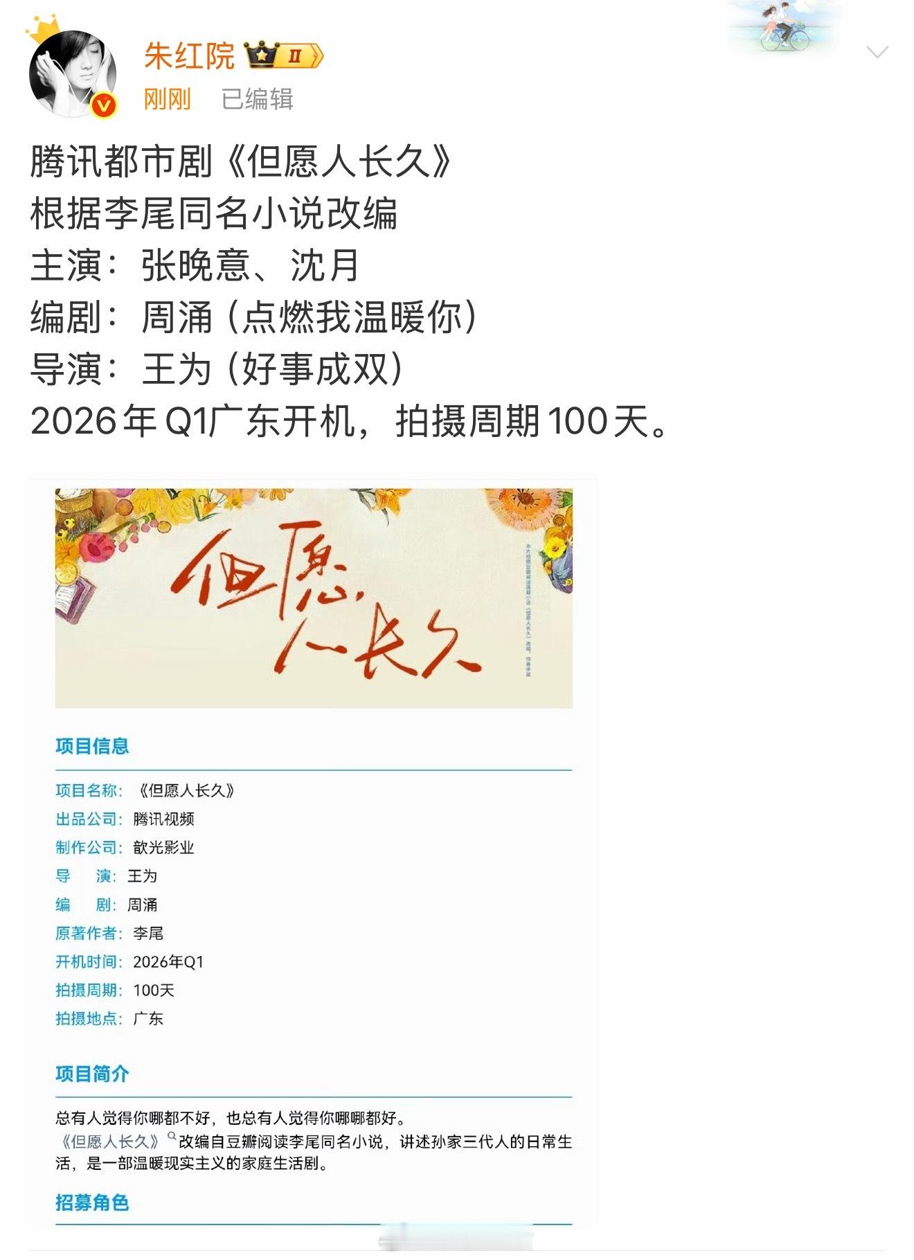 看到🍉主发的但愿人长久主演人选目前没有变动,还是张晚意和沈月。