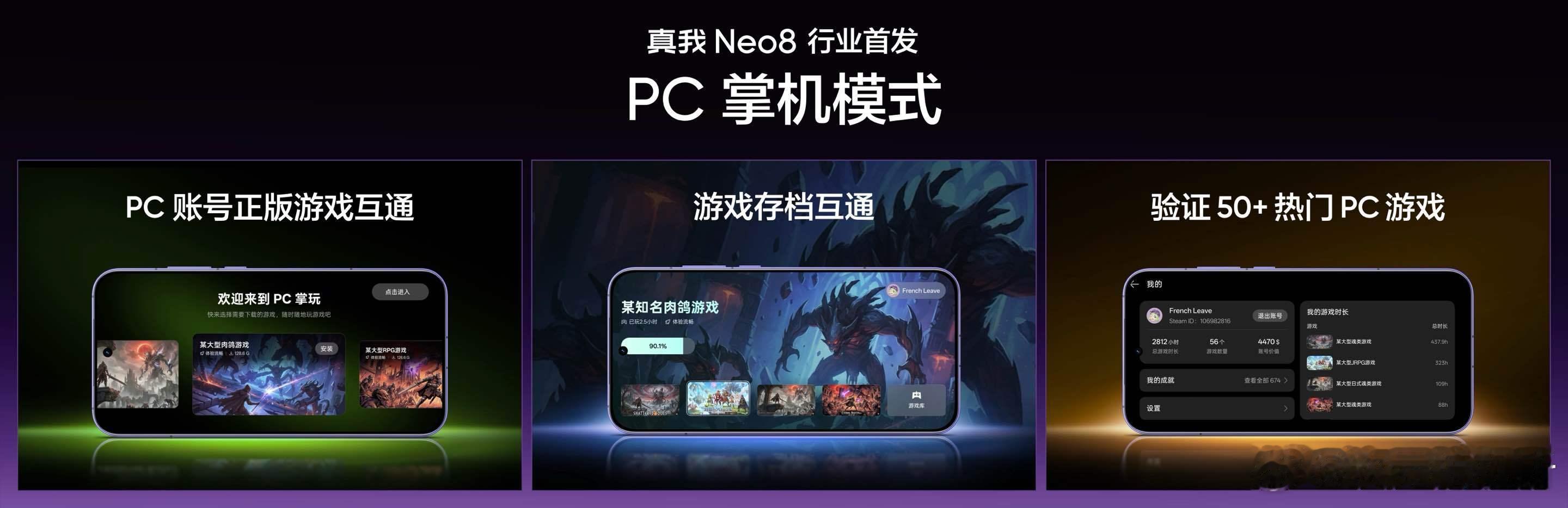 真我Neo8第五代骁龙8×极客性能面板×GT性能引擎全面加持,开启高阶性能释放;并带来PC掌机模式,手游+PC游戏真我Neo8一机满足!【第五代骁龙8旗舰芯,领衔顶级硬件】-第五代骁龙8采用第五代骁龙8至尊版同款旗舰架构与3nm先进制程工艺,350W+跑分天生即旗舰-大气流冷锋散热系统,散热总面积高达39225mm²,解锁真我最强散热-苍穹通信系统×穹通信芯片S1,弱网游戏也能快人一步【新一代GT性能引擎,激发系统级调校】-凭借先知能效调度、定制游戏专属性能核心、超级帧率算法等,性能拉满调校领先-主流枪战手游165帧无限满帧,国民级MOBA手游144帧无限满帧,大型开放世界手游60帧跑图2小时满帧【新一代极客性能面板,开启高阶自定义】-不仅支持自定义CPU与GPU运行频率,更无需ROOT即可打破温控上限,将性能自由还给用户-新增自定义温控调节支持五档温控调节,档位越高性能释放越强, 想保守还是激进由你定义【PC掌机模式,手机秒变Steam掌机】-Steam账号登陆,保障已购正版游戏互通,并支持游戏存档全平台互通。现已验证适配50+款热门PC游戏,支持《空洞骑士:丝之歌》《哈迪斯2》《古墓丽影9》等游戏流畅运行,并适配游戏手柄操作-户外露营、宿舍床上、飞机高铁等差旅通勤,随时随地开启掌上电竞房体验,将正版Steam庞大游戏库装进口袋,一键启动嗨玩到底
