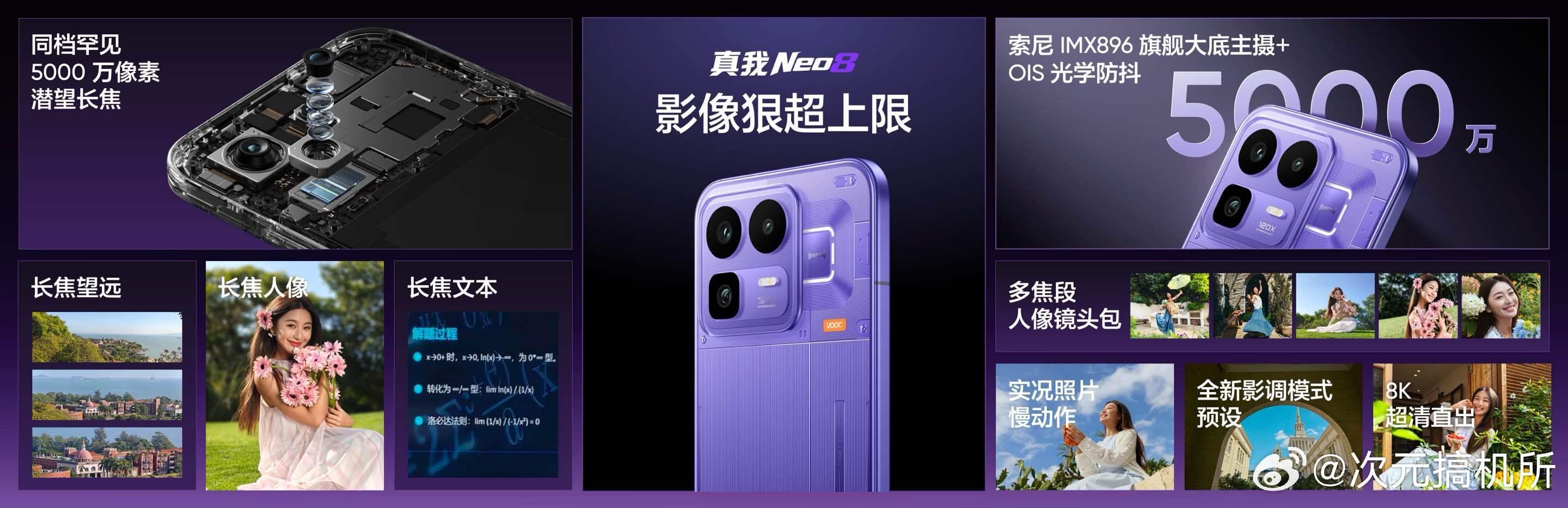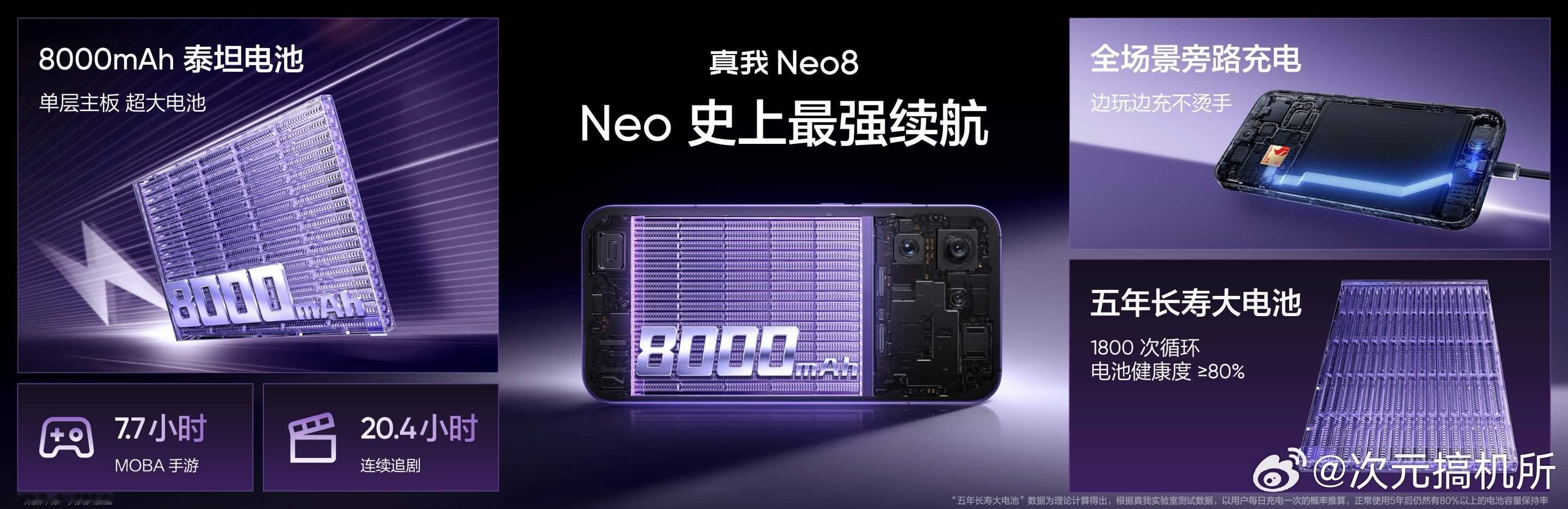 真我Neo8影像、续航、系统、交互全方位狠超上限【同档罕见长焦+旗舰大底主摄,远近都清晰张张都好看】同档唯一潜望长焦,拍课件神器-同档罕见5000万像素潜望长焦,支持3.5倍光学变焦,7X无损变焦、最高120倍超清变焦。 人像背景虚化自然,构图更具呼吸感。搭配AI超级文本算法,不怕拍糊、不怕拍歪、更易分享,成为真正的大学生最强外挂、拍课件神器索尼旗舰大底主摄,全焦段覆盖影像体验-5000万索尼OIS 主摄覆盖全焦段,远近日夜稳稳出片,配合实况照片慢动作与全新影调模式、8K超清照片直出,轻松凝固高光瞬间,在多焦段人像镜头包中,张张都是大片质感【8000mAh泰坦电池,5年长寿持久耐用】-真我Neo8选用性能优先的单层主板架构,既要性能优先,又要续航领先。8000mAh 泰坦电池,采用行业领先新一代硅碳负极,含硅量高达16%,相比上一代能量密度提升3%,让两天一充将成为常态。搭配80W闪充+全场景旁路充电+5年长寿算法,电池持久耐用。 【全新realme UI7.0,更流畅,更聪明,更高效】-真我Neo8搭载全新realme UI7.0,让系统流畅顺滑、游戏多任务自由、创作办公一机搞定-全新流光引擎,从系统流畅到动效顺滑,点击响应、重载启动响应、重载功耗表现全面进化-灵动窗口,真我独家小窗功能,让你边玩游戏边多任务操作,息屏挂机、侧边双开,效率与娱乐同时在线-AI 体验狠超上限,支持个性问答、AI简报、尤其是AI写作不仅能写文案,能写PPT,甚至能写脑图【防护、解锁、体验全拉满,旗舰配置一步到位】-支持IP66+IP68+IP69满级防尘防水,苍穹智慧地图、旗舰级超声波3D指纹、超线性立体双扬声器、X轴线性马达等,全面旗舰体验一次到位