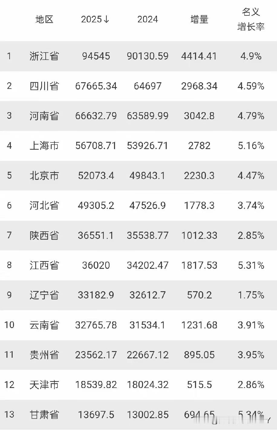 截至今日,已有13个省市的2025年GDP总量新鲜出炉,这些数据如同经济舞台上的“成绩单”,展现出各地经济发展的不同态势,可谓是“几家欢喜几家愁”。 在已公布数据的省市中,浙江省一马当先,经济总量突破9万亿大关,达到94545亿,犹如经济巨轮在海洋中稳健航行。 其实际增速为5.5%,增量约4538亿元,名义增速为5.04%,无论是总量还是增速,都彰显出强大的经济实力和发展活力。 与之相比,辽宁省的情况就有些差强人意了,以33182.9亿元位列公布省份中的第九位,实际增速3.7%,名义增速仅1.97%,增量约为642.1亿元,在这13个省市中增速垫底,仿佛是经济列车在轨道上放缓了脚步。 北京作为我国的首都,2025年GDP总量首次突破5万亿,实现52073.4亿,成绩斐然。这一突破不仅是北京经济发展的重要里程碑,也让其有望缩小与经济强省的差距。 而河北省则稍显遗憾,全年地区生产总值为49305.2亿元,未能突破5万亿大关。河北的经济增量低于北京,与北京的差距扩大至2768.2亿,就好像一场赛跑中,暂时被拉开了一段距离。 不过,河北也并非毫无亮点,其实际增速为5.6%,按不变价格计算,比上年也有一定程度的增长,未来仍有追赶的机会。 值得关注的是,陕西和江西在2025年携手突破3.6万亿元大关,分别实现36551.1亿和36020亿。这两省如同经济赛道上的“并驾齐驱者”,此前多年GDP总量排名相邻,发展态势较为相似。 但在2025年,江西展现出了更强劲的势头,其经济增量与增速都高于陕西,实际增速达5.2%,名义增速为5.31%,增量约为1817.53亿元,而陕西实际增速5.1%,名义增速3.14%,增量约为1114亿元。 如此看来,江西有望在2026年赶超陕西,上演一场精彩的“弯道超车”好戏。江西凭借锂电新能源和产业承接等优势一路猛冲,民营投资增速达21.1%,可谓是动力十足。 陕西虽有丰富的科研高校资源,但在经济增速上暂时落后,不知未来能否凭借这些优势扳回一局呢? 天津2025年GDP预测实现18539.82亿,较去年增加了515.5亿,名义增速2.86%,不过这一增速低于全国平均线1.13个百分点。就像一艘船在大海中航行,虽然在前进,但速度相较于大部队稍慢了一些。 而甘肃省则在这些省市中脱颖而出,实际增速达到5.8%,名义增速为5.34%,在已公布省份中实际增速最高,如同经济舞台上的一匹“黑马”,展现出巨大的发展潜力。 这些省市的GDP数据,是各地经济发展的缩影,反映出不同地区在产业结构、投资动力、发展模式等方面的差异。 它们共同构成了我国丰富多彩的经济画卷,也让我们看到,每个省市都在努力奔跑,向着经济高质量发展的目标迈进。 未来,这些省市又会有怎样的表现,能否续写辉煌或实现逆袭,让我们拭目以待。