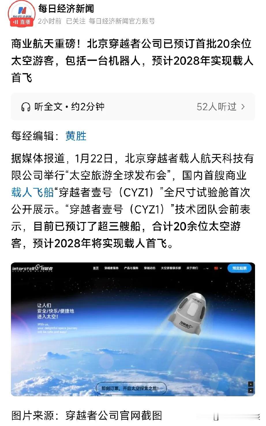 太空旅游开始了。这商业航天太牛逼了,已经开始预定私人太空旅游业务。已经有20个人预定了太空旅游项目预计2028年可以实现载人太空旅游。有钱人就是不一样啊,地球已经不够玩儿了,想到太空上去看看,这可是个新鲜的地方。 应该感到很新鲜好玩。