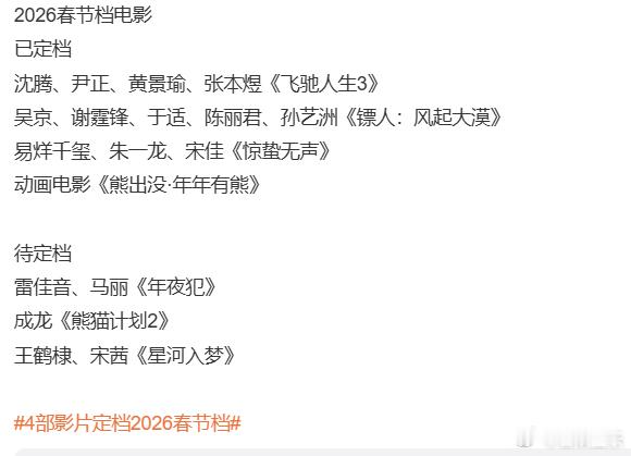 每年进入腊月,娱乐圈大热门基本上都是央视春晚的彩排动态,还有哪些新片哄抢春节黄金档期,两大热点收割除夕前和春节大假的流量,一个负责烘托气氛,一个负责消遣假期。根据最近这些年的情况判断,2026年春节档虽然很难再续2025年春节档票房辉煌,但作为一年中最火的档期,依然会有很多新片哄抢,基本上都会超过六七部甚至更多。刚进入腊月,就有四部新片率先定档春节,分别是:《惊蛰无声》、《镖人》、《飞驰人生3》《熊出没·年年有熊》 动画电影。看起来竞争力都不差,前三部明星阵容豪华,后两部都是老题材有些基础热度。但相比之下,张艺谋的《惊蛰无声》关注热度最高,不仅仅是张艺谋名气大实力强,更是因为他争议最大。之前几十年,张艺谋一直用文艺片成就自己,成全不少演员,也辉煌华语电影。但最近几年,张艺谋年逾古稀依然是拼命三郎,作品不断,被资本助推,影片质量口碑却大不如从前,被吐槽最多的是主攻商业片,用流量明星,去春节档哄抢票房,质量不高,也不应景。张艺谋从事导演事业几十年,佳作不少,获奖颇多,虽然不能说高开低走、晚节不保和每况愈下,但确实最近几年电影数量不少,质量口碑却不高,更像是被明星和资本绑架去赚票房。之前张艺谋的电影《满江红》和《第二十条》,故事和表演都说不上多好,也和春节档气氛不符,就是凭借豪华的明星阵容挤进春节档,都获得不错的票房,远超之前他的诸多代表作,口碑反差却很大,引发了一些质疑和非议。4部影片定档2026春节档