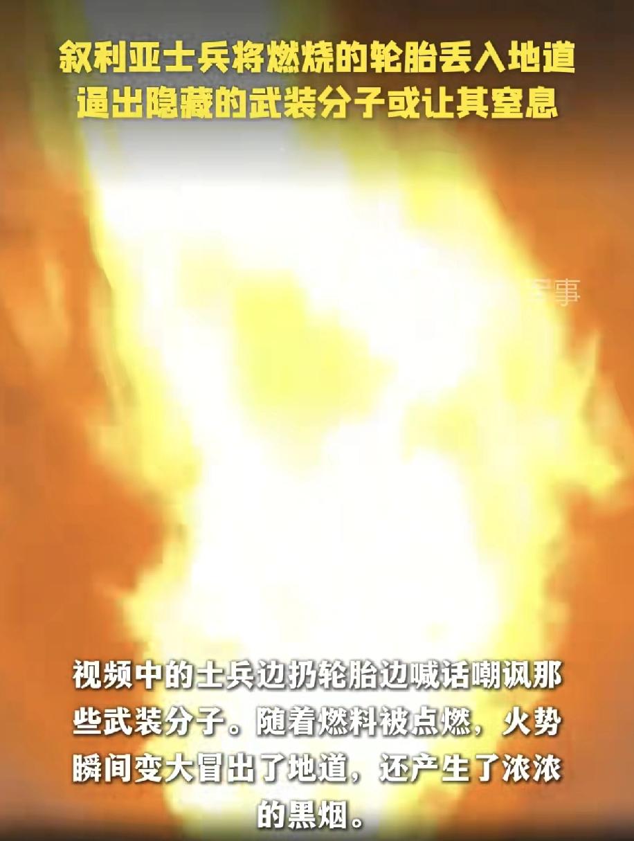对付地道战,以色列犹太人很怂,但同样信奉真主的人知道怎么对付他们。 当库尔德武装分子躲进坑道时,叙利亚士兵用点燃的轮胎扔进坑道,再加入汽油和水,一下子坑道就浓烟滚滚,躲在里面的武装分子要么出来投降,要么窒息而死,关键这出口这样被火堵住,里面的人怎么能够出来呢!这就是奔着物理消灭去的,库尔德武装的人怎么都没想到同是叙利亚军队,怎么老美支持的沙拉队伍就那么残忍,而巴沙尔简直就是仁慈代名词了。