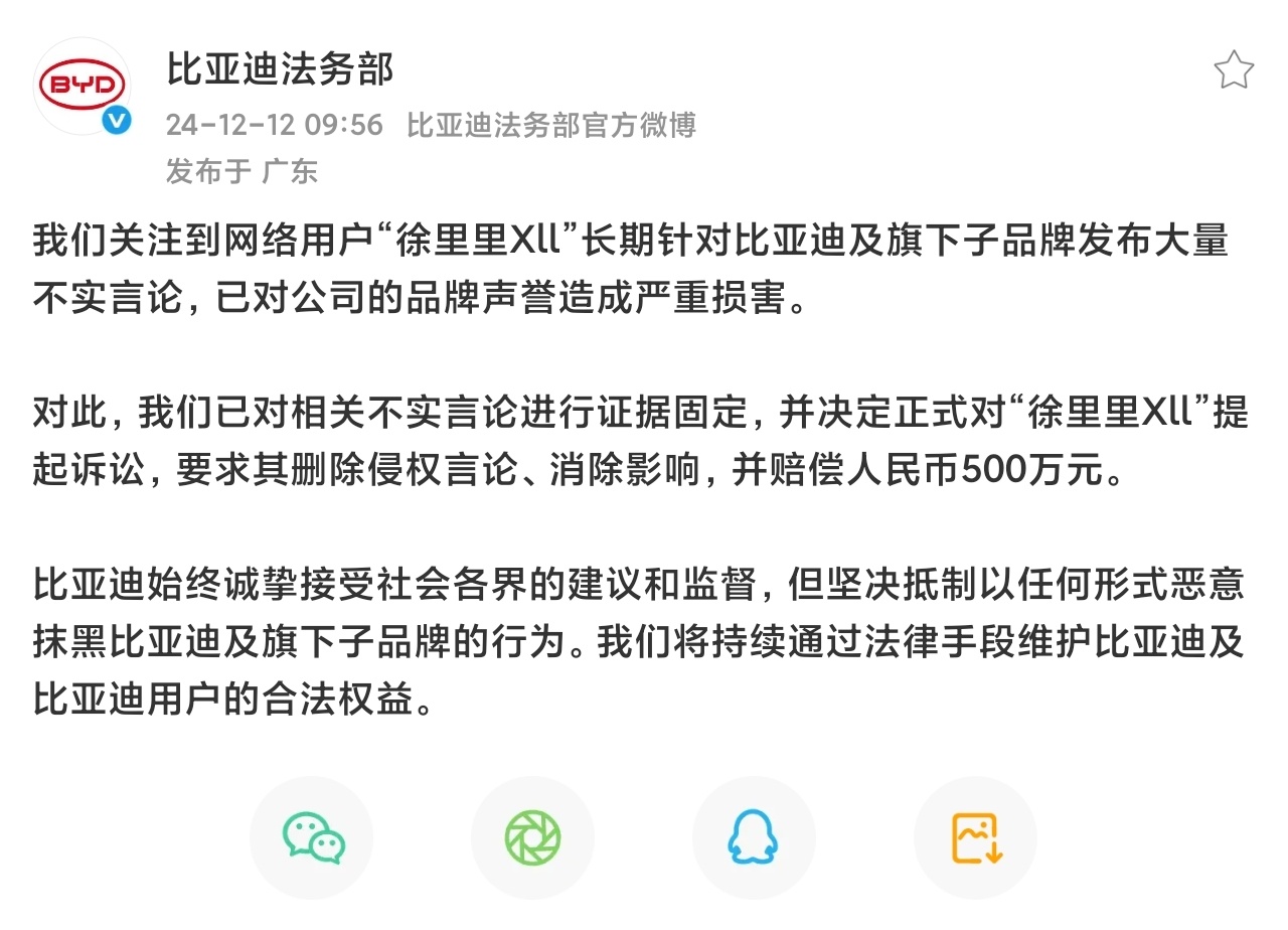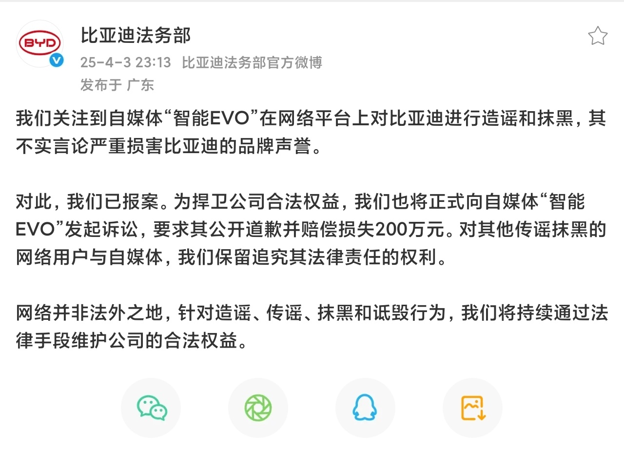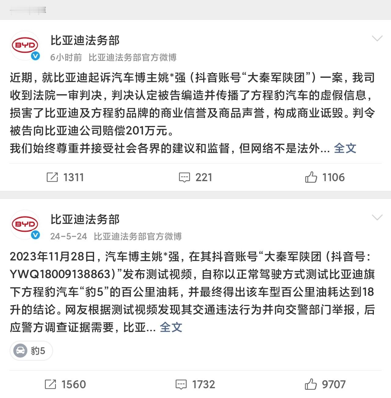 又是200万,比亚迪杀疯了,目前已经有龙猪201.87万元;姚十八,201万元;龙哥讲电车、满格电新能源,各200万元;王悟空说车31.38万元。目前,比亚迪起诉的已经有这几个出结果了,正义不会缺席,后面还有一批在路上,想想都刺激,有些人慌的一批吧,我看了下,接下来有可能是只能徐里里和智能EVO,这两个索赔金额也不少,最终判赔估计也是百以上了。所有车企的法务都应该向比亚迪看齐,尤其是被黑的比较惨的还有小米,干是真的干,不跟你玩虚的。比亚迪起诉大秦军陕团获赔201万