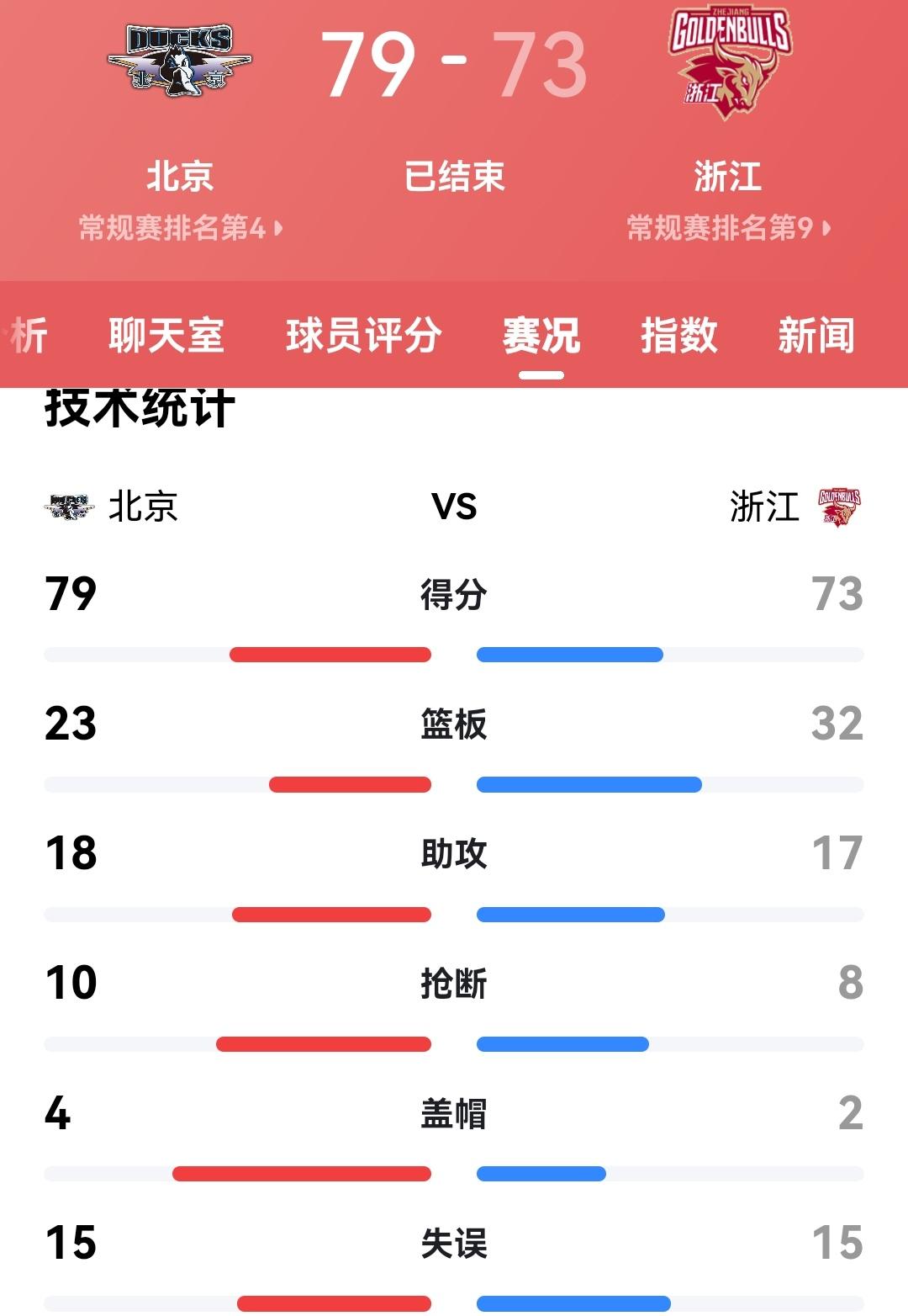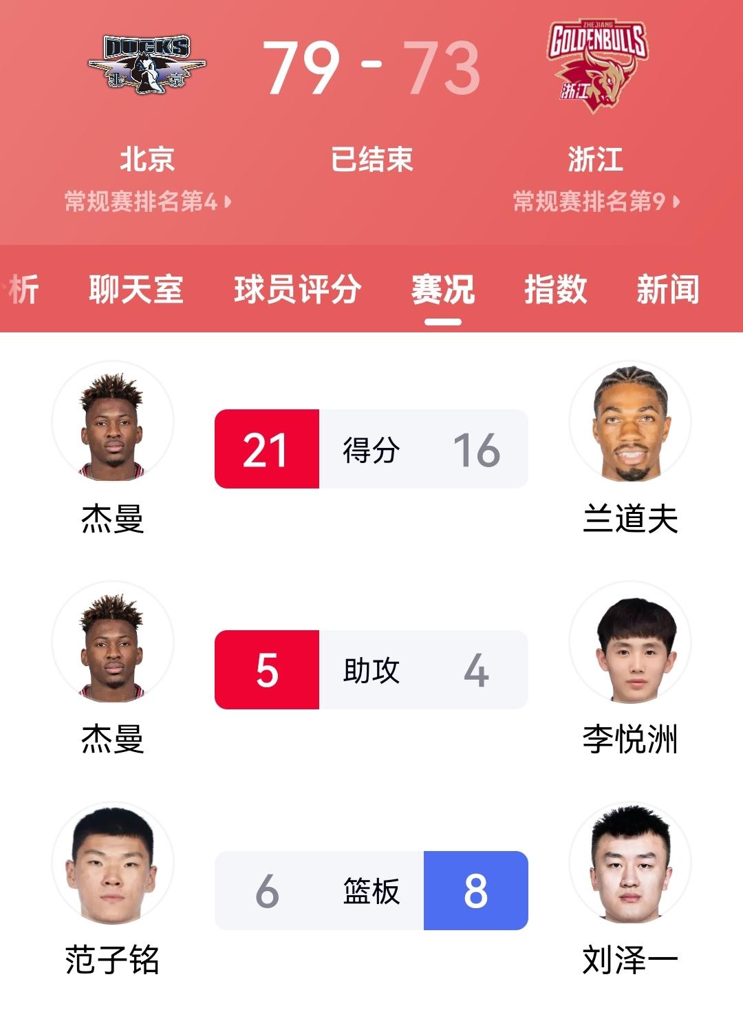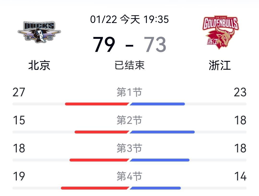 CBA常规赛第18轮:北京北汽79:73险胜浙江稠州金租 北京时间1月22日19:30分,CBA常规赛第18轮,北京北汽主场迎战浙江稠州金租。上半场双方打的难解难分,北京北汽42:41领先浙江稠州金租。全场比赛结束,北京北汽79:73险胜浙江稠州金租。 第一节,北汽陈盈俊3分命中,浙江约翰逊两罚一中,陈盈俊3罚命中。浙江约克3分命中。范子铭两分打进,马帝昂两分打进。浙江吴前3分命中,把比分追到7:10。陈盈俊3分命中,两分打进得到11分。北汽3分命中,浙江兰道夫还以颜色。北汽连续两分打进。浙江两罚命中。北汽3分命中,浙江陆文博两分打进,3分命中。北汽贝利两罚命中。浙江张洪硕两分打进,陆文博两分命中,兰道夫两分打进。第一节结束,北汽27:23领先。 第二节,浙江3分命中。北汽两分打进。浙江两罚一中,北京杰曼抢断上篮两分打进。浙江两分命中,两罚命中,双方战成31:31平。浙江张洪硕两分打进。北汽叫了暂停。陈盈俊两分命中、马帝昂两分打进。浙江兰道夫3分命中,北汽马帝昂打成2+1,陈盈俊抢断上篮两分打进。兰道夫3分命中,琼斯两分打进。陈盈俊两罚命中。第二节结束,北汽42:41领先浙江稠州金租。 第三节,浙江3分命中,两分打进。北汽马帝昂两分打进。浙江琼斯两罚命中,张洪硕两罚命中,浙江50:44领先。琼斯两分打进。马帝昂还以颜色。约克两分打进,雷蒙还以颜色。陈盈俊两罚一中,马帝昂两分打进。张洪硕两分打进、加罚命中。马帝昂两罚命中。兰道夫两分打进。杰曼3分命中。雷蒙两罚一中,杰曼压哨3分命中。第三节结束,北汽60:59领先浙江稠州金租。 第四节,北汽两分打进,两罚命中。兰道夫两分打进。杰曼超远3分命中。刘泽一两分命中。范子铭两罚命中,雷蒙两分打进。刘泽一连续两分打进。雷蒙3分命中,范子铭两分打进,兰道夫3分命中。杰曼两分打进。刘泽一3分命中。全场比赛结束,北京北汽79:73战胜浙江稠州金租。 北京北汽杰曼得到21分、陈盈俊18分、马帝昂得到15分;浙江稠州金租兰道夫得到16分、陆文博12分、琼斯13分。北京首钢男篮 浙江稠州男篮