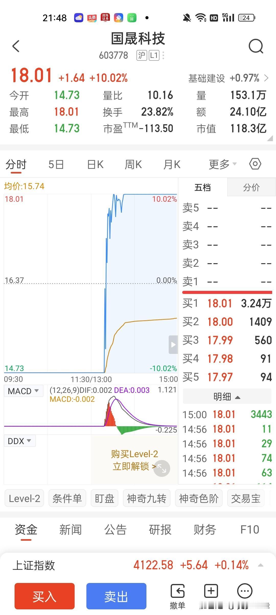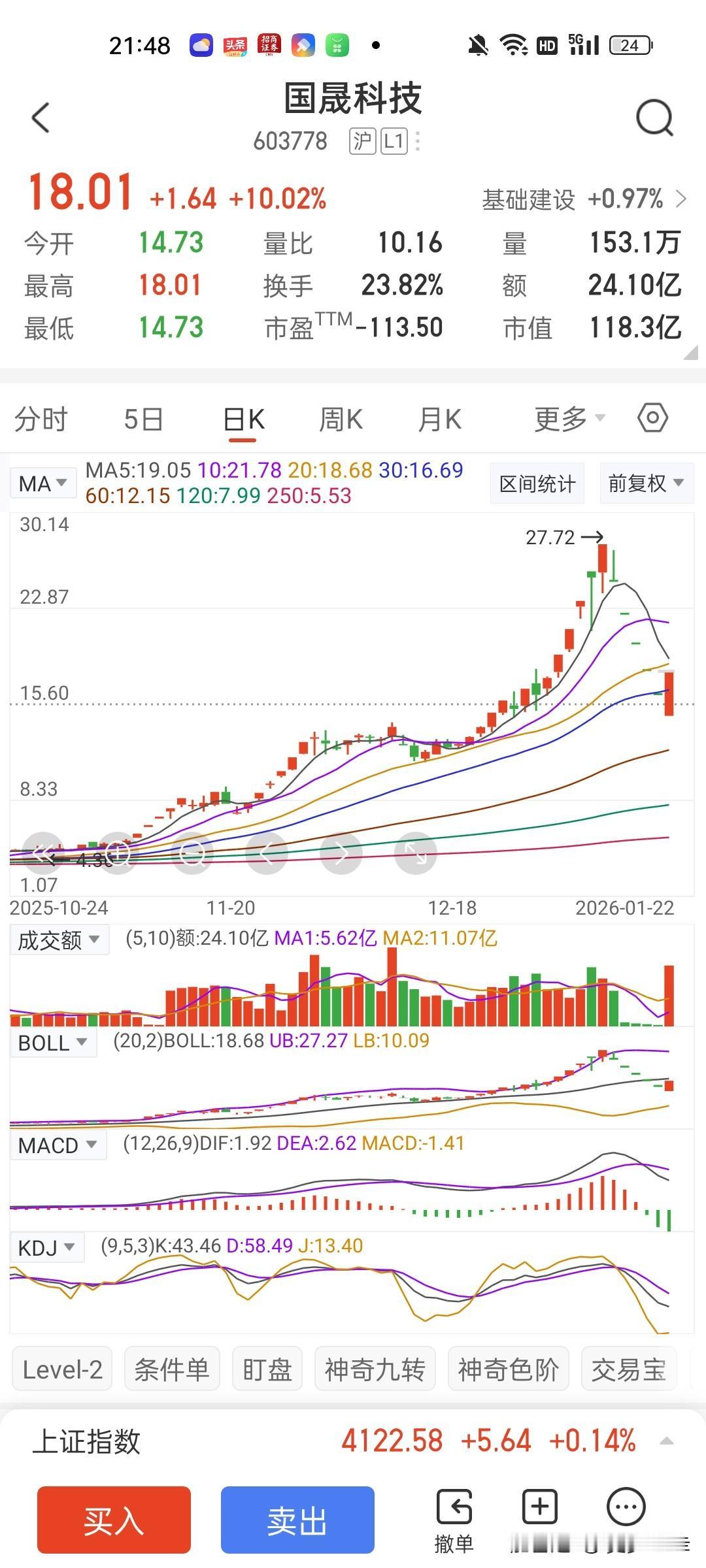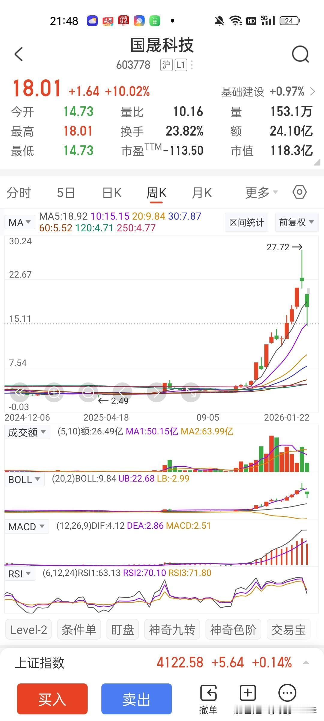 这只翻了10倍的妖股今天玩了一次地天板!股价直接从跌停拉到涨停,整整20%的涨幅。地天板的股票风险还是很大的,T+0还能买买,T+1买入,明天很可能继续跌停,卖都卖不掉。从周线看,该股股价下周继续下跌的风险还是很大,今天的涨停很可能是诱多。主力是自救,还是给里面高位套牢的散户最后逃跑的机会?