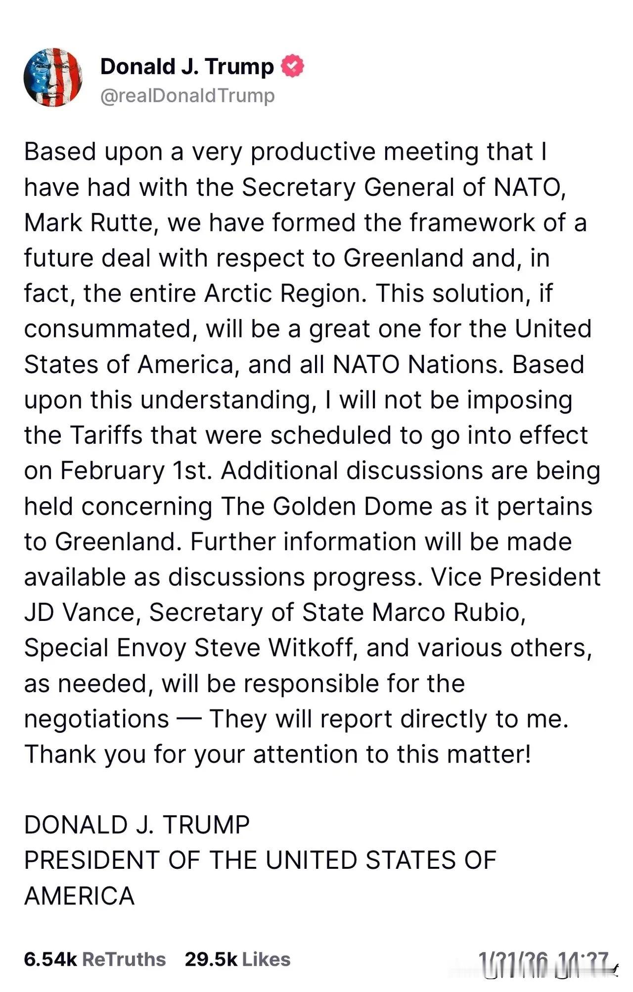 在与北约秘书长吕特会晤后,特朗普似乎放弃了“夺岛”的诉求,他宣布与北约就格陵兰岛达成框架协议! 和北约秘书长吕特见过面,特朗普对格陵兰岛的态度转了个弯。之前传得沸沸扬扬的“夺岛”说法,看样子是搁下了。他放出话来,已经和北约就格陵兰岛的事,达起了一份潜在协议 的框架。 “这不单是格陵兰的问题,更是整个北极地区的未来。”特朗普说得郑重,“真能成了,对美国,对所有北约国家,都是桩大好事。” 这话里藏着让步的意思,原定于2月1日生效的关税措施,他宣布不实施了。明眼人都看得出,这是为了给谈判铺路,不想把关系闹僵。 协议里提到的“金穹”计划,在格陵兰的相关讨论还在继续。具体要怎么推进,特朗普没细说,只说等谈得差不多了,会再放消息。 跑腿的人也定了:副总统万斯、国务卿鲁比奥、特使威特科夫,这几位要扛下具体谈判的活儿。能让这几位出面,可见美国对这事儿的看重。 格陵兰岛的分量,不止在冰天雪地下面的资源。北极这几年成了香饽饽,航道、资源、战略位置,哪一样都让人眼热。美国和北约凑在一起谈,打的恐怕不只是格陵兰的主意,更是想在北极圈里攥住点主动权。 北约国家心里怕是也有本账。跟着美国掺和,能分点好处?还是想借这机会,把北极的水搅得更浑?不好说。但特朗普愿意放下“夺岛”的硬茬,转用谈判的软招,多少说明单靠强抢行不通。 老话说“两利相权取其重”。美国松口关税,北约配合谈框架,说到底都是为了各自的盘算。只是格陵兰岛的未来,北极的格局,真能凭这一纸框架定下来?恐怕没那么简单。 冰原上的风刮了千百年,国际上的博弈也向来复杂。这份框架协议能不能落地,落地后又会掀起什么波澜,还得看这几位谈判的本事。但至少现在,剑拔弩张的气氛先缓了缓,这或许就是个开始。