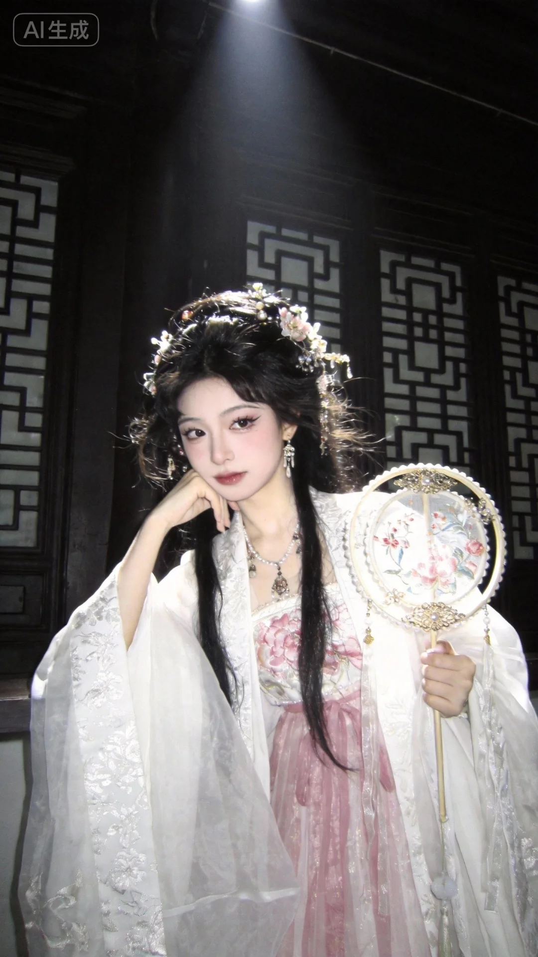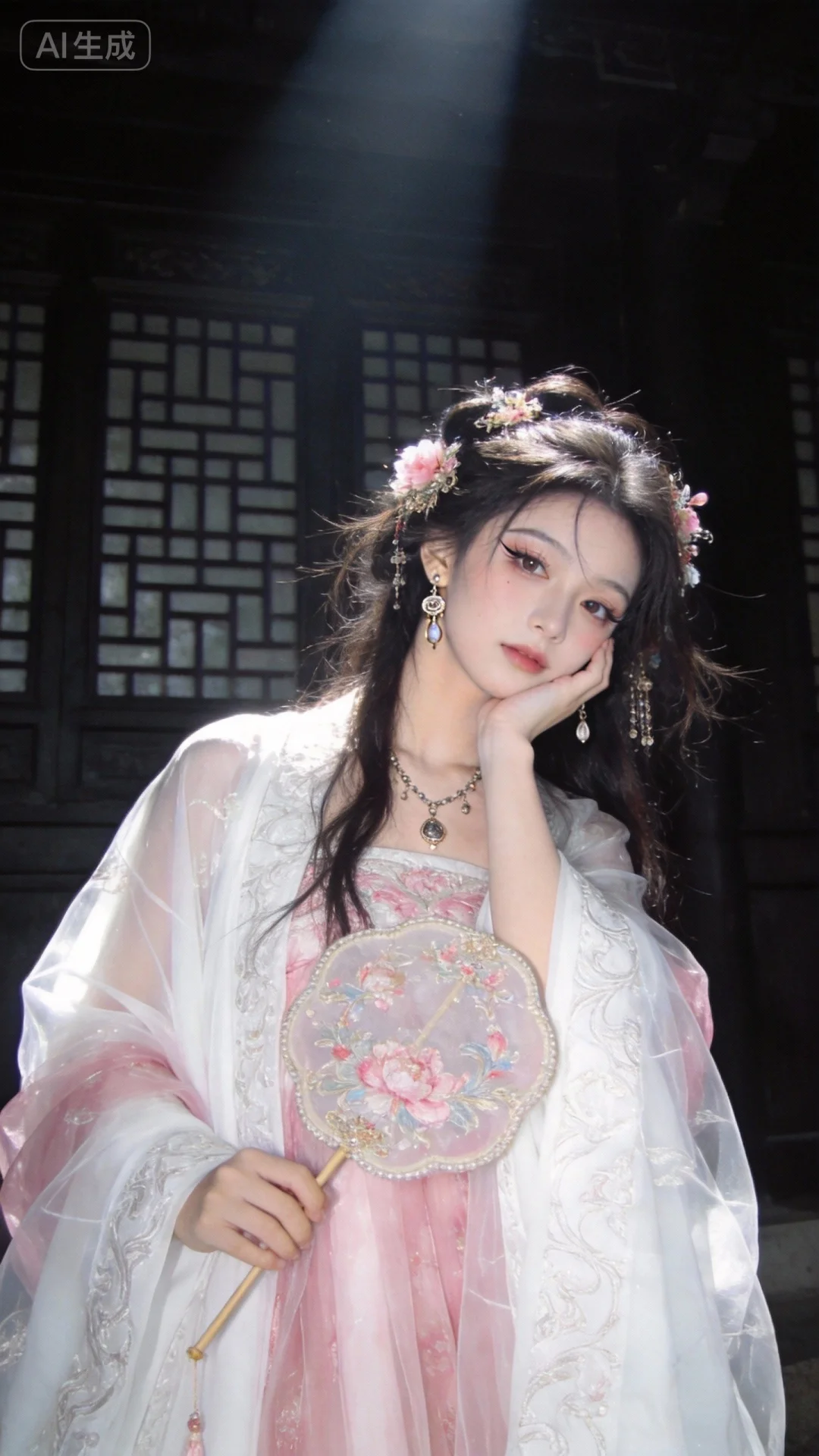 胶片摄影,镜头语言,淡彩,个性视角,美人,皮肤白皙光滑,倾国倾城容貌,穿繁复华丽的纱质唐制汉服,白粉色,发型华美,精致古风唯美发型,灵动、慵懒、古风感精致妆容,整体呈现萌系古风贵族少女,拿着漂亮精致的团扇、自然动态姿势、精致的发饰、项链及耳环,自然场景,令人惊艳的构图,细节丰富,光线明暗交接,大师级笔触,高对比度,高颜值,既视感,暗朦,光,层次丰富,写意,光的美学,高级感,杰作真人写真风格,身着白色织金纱衣战国袍的桃花眼公主,眼尾细长,身上佩戴着精致的饰品,长发略显凌乱却不失美感,单手托腮,姿态悠然。站在带有传统格纹门窗的深色古式建筑前,顶光营造出神秘氛围,竖构图增强画面纵深感,呈现出古朴宁静的感觉。