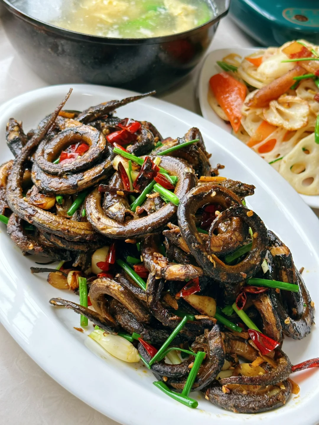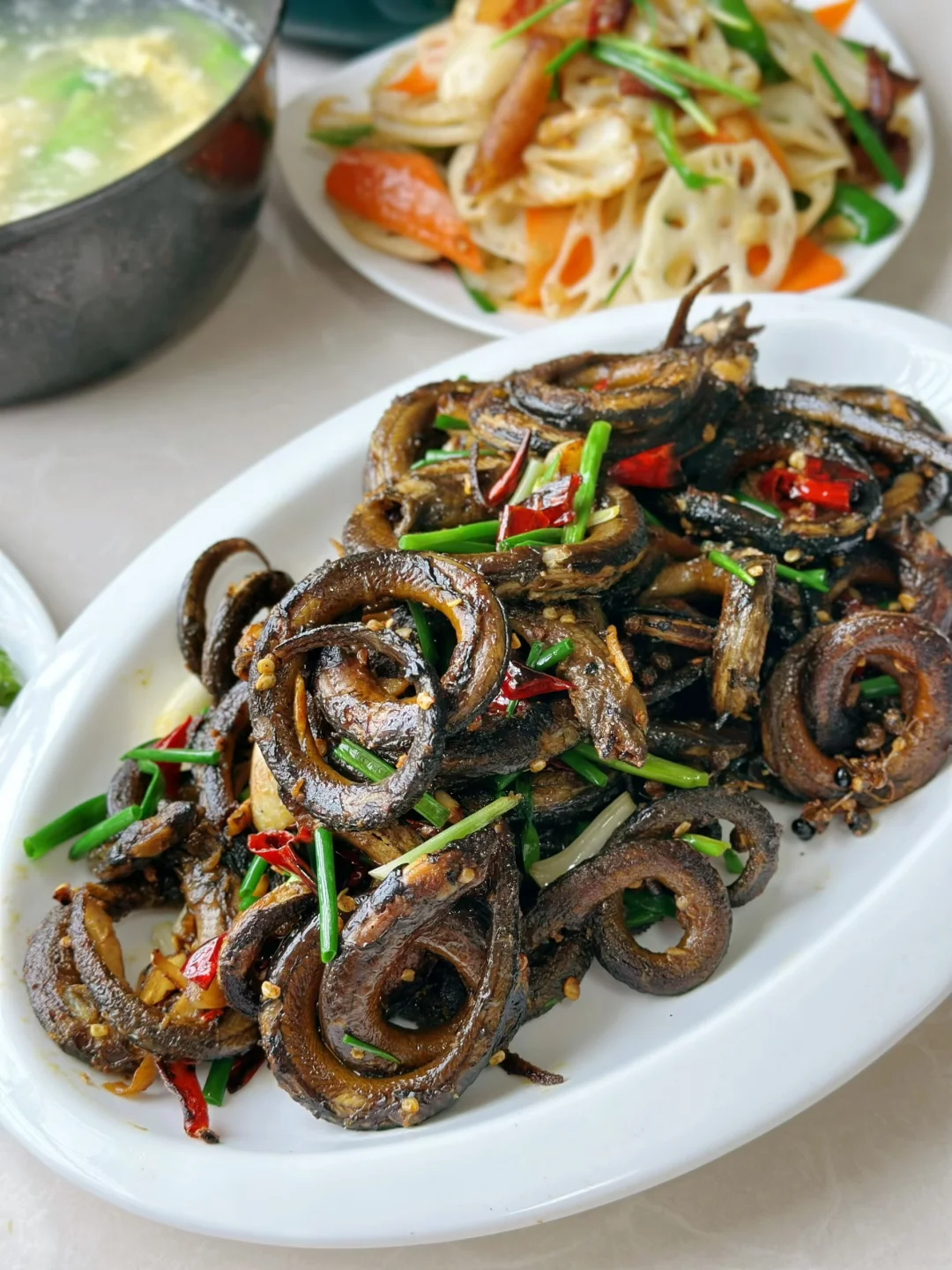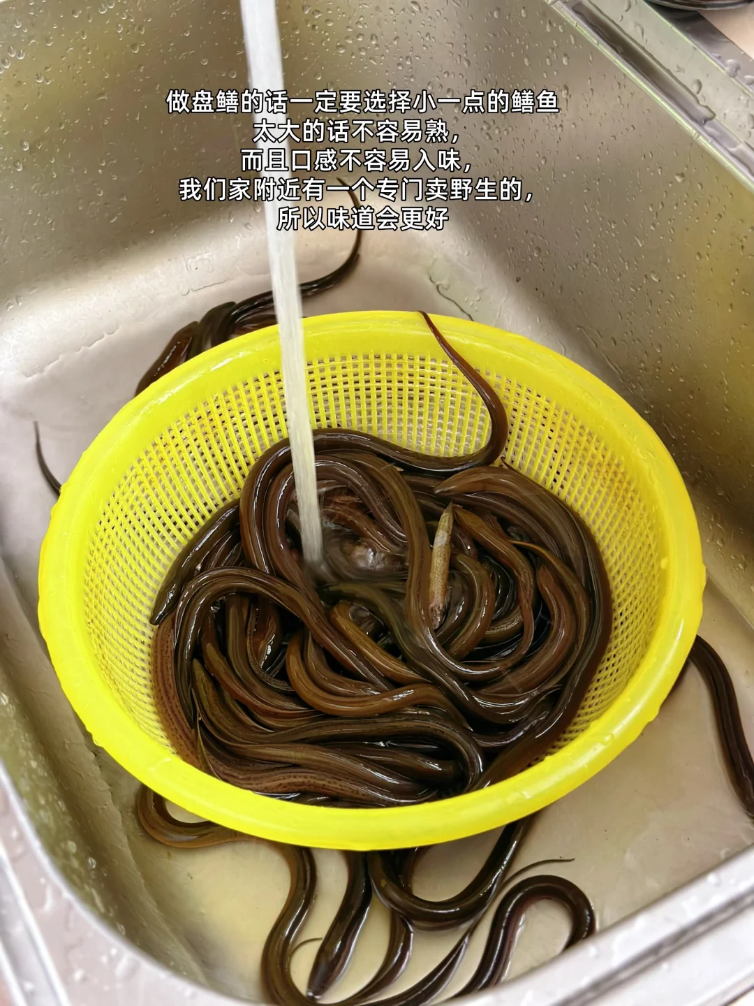 1. 做盘鳝的话一定要选择小一点的鳝鱼太大的话不容易熟,而且口感不容易入味,我们家附近有一个专门卖野生的,所以味道会更好