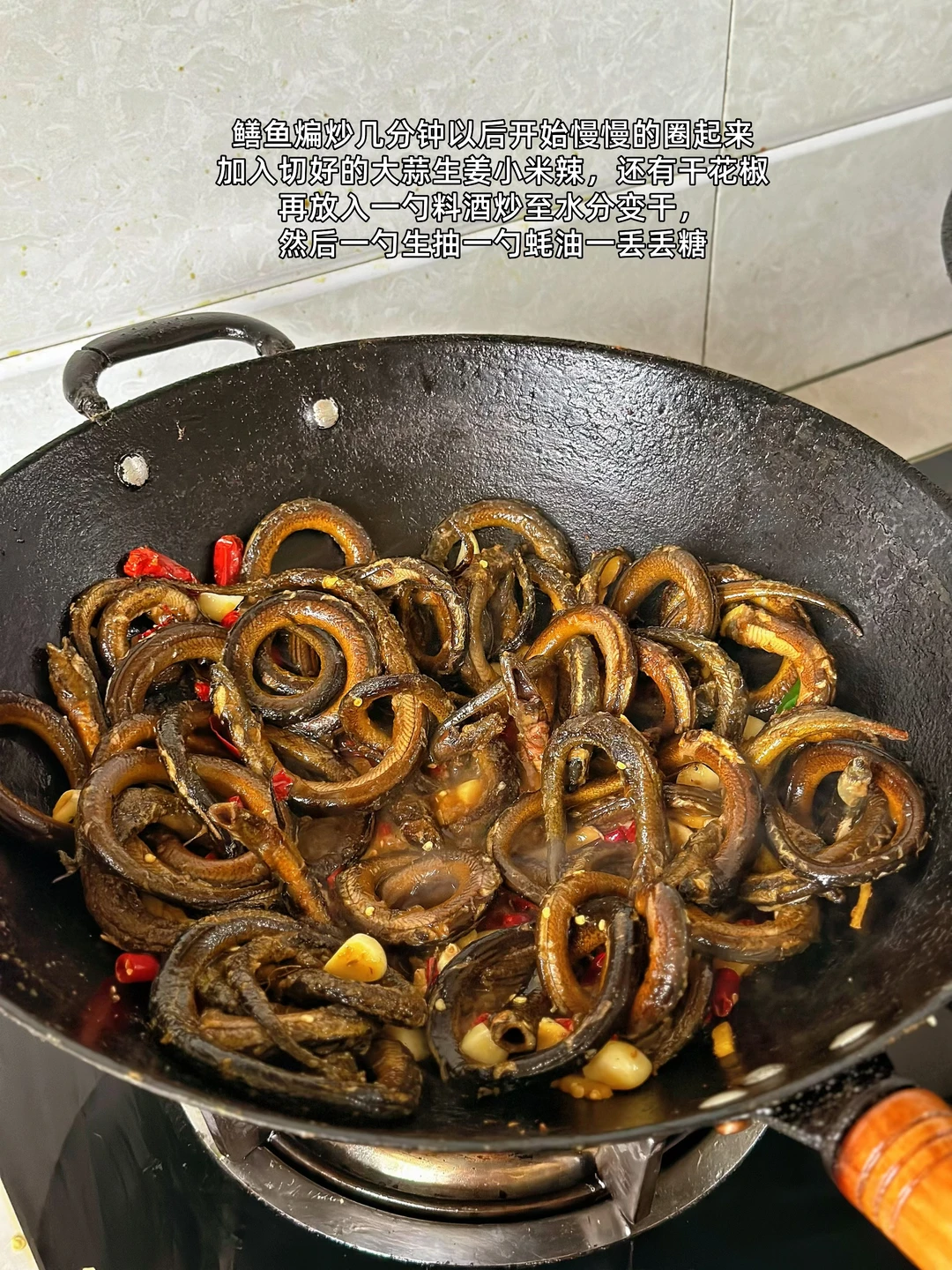 4. 鳝鱼煸炒几分钟以后开始慢慢的圈起来加入切好的大蒜生姜小米辣,还有干花椒再放入一勺料酒炒至水分变干,然后一勺生抽一勺蚝油一丢丢糖