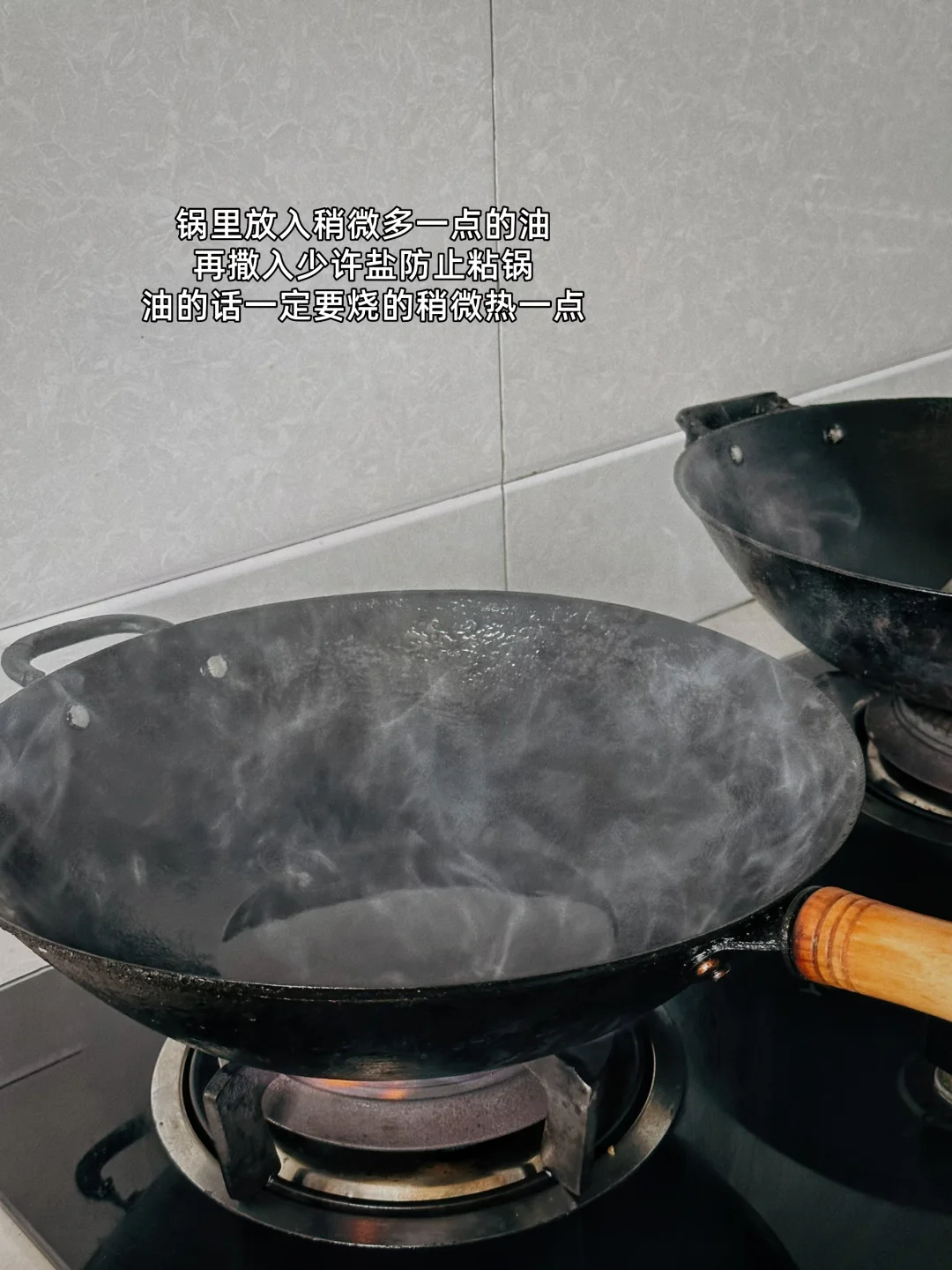 2. 锅里放入稍微多一点的油,再撒入少许盐防止粘锅油的话一定要烧的稍微热一点