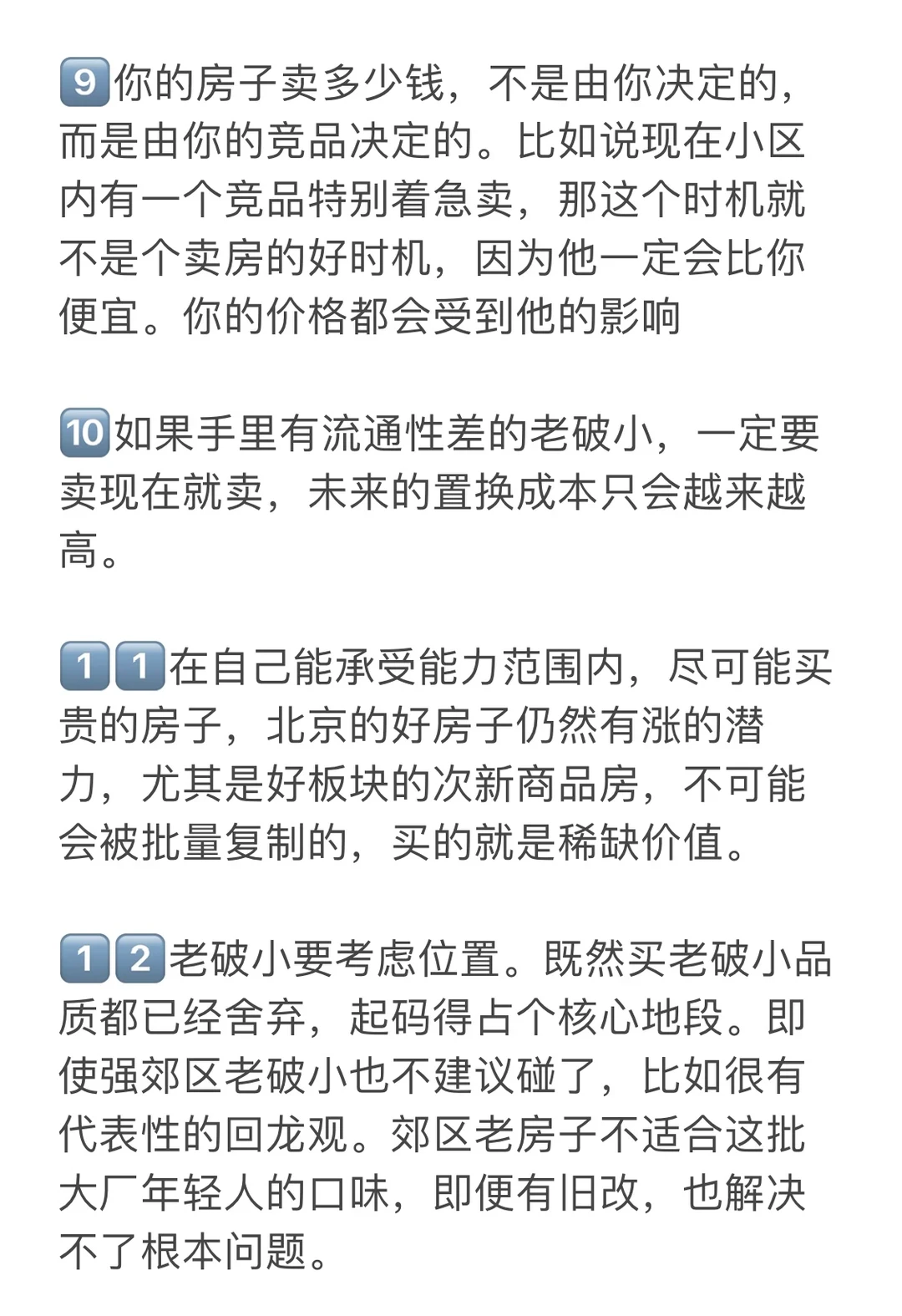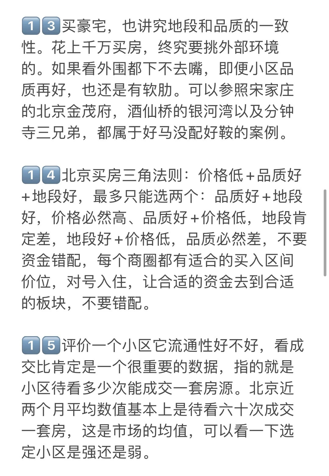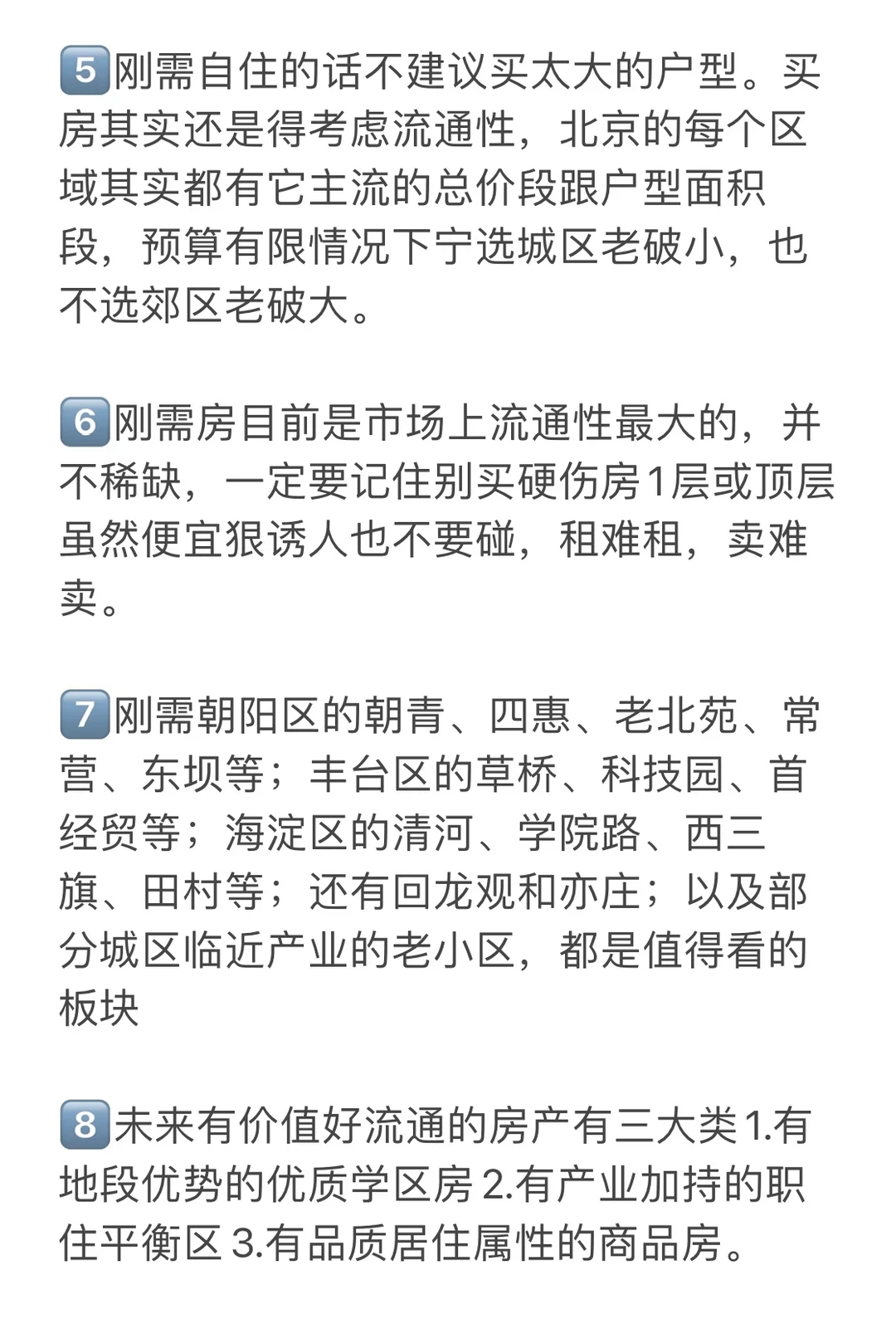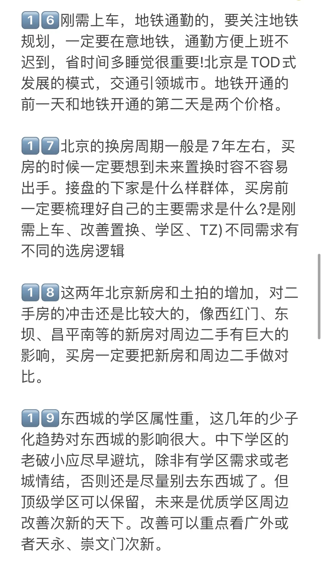2️⃣北京的换房周期一般是7年左右,买房的时候一定要想到未来置换时容不容易出手。接盘的下家是什么样群体,买房前一定要梳理好自己的主要需求是什么?是刚需上车、改善置换、学区、TZ)不同需求有不同的选房逻辑