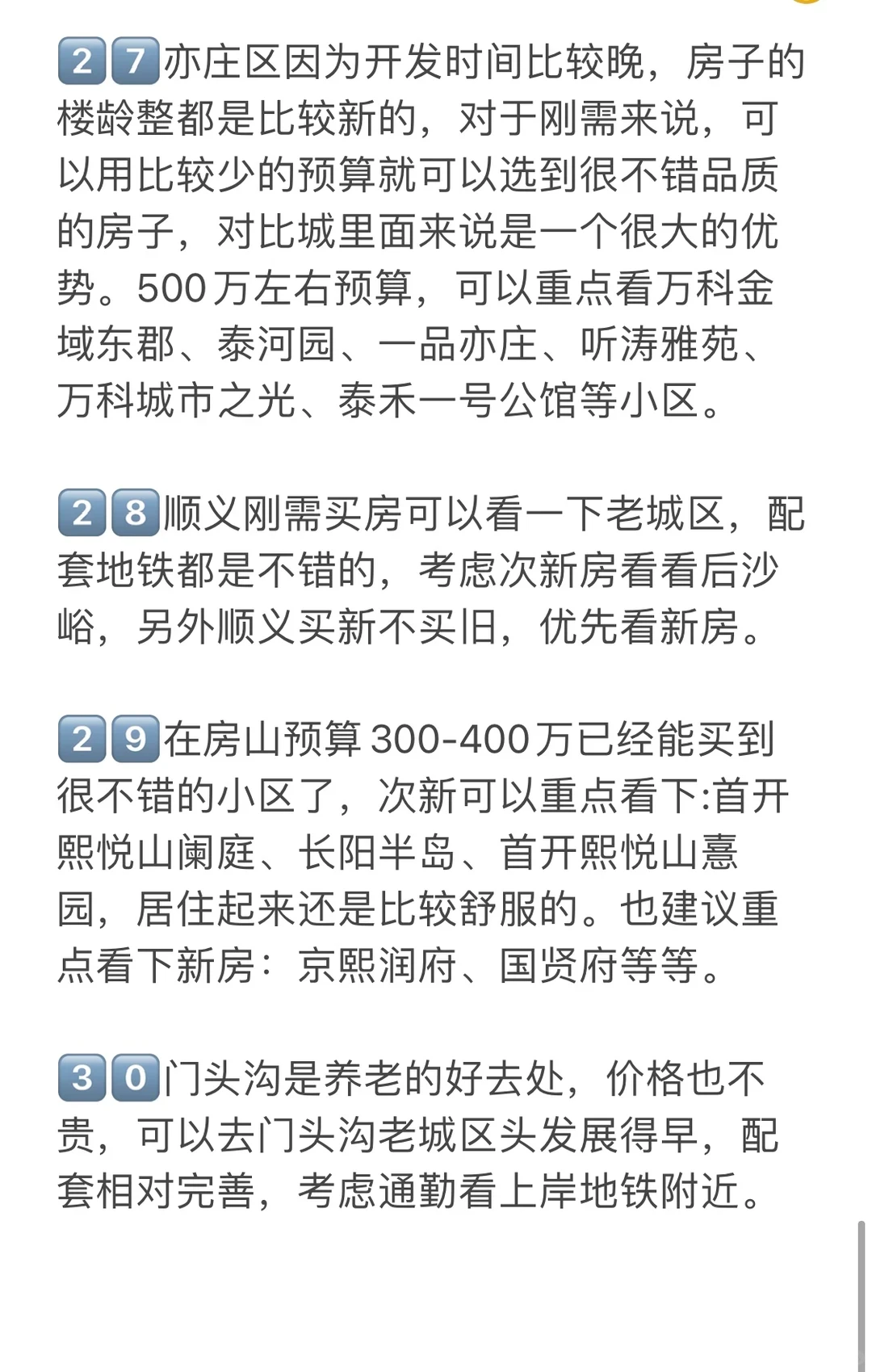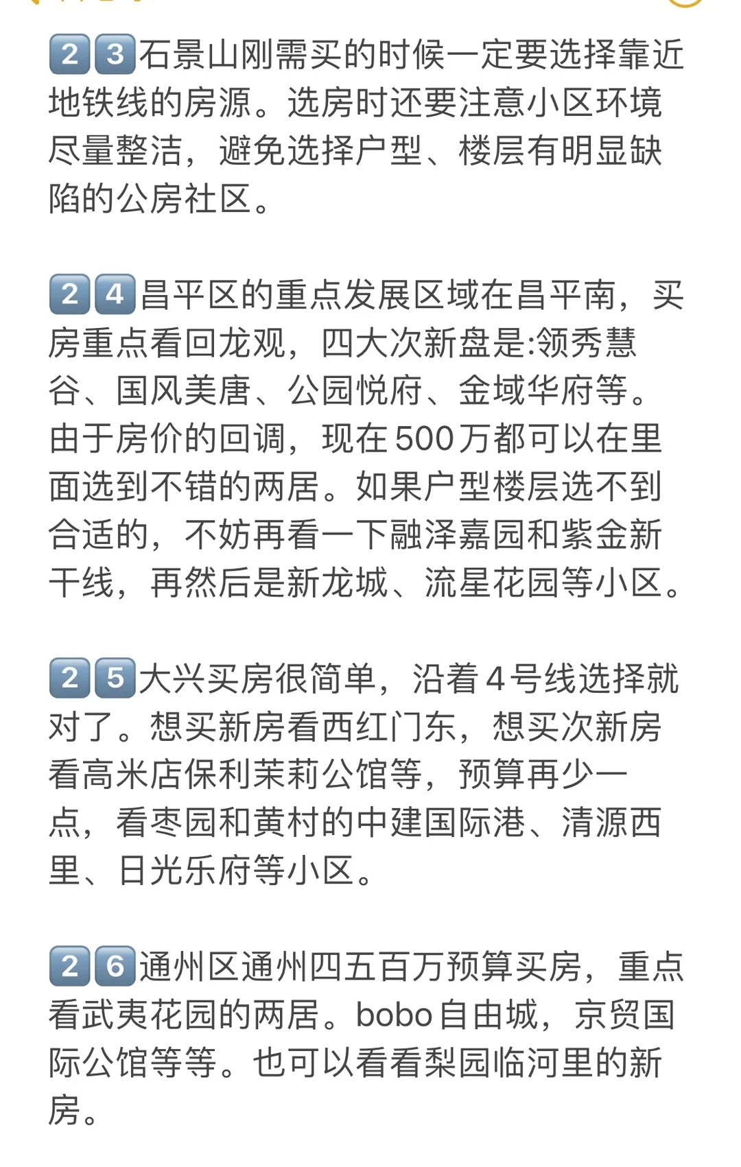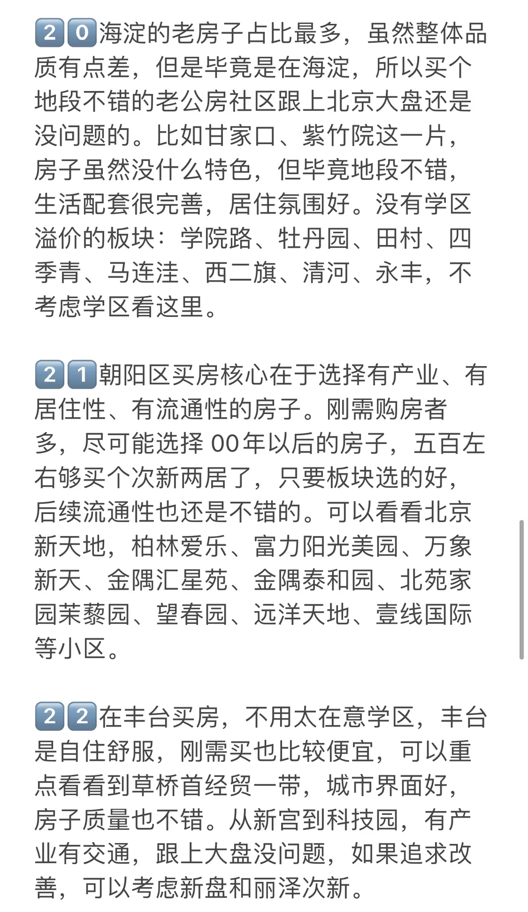 4️⃣东西城的学区属性重,这几年的少子化趋势对东西城的影响很大。中下学区的老破小应尽早避坑,除非有学区需求或老城情结,否则还是尽量别去东西城了。但顶级学区可以保留,未来是优质学区周边改善次新的天下。改善可以重点看广外或者天永、崇文门次新。