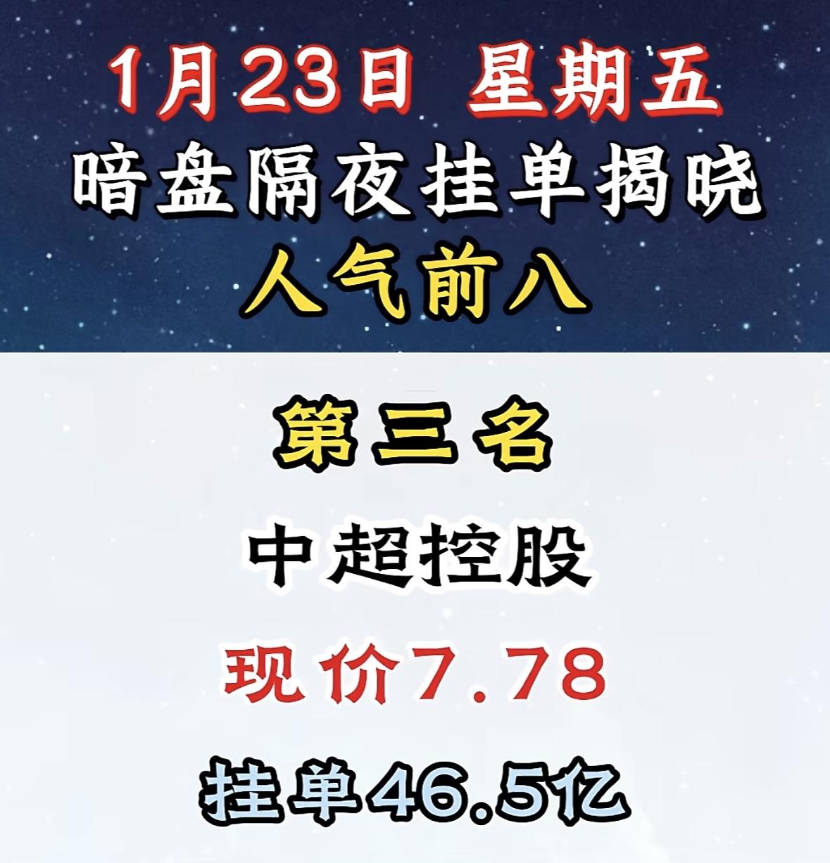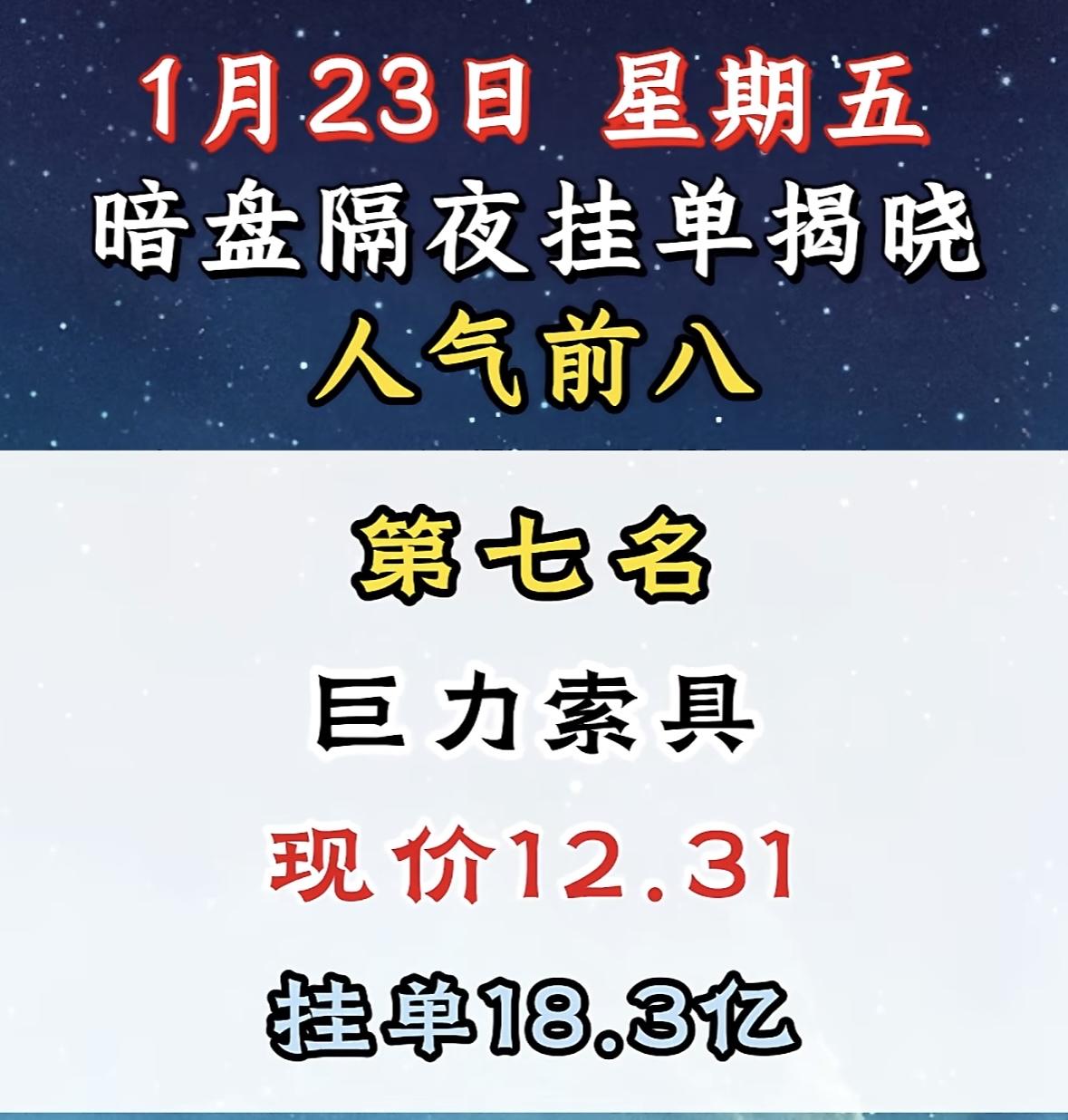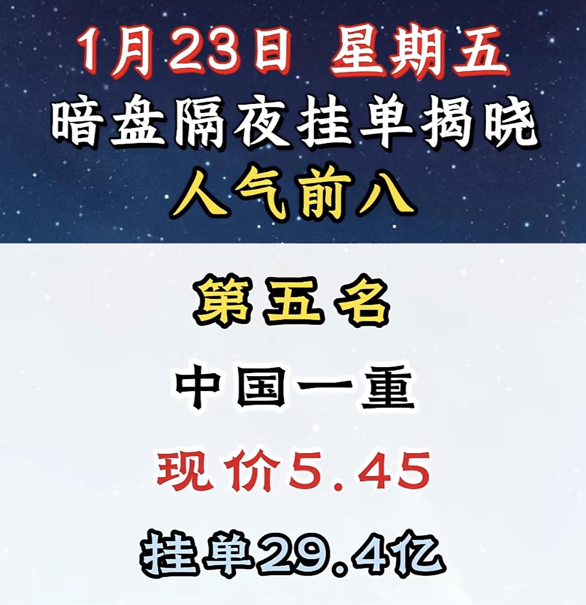 1月23日,暗盘揭晓,人气前八!中信重工现价8.00,挂单15.2亿! "利欧股份登顶人气榜首,暗盘表现抢眼,资金势头强劲。"