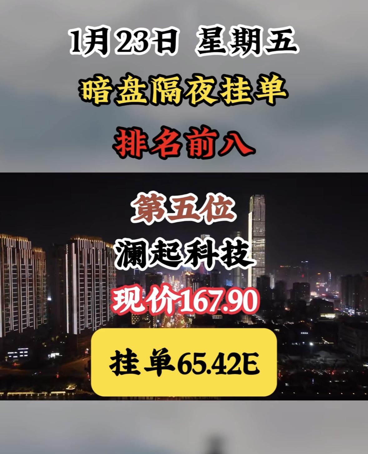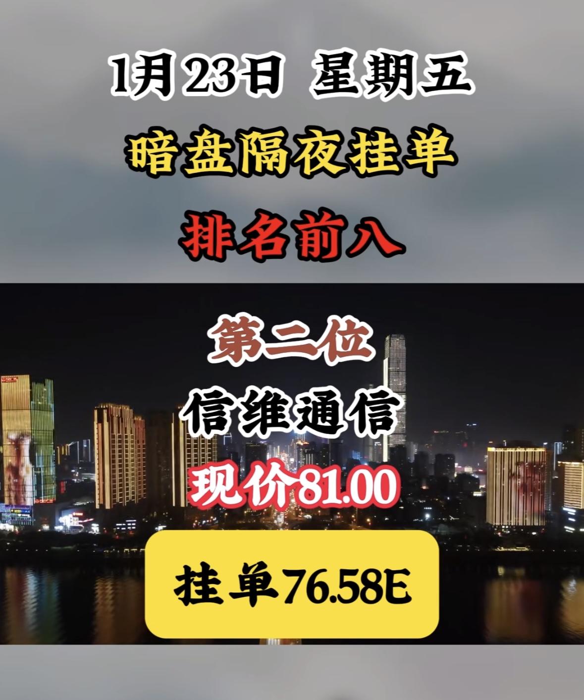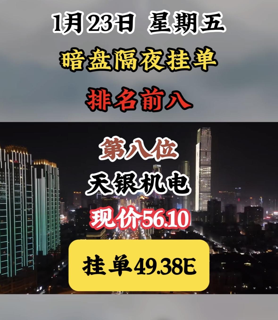 1月23日暗盘隔夜挂单榜,天银机电现价56.10,挂单49.38E "航天电子领涨暗盘,挂单活跃显强势,市场热度聚焦龙头,资金动向暗流涌动。" "航天电子领跑暗盘,挂单活跃现价坚挺,周榜前八表现亮眼。"