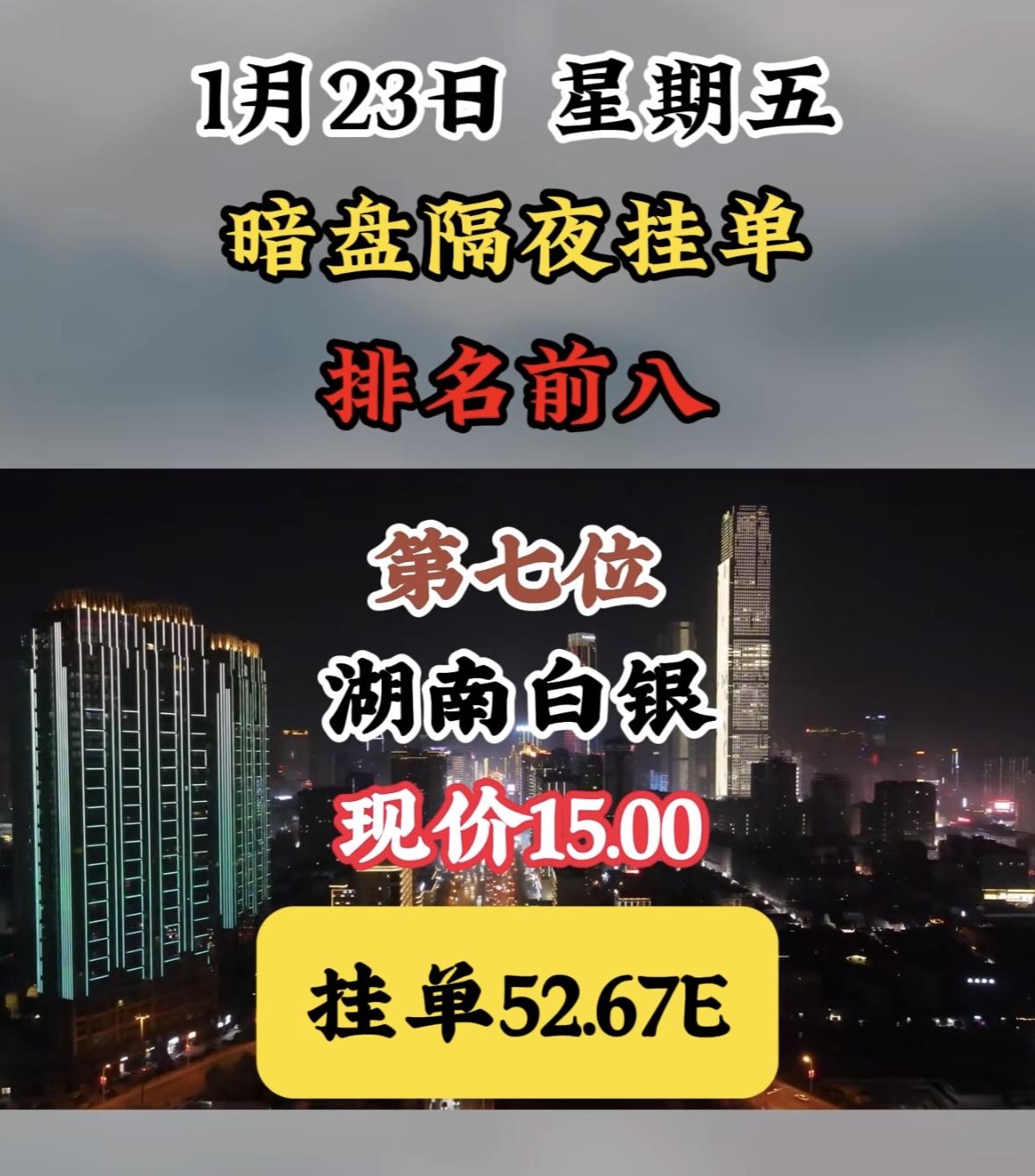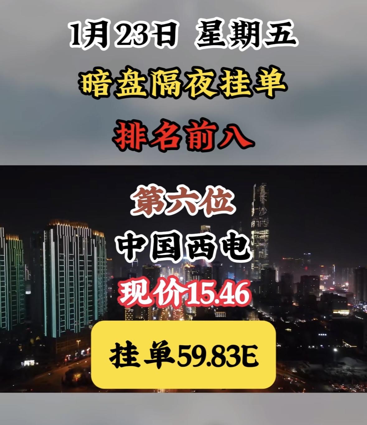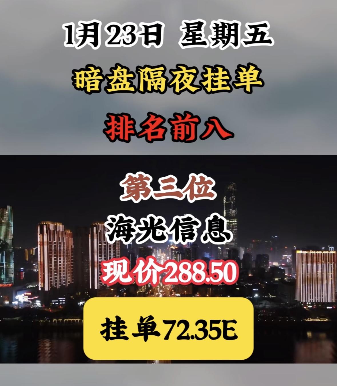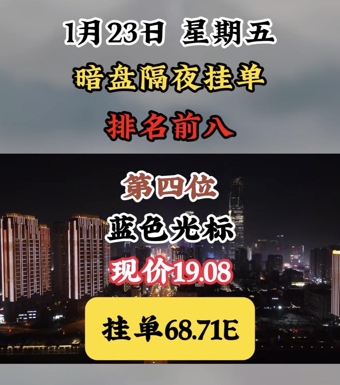 1月23日暗盘隔夜挂单榜,天银机电现价56.10,挂单49.38E "航天电子领涨暗盘,挂单活跃显强势,市场热度聚焦龙头,资金动向暗流涌动。" "航天电子领跑暗盘,挂单活跃现价坚挺,周榜前八表现亮眼。"