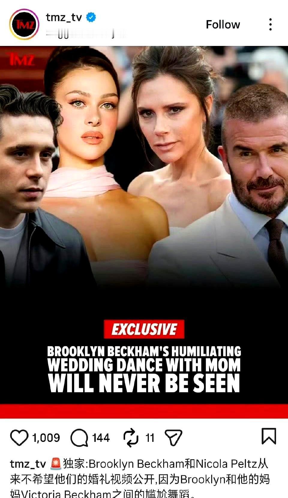 婚礼第一支舞被亲妈截胡,我直接拉黑全家 布鲁克林·贝克汉姆终于把憋了六年的怨气倾泻而出——母亲抢走他的舞曲,父亲逼他放弃姓氏,他不再陪演这场名为“家庭”的戏。 他晒出的六页长文,像一份冷峻的清算账单。一条条细数维多利亚如何在五百宾客面前强行拉他共舞,如何将新娘妮可拉晾在主桌之外,如何在婚礼前夜甩来一份放弃姓氏的协议。最刺骨的一句是:“我签字,他们才肯给祝福。” 妮可拉没花婆家一分钱,亲自耗时一年定制了Valentino高定礼服,仍被小报嘲讽为“仓促换款”。布鲁克林却说,真正的仓促,是亲情——说翻脸就翻脸,连个缓冲都不留。 2025年8月,两人重办誓言仪式,贝克汉姆全家缺席。布鲁克林把焦虑留在那个空位上,说自己第一次睡到天亮。随后寄去律师函:有事别找我,找纸。 大卫对媒体轻描淡写:“孩子得撞墙才长记性。” 维多利亚私下哭诉品牌价值下滑。网友翻出她早年采访:“家庭第一。”如今再看,第一的,是招牌。 亿万豪门最怕的不是丑闻,是长子亲手拆牌。布鲁克林这一步,踩碎的是滤镜,也是枷锁。