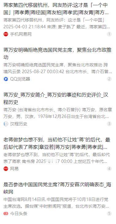 台北市市长、蒋介石的曾孙蒋万安直接把话撂下了!他当着媒体的面斩钉截铁地表示,自己绝对不可能去选下一任国民党主席。想当年蒋经国走了之后,蒋家在台湾政坛就慢慢没那么显眼了,到了第四代,蒋友柏、蒋友青这些人都躲着政治走,就只有蒋万安接了他爸蒋孝严的“政治活儿”。 麻烦看官老爷们右上角点击一下“关注”,既方便您进行讨论和分享,又能给您带来不一样的参与感,感谢您的支持! 2025 年 8 月 14 日,台北市市长蒋万安在出席公开活动时,面对媒体关于参选国民党主席的提问,给出了斩钉截铁的回答,明确表示自己目前完全没有考虑参选下一任国民党主席,将所有精力放在台北市政上。作为蒋介石的曾孙,蒋万安的这一表态,立刻引发台湾政坛和媒体的广泛关注。 蒋经国 1988 年离世后,蒋家在台湾政坛的影响力便开始快速消退,曾经的政治光环逐渐褪去,家族成员也慢慢淡出核心政治圈层。蒋家第三代的发展接连遭遇变故,无论是早逝的蒋孝文、蒋孝武,还是从商的蒋孝勇,都未能延续家族的政治荣光。 到了蒋家第四代,家族成员更是集体选择与政治保持距离,蒋友柏早早便放言 “不做蒋家第四代”,转身创立设计公司投身商界,这些年辗转两岸从商从艺,始终拒绝踏入政坛半步。蒋友青也曾因个人事件留下争议,更是直言不愿被祖辈的身份束缚,一心远离政治纷争。 蒋万安是蒋家第四代中唯一选择从政的人,他的父亲蒋孝严是蒋经国之子,曾担任国民党副主席等职,深耕台湾政坛多年。蒋万安早年赴美求学获法学博士学位,还曾在美国担任执业律师,2013 年返台后逐渐萌生从政想法,2015 年放弃美国绿卡正式踏入政坛。 从 2016 年当选台湾地区 “立法委员”,到连任立委并获评 “优秀立委”,再到 2022 年成功当选台北市市长,蒋万安的政治之路走得稳扎稳打。上任市长后,他推动大巨蛋开幕、推出民生相关施政计划,还延续双城论坛促进两岸交流,在台北市积累了不低的民意支持率,支持率超六成,高于国民党平均水平。 此次蒋万安拒绝参选国民党主席,并非毫无缘由的决定,背后是国民党当下复杂的内部现状。2025 年 10 月国民党将进行党主席改选,时任主席朱立伦早前释放交棒信号,可党内却鲜有人积极响应,热门人选卢秀燕等也选择专注地方事务,不愿卷入党务纠缠。 如今的国民党内部派系林立,斗争不断,还面临着基层党员流失、年轻人比例低迷、经费短缺等诸多问题。2024 年选举失利后,国民党的民意支持率大幅下滑,两岸政策摇摆不定,基层运作也愈发疲软,甚至还遭遇罢免浪潮,党内凝聚力和行动力都大不如前。 国民党主席之位虽有一定的象征意义,却早已被诸多既得利益集团和历史包袱所掣肘,坐上这个位置的人,往往难以推动实质性的改革,反而容易陷入无休止的派系内斗,消耗自身的政治精力。蒋万安显然看清了这一点,不愿让自己陷入这样的政治泥沼。 对蒋万安而言,当下最明智的选择,就是守住台北市市长的位置,专注地方治理。相比卷入国民党的内部纷争,踏踏实实地解决台北市民生问题,做出实打实的政绩,更能为自己积累坚实的政治资本,也能进一步稳固自己在民众心中的形象。 蒋万安的这个选择,体现出他对台湾政治现实的精准洞察,也反映出他对自身政治定位的清晰认知。作为蒋家第四代,他没有被祖辈的身份所绑架,也没有被眼前的政治虚名所诱惑,而是选择了最务实的从政路径,这在当下的台湾政坛中,显得尤为难得。 在台湾政坛的新一代政治人物中,蒋万安的做法也成为了务实从政的一个示范,证明了脱离无谓的派系争斗,扎根地方深耕民生,才是赢得民众支持的关键。他如今在台北市积累的民意基础和政治影响力,随着时间的推移,未来势必会成为台湾政坛中一股不可忽视的力量。 蒋家的政治荣光早已成为过去,蒋万安的从政之路,从未依靠祖辈的光环坐享其成,而是一步一个脚印靠自身努力走出来的。他拒绝参选国民党主席的决定,既是对当下局势的判断,也是对自己政治道路的规划,而他未来的政治发展,也将继续牵动着台湾政坛的目光。