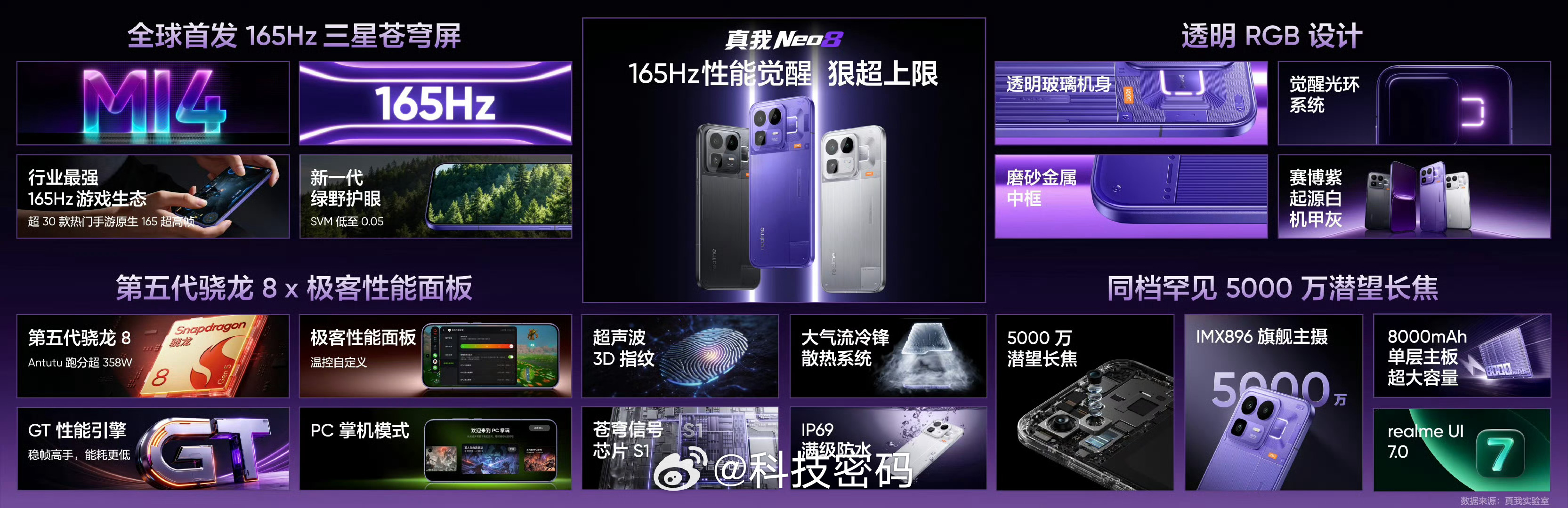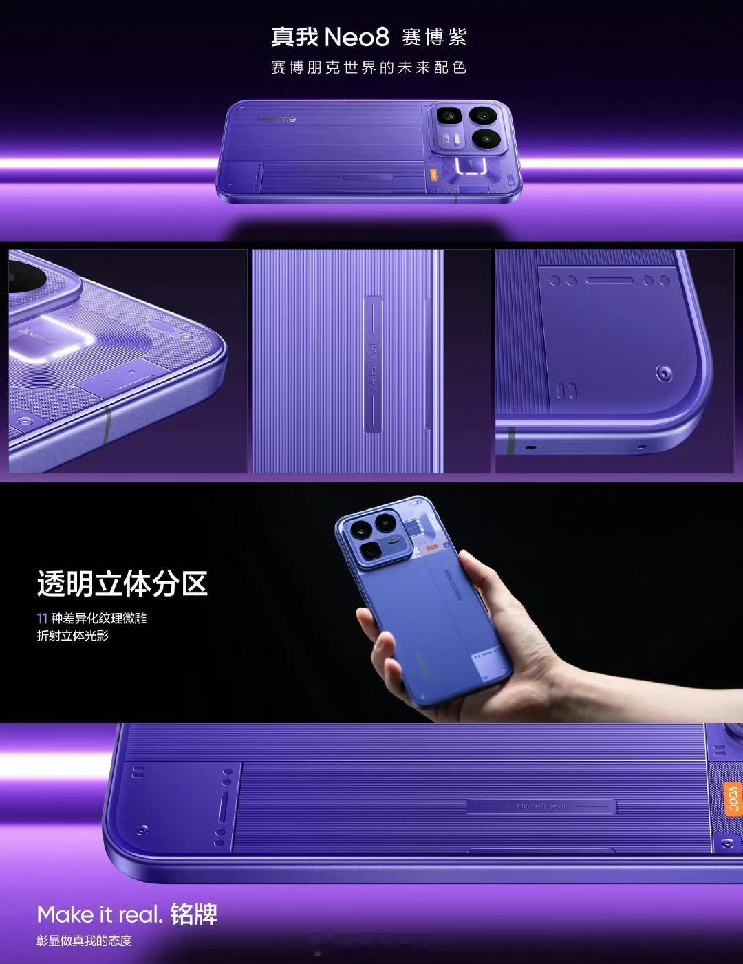 真我Neo8越级王炸发布!国补2039.15起!透明RGB设计单层透明立体工艺+机械浮雕纹理还有Make it real铭牌,翻转还能点亮幸运色!赛博紫、起源白、机甲灰三款配色165Hz三星苍穹屏超丝滑,适配30+手游高帧全亮度DC调光护眼,很护眼!第五代骁龙8+GT性能引擎,跑分350W+39225mm²散热厉害的!PC掌机模式能玩Steam游戏5000万潜望长焦拍照拿得出手!8000mAh泰坦电池两天一充,还提供了80W快充影像与续航双双越级,还有满级防尘防水等旗舰配置。还有16GB+1TB顶配版本,你喜欢吗?