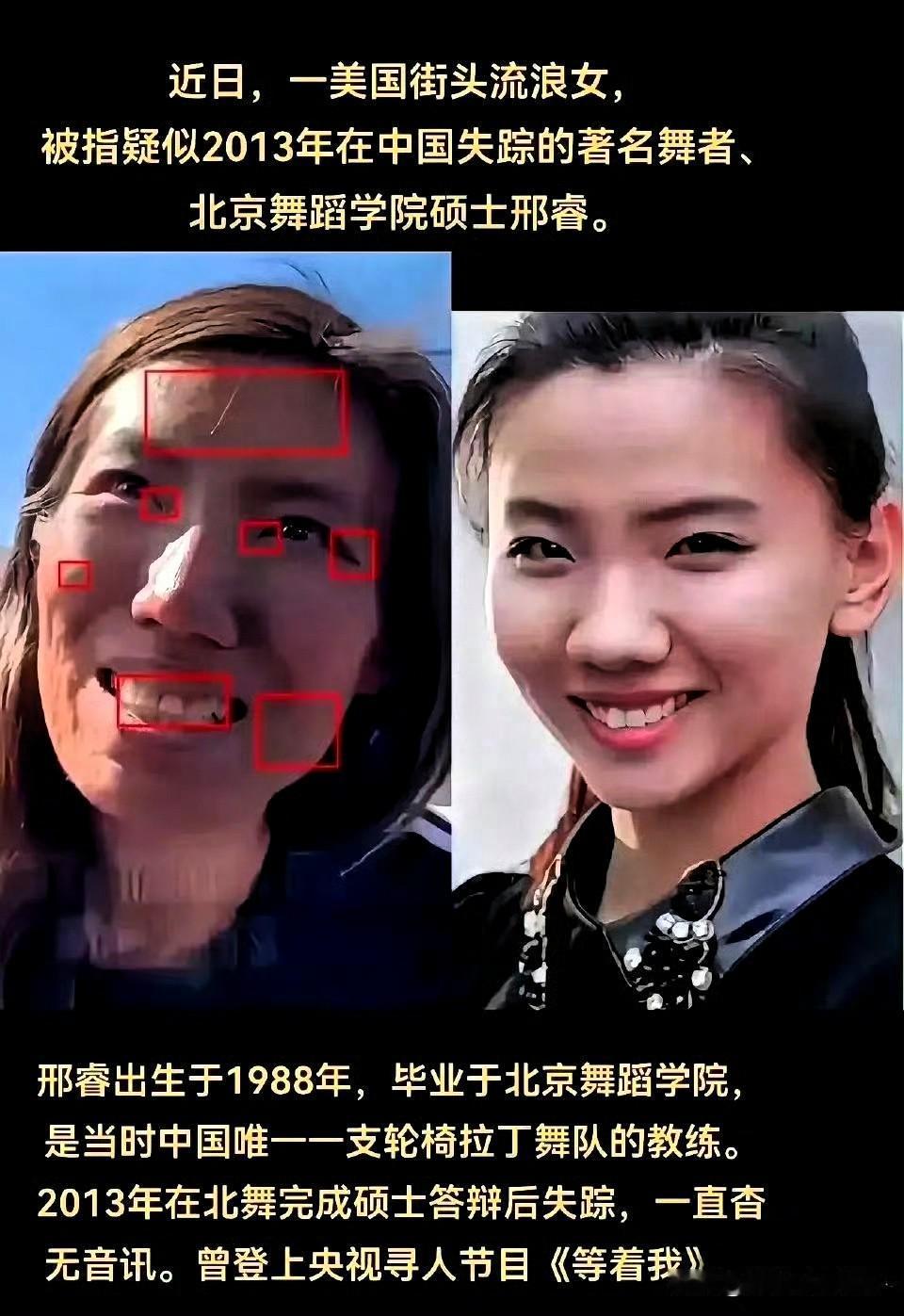 网络热帖疯传:洛杉矶贫民窟里那个眼神涣散、喃喃自语的亚裔流浪者,像不像十年前神秘消失的北舞“天才少女” 邢睿? 网友贴出对比图:侧脸弧线、眉骨高度、嘴角弧度几乎像同一张底片洗出的两张照片。 gif图里,一位女子头发打结、眼神涣散,面对镜头用流利的英语喃喃:我叫Leah31岁,亚洲 中国人,中学全是A……后来……”中文只会一些“你好”“谢谢”。她逻辑跳跃,被路人怀疑长期吸吸。 而网友截出的另一组图片,是2013年5月28日之前的邢睿:北京舞蹈学院硕士、国家轮椅拉丁舞队最年轻教练、论文答辩当天还笑着和导师合影。 当晚十点,她走出校门后像被夜色吞没,再没回家。父母把寻人启事贴遍全国,甚至登上央视《等着我》,镜头里母亲哭到几乎昏厥,却至今渺无音信。 数字侦探们兴奋划圈:年龄吻合、五官重叠率九成、失踪时间线能对上。 清醒者泼冷水:口音、教育背景、母语能力与“土生土长的北京姑娘”南辕北辙。 种种细节告诉我们:她们极可能是两张被命运误叠的面孔,而非同一人。 尽管如此,我仍把这条“乌龙”转给更多人。如果喧嚣能让一位失踪七年的名字重新被看见,让邢睿的父母再收获哪怕一条微不足道的线索,这场误会就值得。 (图源网络)