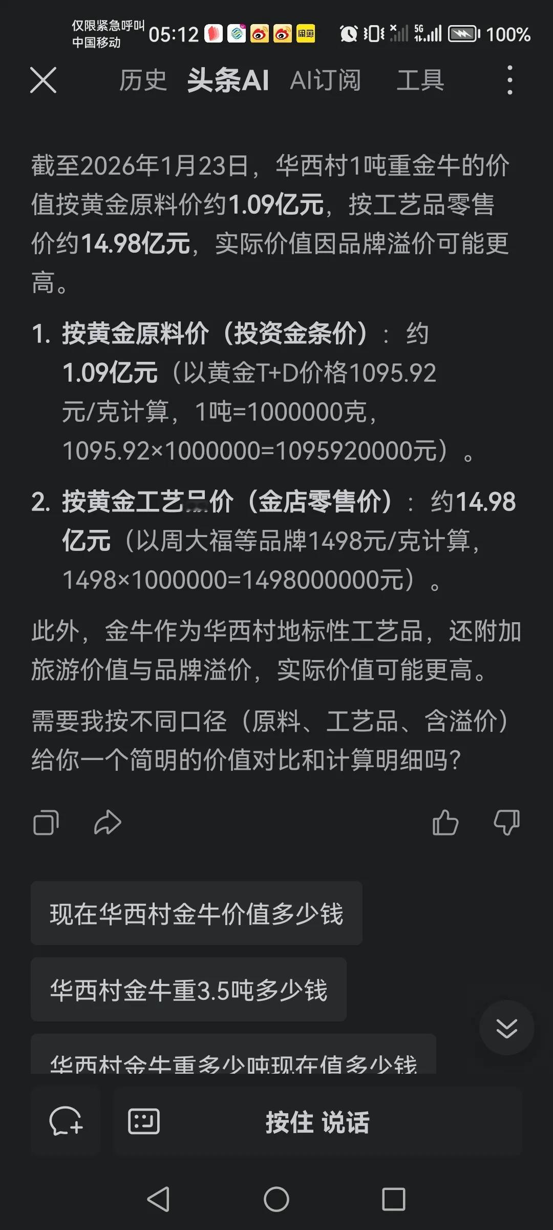 你说15年前就中国第一村的江阴华西村,现在光他们的第一高楼大厦里面的金牛都值十个多亿了。 现在还是很有钱的,当年这个三百多米高的地标就投资了三十多亿建的,这个楼顶的金牛重为一吨,现在不是可以拿去换钱化债吗!反正就是太有钱了,真的是超有钱的感觉。现在应该平帐了吧!以上仅供参考,属个人意见。