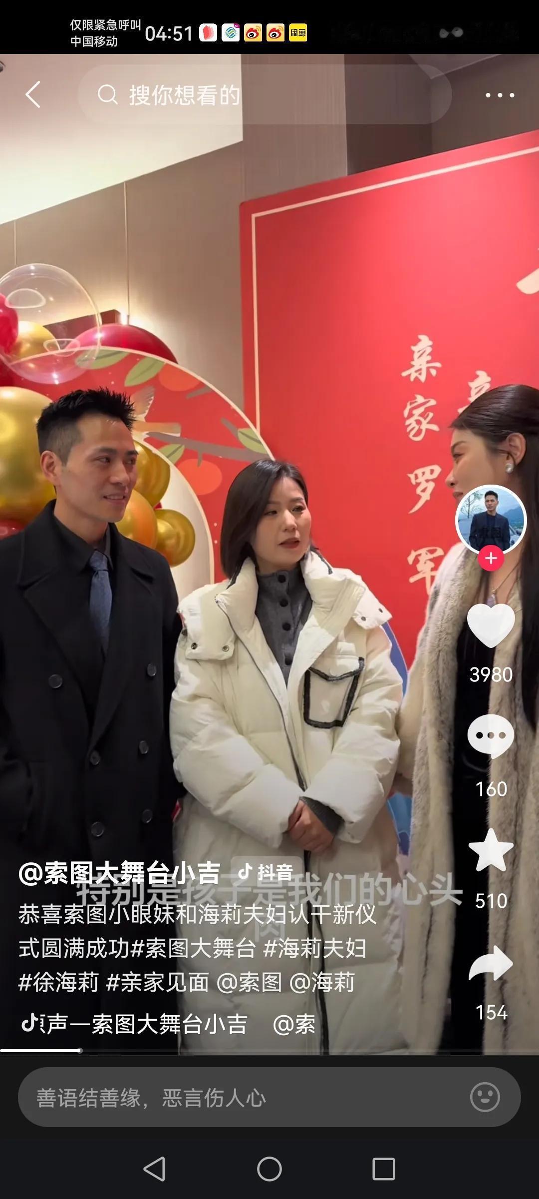 广州徐海莉来到重庆奉节,与索图女儿认亲家,两个都是流量大咖,索图是办大舞台的,海莉是电商女大侠,老家江苏的,现在住广州。看着索图与小毛丹的眼神是没有离婚的样子。希望是两个都心里还有对方。应该在不久的将来会复婚的,军娃子与丹娃子真的是很友夫妻相啊!索图也是在最近几个月好起来的,现在他说要抓紧工作,应该是说抓紧赚钱吧!机会来时,好好的把握吧! 希望她们会和好复婚的,以上仅供参考,属个人意见!
