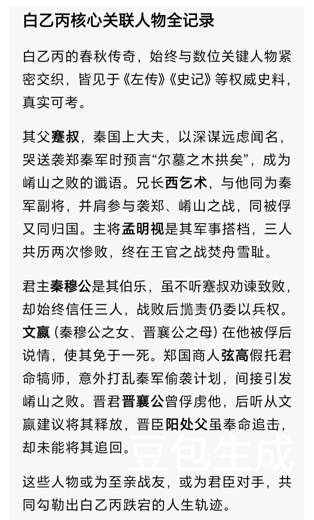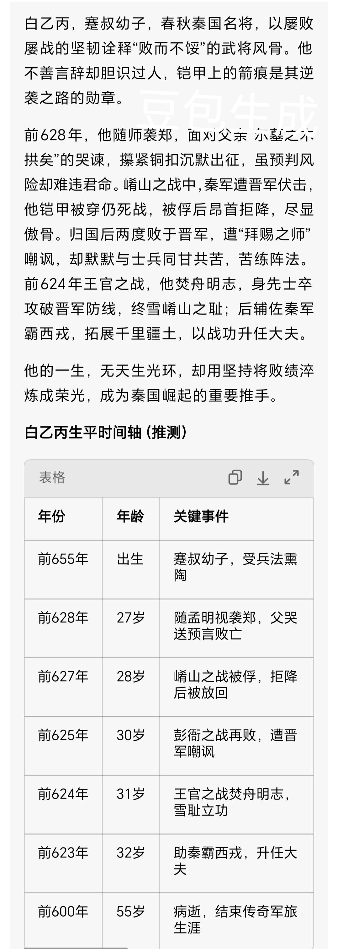 父哭崤山埋骨,两败成笑柄:秦将白乙丙凭何逆袭助秦霸西戎? 你以为名将必是一战封神?秦将白乙丙偏用一生证明:真正的强者,从不是从不跌倒,而是在跌倒后仍能劈开荆棘前行。春秋乱世,秦晋争霸正酣,这位蹇叔幼子带着父亲“尔墓之木拱矣”的悲泣出征,两度惨败沦为诸侯笑谈,最终却成秦国霸西戎的关键推手,其逆袭之路藏着最硬核的人生智慧。 一、出征:忠孝难全的沉默抉择 公元前628年的咸阳,秋风卷着渭水的凉意,三百辆兵车整装待发。秦穆公被“袭郑获利”的诱惑冲昏头脑,不顾上大夫蹇叔“晋人御师必于崤”的苦苦劝谏,执意东进。作为主将孟明视的副将,白乙丙站在队列中,听着父亲在城楼上撕心裂肺的哭声,字字如刀扎在心头。 他攥紧铠甲上的铜扣,指节泛白,却始终沉默不语。自幼受父亲兵法熏陶,他比谁都清楚崤山险谷的致命隐患,也深知“君命不可违”的春秋礼法。一边是父亲的预言与担忧,一边是秦穆公的信任与秦国东进的野心,这位不善言辞的将领最终翻身上马,背后是父亲日渐模糊的泪眼,身前是未知的刀光剑影。行军途中,他三次进言孟明视“严明军纪,谨防晋军埋伏”,却未能阻止士兵沿途劫掠的乱象,失败的种子早已悄然埋下。 二、被俘:绝境中未折的傲骨 当秦军行至滑国,郑国商人弦高的“犒师”之举,彻底戳破了偷袭计划。白乙丙当机立断建议“连夜回撤,避晋锋芒”,却因主将的犹豫错失良机——秦军顺手灭了滑国,带着劫掠的财物缓慢撤军,恰好给了晋军设伏的时间。 公元前627年春,崤山险谷成了秦军的炼狱。两侧山崖突然滚石如雨,箭簇如蝗,晋军伏兵呐喊着冲下山崖,将秦军切割包围。白乙丙挥舞长剑率军死战,铠甲被箭簇击穿数处,鲜血浸透衣袍,仍死死守住阵地,直至身边士兵所剩无几,才与孟明视、西乞术一同被俘。晋营之中,晋襄公的屠刀悬在头顶,文嬴说情才保住性命,面对晋军的劝降,他始终昂首不语,眼中的倔强让晋人暗自惊叹:“秦将虽败,傲骨未折。” 三、沉淀:两败后的卧薪尝胆 归国时,白乙丙与同伴光着上身、背着荆条,在朝堂上请罪。满朝文武的斥责声中,秦穆公却痛哭着扶起三人:“孤之过也,非尔等罪!”这份信任如重锤敲在白乙丙心上,他暗自发誓:必以胜绩洗刷耻辱。 可命运似乎专设考验,公元前625年彭衙之战,秦军再次惨败,晋军更是嘲讽他们为“拜赐之师”——暗指他们是靠晋国“恩赐”才活命的败军。朝堂上治罪的呼声再起,白乙丙却不辩一词,默默接过军权。此后三年,关中平原的晨光中总有他的身影:与士兵同吃糙米饭、同卧军营,天不亮便操练阵法,亲手绘制关中及西戎地形图谱,将两次惨败的教训刻进每一次挥戈、每一次布阵。他知道,真正的强大从不是逞一时之勇,而是在沉淀中打磨锋芒。 四、逆袭:烈火中重生的破局者 公元前624年,王官之战爆发。秦军渡河后,白乙丙主动请缨率先锋部队,当着全军的面烧毁渡船:“今日胜则归,败则死,绝无退路!”这一战,他褪去了往日的沉稳,身先士卒冲入晋军防线,长剑所指,士兵奋勇跟进,晋军节节败退,秦军直逼晋国都城绛邑,晋襄公紧闭城门不敢出战。 战后,秦军前往崤山收敛阵亡将士遗骸。白乙丙跪在白骨堆前,指尖抚过锈蚀的箭簇与破碎的铠甲,那些年轻的面孔在泪光中浮现。父亲的预言终成现实,却也成了他逆袭的烙印。此战之后,秦国东进受阻转而西拓,白乙丙凭借多年打磨的兵法谋略与对西戎地形的熟悉,辅佐秦军征服西戎十二国,开辟千里疆土,让秦国“益国十二,开地千里,遂霸西戎”。 白乙丙的一生,没有天生的光环,只有屡败屡战的坚韧。他用两次惨败证明:失败从不是人生的终点,而是沉淀实力的序章。春秋乱世,诸侯争霸,多少将领因一败而一蹶不振,唯有他在绝境中坚守,在沉淀中成长,最终活成了秦国崛起路上的坚实基石。 屡败屡战的坚守,与及时止损的智慧,哪个更值得我们学习?你如何看待白乙丙的逆袭之路?欢迎在评论区分享你的见解,喜欢历史人物故事的朋友别忘了点赞关注,后续解锁更多春秋传奇!东周列国志 秦穆公之臣 蹇叔之子