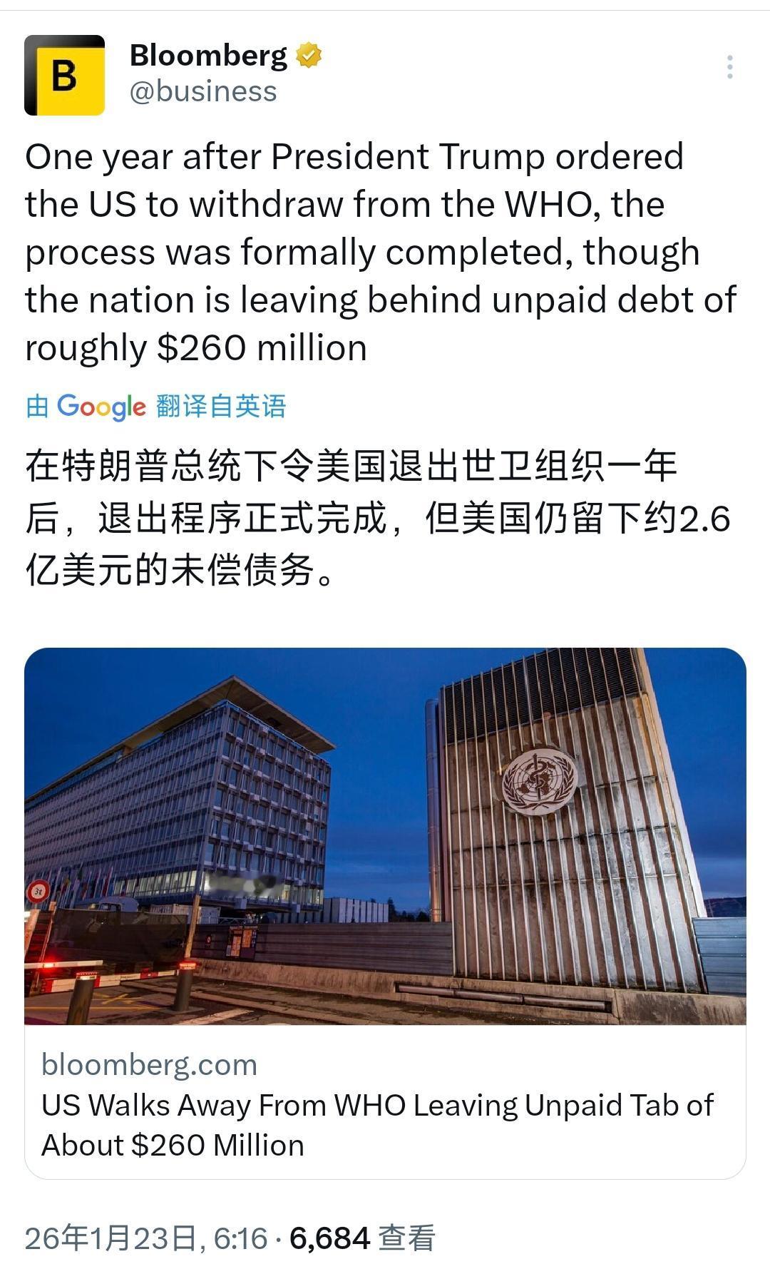 美国正式退出世界卫生组织!彭博社今天(1月23日)报道:“在特朗普总统下令美国退出世卫组织一年后,退出程序正式完成,但美国仍留下约2.6亿美元的未偿债务。” [机智]评几句:特朗普政府退出世卫组织的行径,是典型的美国优先、唯我独尊的霸权表现,不仅背弃国际责任,还留下2.6亿美元债务赖账不还,尽显无赖本色。全球公共卫生事业需要各国携手,美国却执意退群、逃避义务,将一己私利凌驾于人类共同利益之上。这种不负责任的做法,既暴露了美国的自私与短视,也让其国际信誉再遭重创,所谓的大国担当不过是虚伪的空谈。