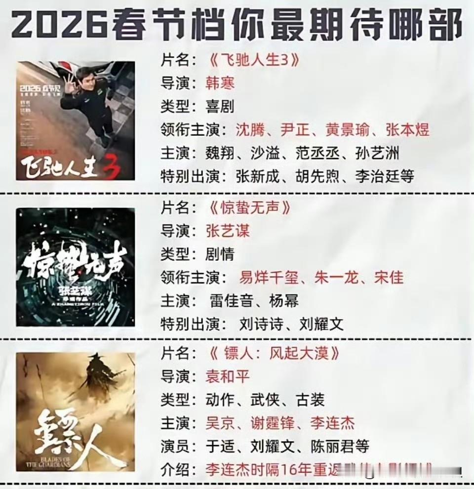 今年的春节档大概是近几年来,最「寡淡」的一年了。 目前定档的几部,「镖人」「惊蛰无声」「飞驰人生3」, 虽然都是大咖云集,实力派领衔➕流量🌸🥜打底, 但是很奇怪,这三部竟然没有一部,让我🈶买票进电影院的冲动。 尤其是飞驰人生3,它是目前预测票房最高的,预估在38-40亿之间。 不是很理解,这片子的受众群体到底是哪些人? 12都没有任何出圈的梗和片段,竟然加起来拿下了50亿的票房成绩?! 只能说,沈腾太🐮了,只要是喜剧题材➕沈这个金字招牌,票房起码10亿打底!