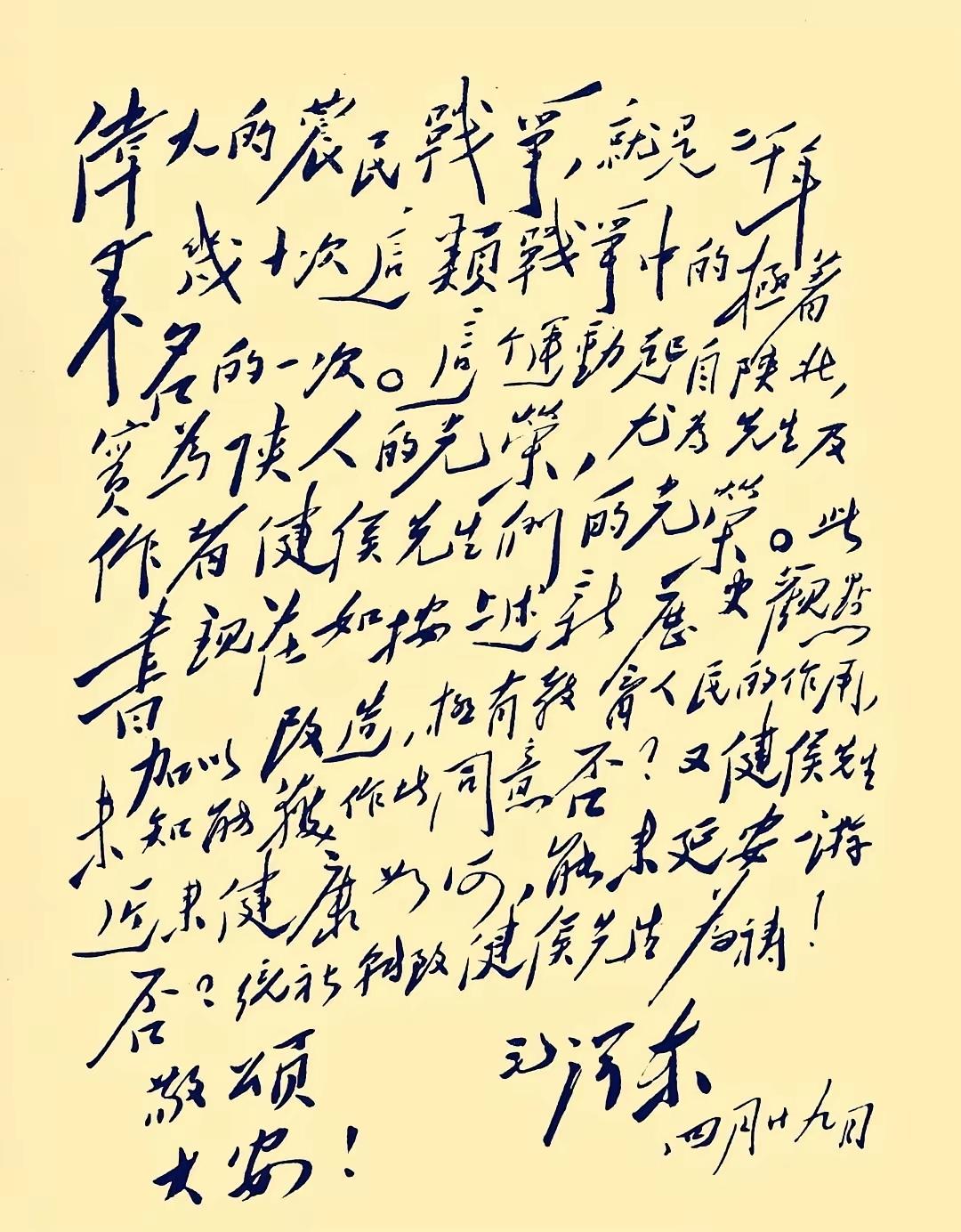 纵横捭阖,气势如虹!毛主席写给李鼎铭先生的信,字数虽多,但写的行云流水,婉若游龙,多用侧锋力重千钧,大张大合,气度非凡,字形都不大,但也有大小之对比,有的字与字字形大小对比有4倍之巨,章法上,字与字相互穿插欹让,墨色浓浓淡也有一定对比。这是毛主席上世纪三四十年代书法风格的代表作。