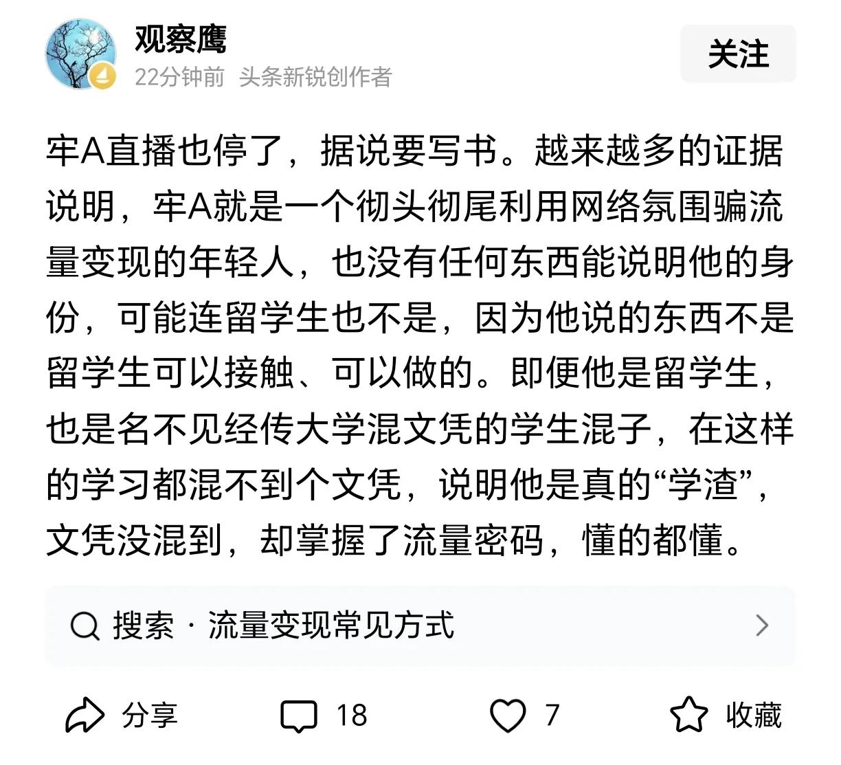 牢A的言论广泛传播出圈后。 美国政府公开回复是:斩杀线困境有的,但那都是拜登政府的错。直接甩锅了。 国内网上反对的声音是:没有斩杀线,不存在的,那是谎言,那只是极个别案例,牢A是个骗子……。疯狂否认和攻击反扑。 只能说国内网上崇洋媚外的软骨头和自带狗粮的还真不少,你们的主子都承认的事,你们却要硬说没有、继续美化主子,都活在幻想里不敢正视事实、也找不出确实的证据来反驳,只能发些没有根据的虚假言论来攻击反扑。 牢A