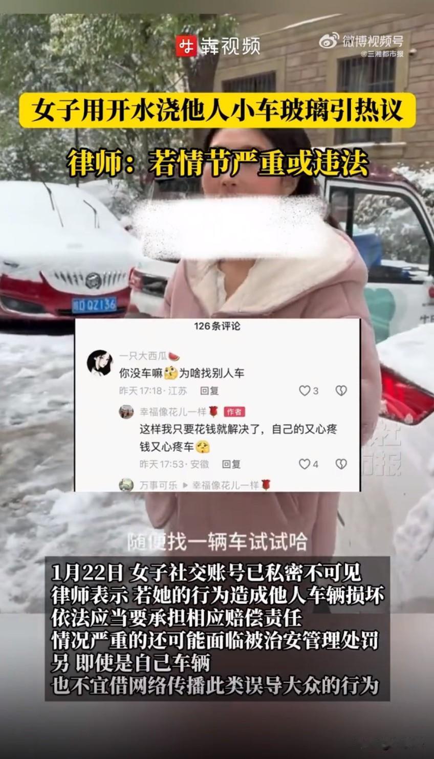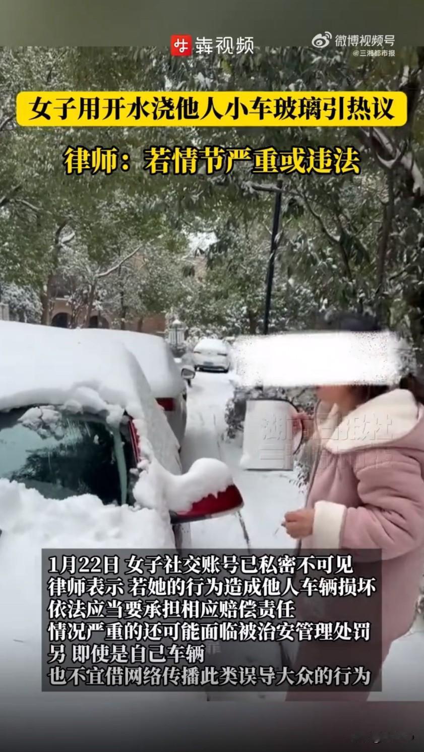 女子开水浇车玻璃做实验引众怒,澄清说辞被指毫无诚意! 最近有个事儿直接把网友气到跳脚,一位女子为了验证“开水浇结冰车玻璃会不会炸裂”,居然随手找了辆别人的车就做实验,操作离谱到让人直呼看不懂。视频里能看到,当时那辆车的挡风玻璃盖着厚厚的冰雪,女子拎着一壶刚烧开的热水,二话不说就往玻璃上浇,热水淋上去的瞬间积雪立马化开,可还没等她得意,一声清脆的“咔嚓”声就传了出来,车玻璃当场裂了缝,这段视频也跟着戛然而止。 这事一出直接炸了评论区,大伙都替那位素不相识的车主喊冤,都说这车主也太倒霉了,好好停着车招谁惹谁了,平白无故要换块车玻璃。更让人生气的是,面对网友质问,这女子居然理直气壮地说,选别人的车就是因为花钱赔了就行,要是浇自己的车,既心疼车又心疼钱。这脑回路真是让人无语,合着别人的车就不是财产,活该成她的实验品,简直是把自私俩字写在了脸上。 眼看舆论越闹越大,这女子又赶紧出来澄清,一改之前“随便找的车”的说辞,声称那其实是她妹妹的车,并不是陌生人的车。可明眼人都能看出来这话漏洞百出,前后说辞完全对不上,之前视频里她自己亲口说随便找辆车测试,现在又扯出妹妹的车,摆明了是想推卸责任,怕承担更严重的后果。不仅如此,她还悄悄删了原视频,把社交账号设成私密,想靠着装死蒙混过关,这波操作反而更让人反感。 其实稍微有点常识的人都知道,冬天车玻璃冻得冰凉,突然浇上100度的开水,妥妥的冰火两重天,炸裂是大概率的事。汽车挡风玻璃大多是钢化玻璃,最怕这种剧烈温差,外层突然受热膨胀,内层还处于低温收缩状态,内外拉扯之下,玻璃根本扛不住,轻则裂细纹,重则直接整块碎掉,就算当时没裂,内部也会留下暗伤,后续开车遇到颠簸特别容易突然碎裂,特别危险。 而且这事可不是赔钱就能了结的小事,有律师早就说了,这种故意损坏他人财物的行为,不光要全额赔偿修车费,还得承担车辆贬值费、车主修车期间的代步费,要是情节严重,还得受治安处罚,万一修车费用够了立案标准,甚至可能触犯法律吃官司。就算真如她所说那是妹妹的车,未经同意就这么折腾,也照样说不过去,更别提她把错误示范发上网,很可能误导其他人跟风模仿,造成更多损失。 本来是个人人都该知道的生活常识,非要用损人不利己的方式去验证,验证错了还不敢担责,又是删视频又是瞎澄清,既没常识又没担当,也难怪会被全网吐槽。说到底,不管是做实验还是满足好奇心,都得有底线,不能把自己的一时兴起,建立在别人的损失和风险之上。 来源:三湘都市报