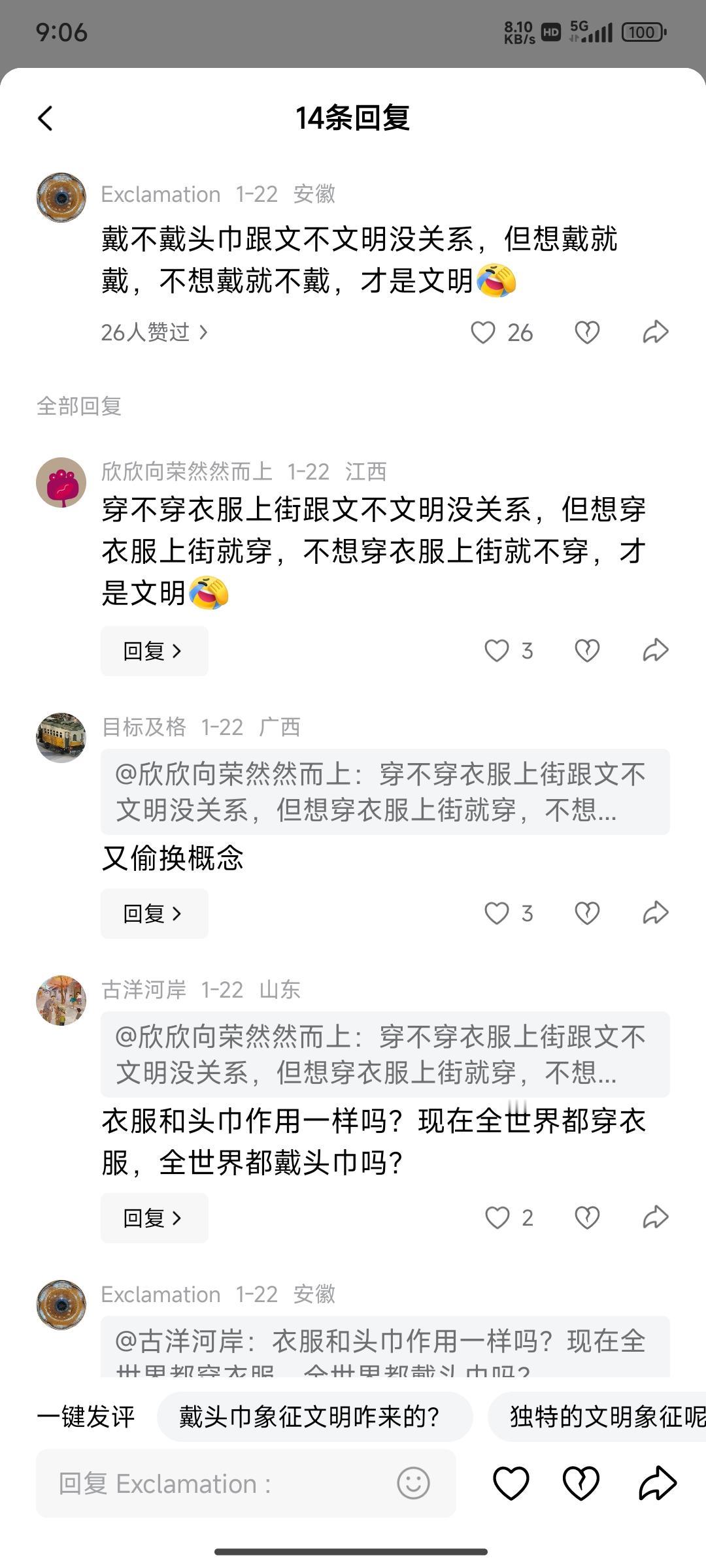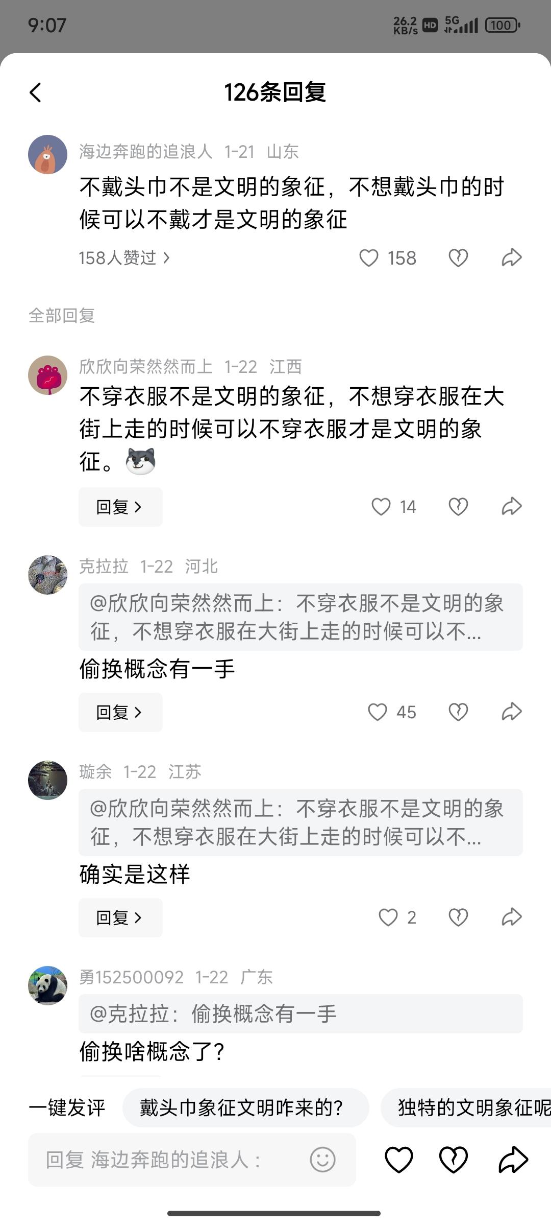 殖人又虚空画靶,正常中国人可不会觉得带头巾是文明的象征。看来看去,殖人追求的自由,永远是向下的自由。它们对穿衣自由的追求永远是可以上街不穿。