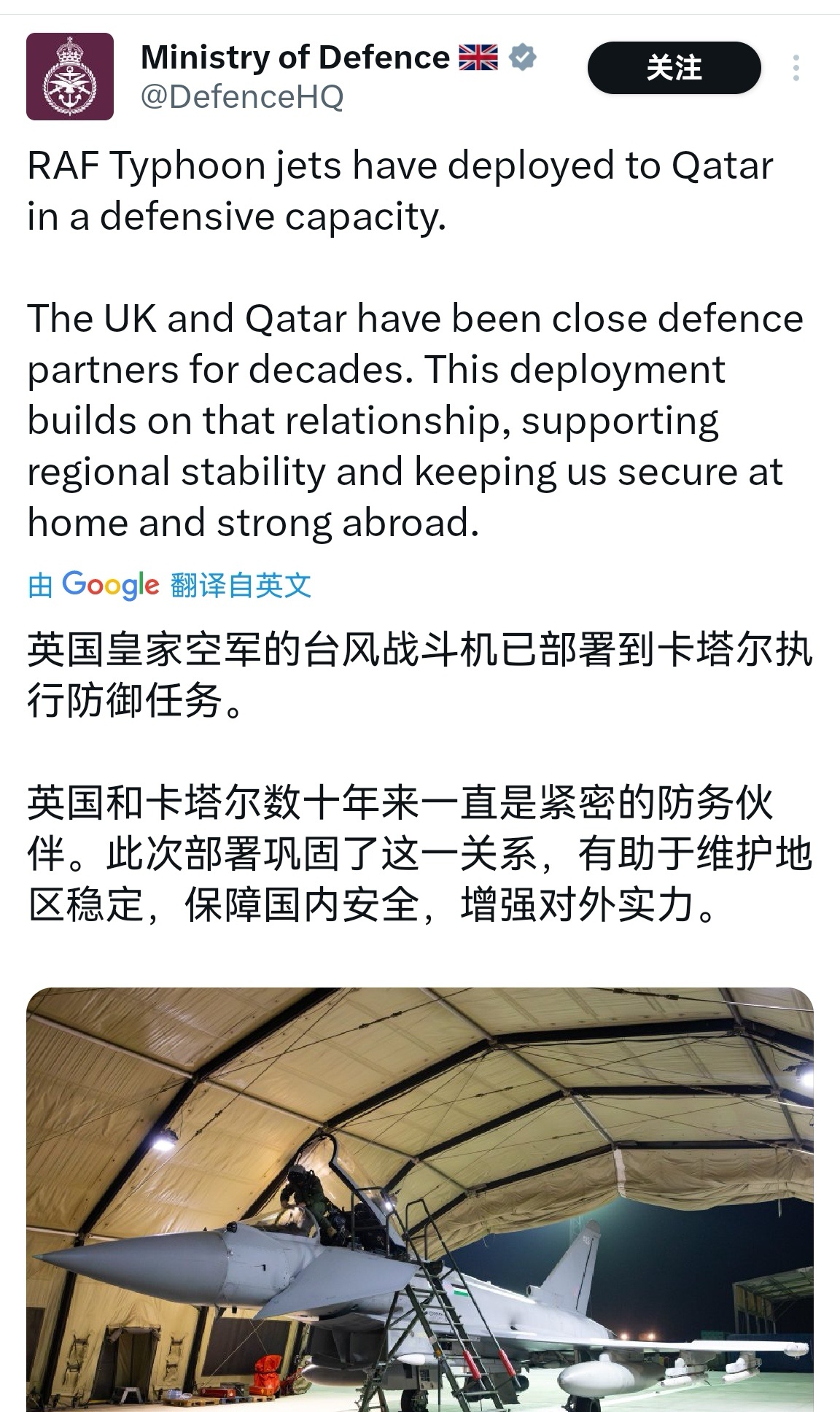🔻英国皇家空军向卡塔尔乌代德空军基地转场了第12中队的多架台风战斗机。🔻大英真是喜欢到处搞事啊,现在这种可能中东基地要吃伊朗导弹的时候都往里塞飞机。特朗普为啥时隔一天态度变了热点现场