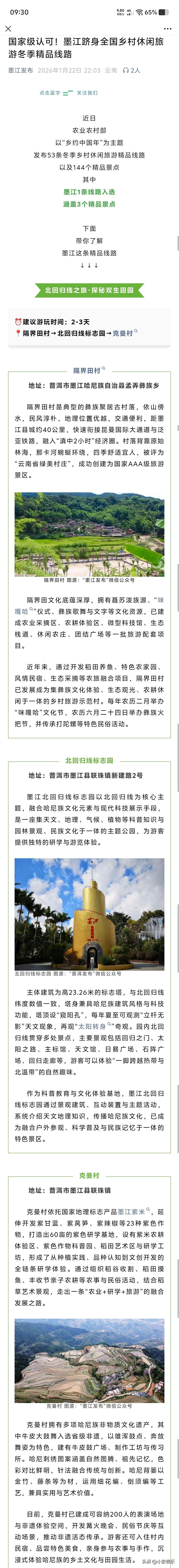 “恭喜”云南普洱墨江县。农业农村部最近搞了一批全国乡村休闲旅游冬季精品线路,墨江的“北回归线之旅·探秘双生田园”这条线成功入选,它包含隔界田村、北回归线标志园、克曼村这三个景点,玩个2-3天正好。非常适合旅居和来南方过冬的朋友。