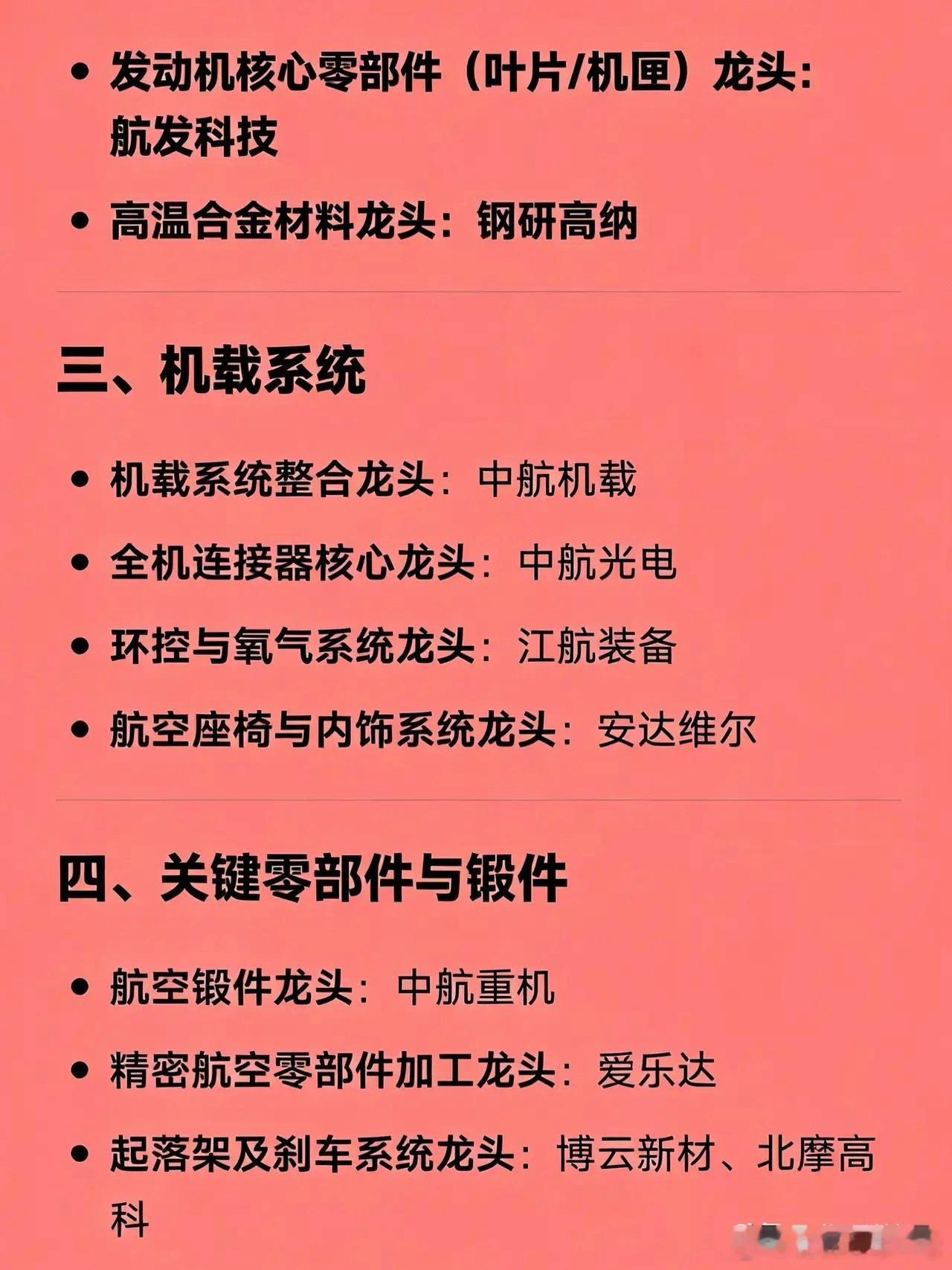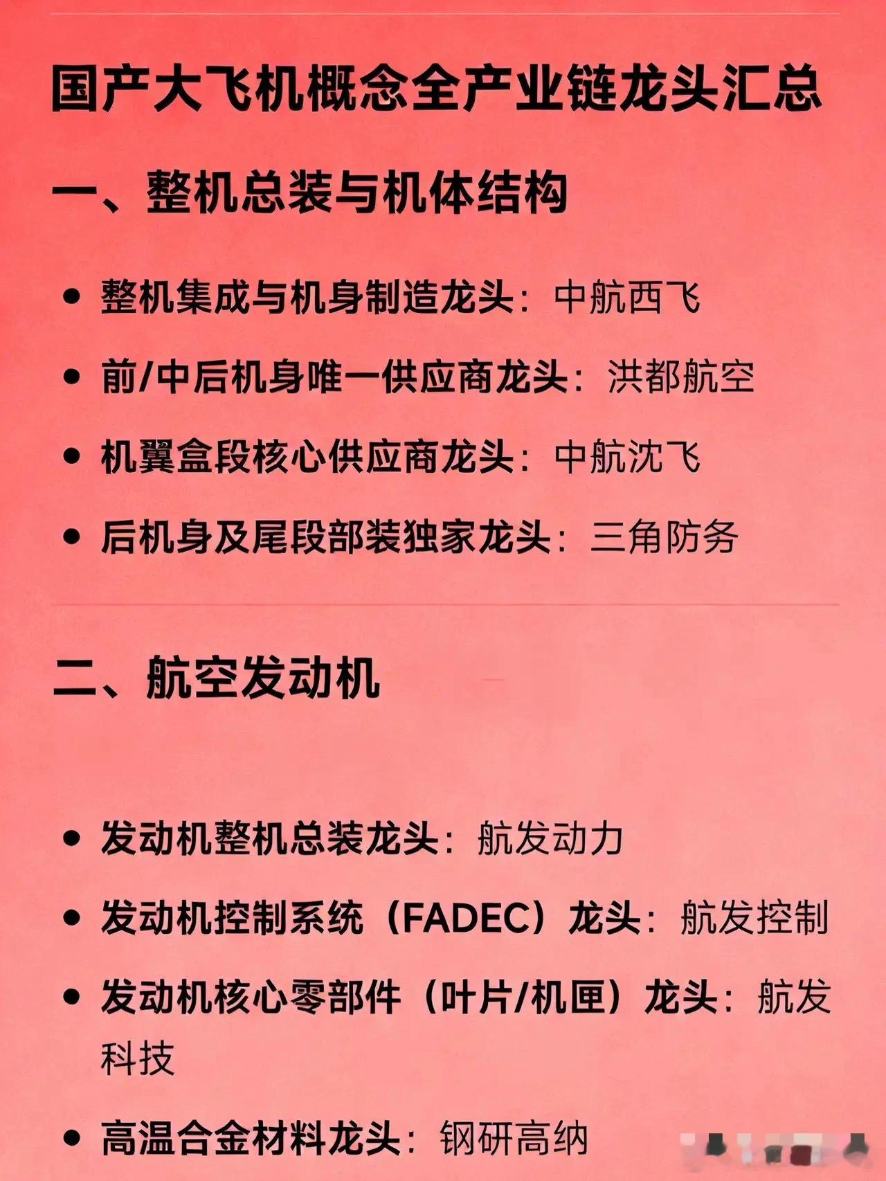 国产大飞机概念全产业链龙头汇总一、整机总装与机体结构整机集成与机身制造龙头:中航西飞前/中后机身唯一供应商龙头:洪都航空机翼盒段核心供应商龙头:中航沈飞后机身及尾段部装独家龙头:三角防务 二、航空发动机发动机整机总装龙头:航发动力发动机控制系统(FADEC)龙头:航发控制发动机核心零部件(叶片/机匣)龙头:航发科技高温合金材料龙头:钢研高纳 三、机载系统机载系统整合龙头:中航机载全机连接器核心龙头:中航光电环控与氧气系统龙头:江航装备航空座椅与内饰系统龙头:安达维尔 四、关键零部件与锻件航空锻件龙头:中航重机精密航空零部件加工龙头:爱乐达起落架及刹车系统龙头:博云新材、北摩高科 五、关键材料航空钛材绝对龙头:宝钛股份高端钛合金材料龙头:西部超导航空复合材料龙头:中航高科、光威复材航空铝合金结构件龙头:南山铝业 六、运营与维修服务C919主力运营商龙头:中国东航航空维修与保障服务龙头:航新科技、海特高新