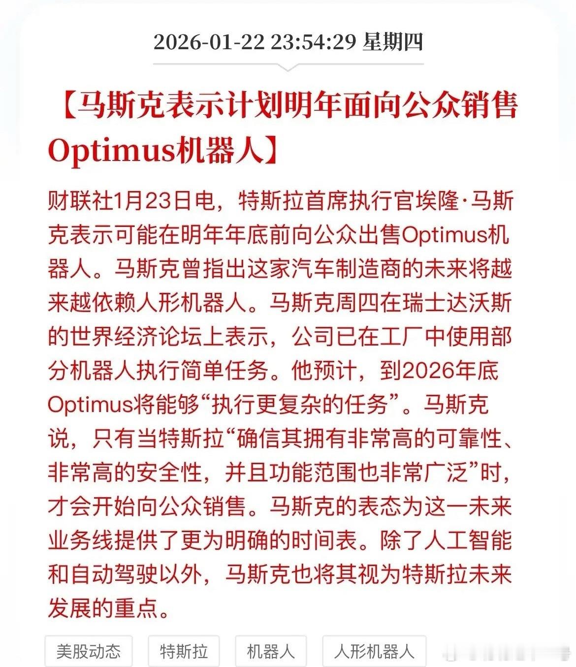 “马年”概念股“马斯克”概念再刷新:特斯拉机器人Potimus计划明年年底销售。 明年年底? 现在2026年1月23日,明年年底意味着2027年年底。 按照目前老美的生产能力和效率,延期那是很正常的,对于年底的预期稍微推迟一点就到了2028年。所以说马斯克的话属于“概念股”范畴,因为真的是停留在概念层面,但是估计这一点也不影响A股机器人板块资金的发挥。