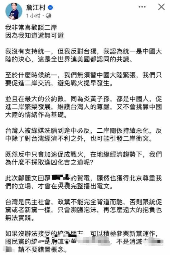 22日,国民党议员詹江村发文称,岛内任何一个政党,跟大陆谈统一,就不能执政,新党